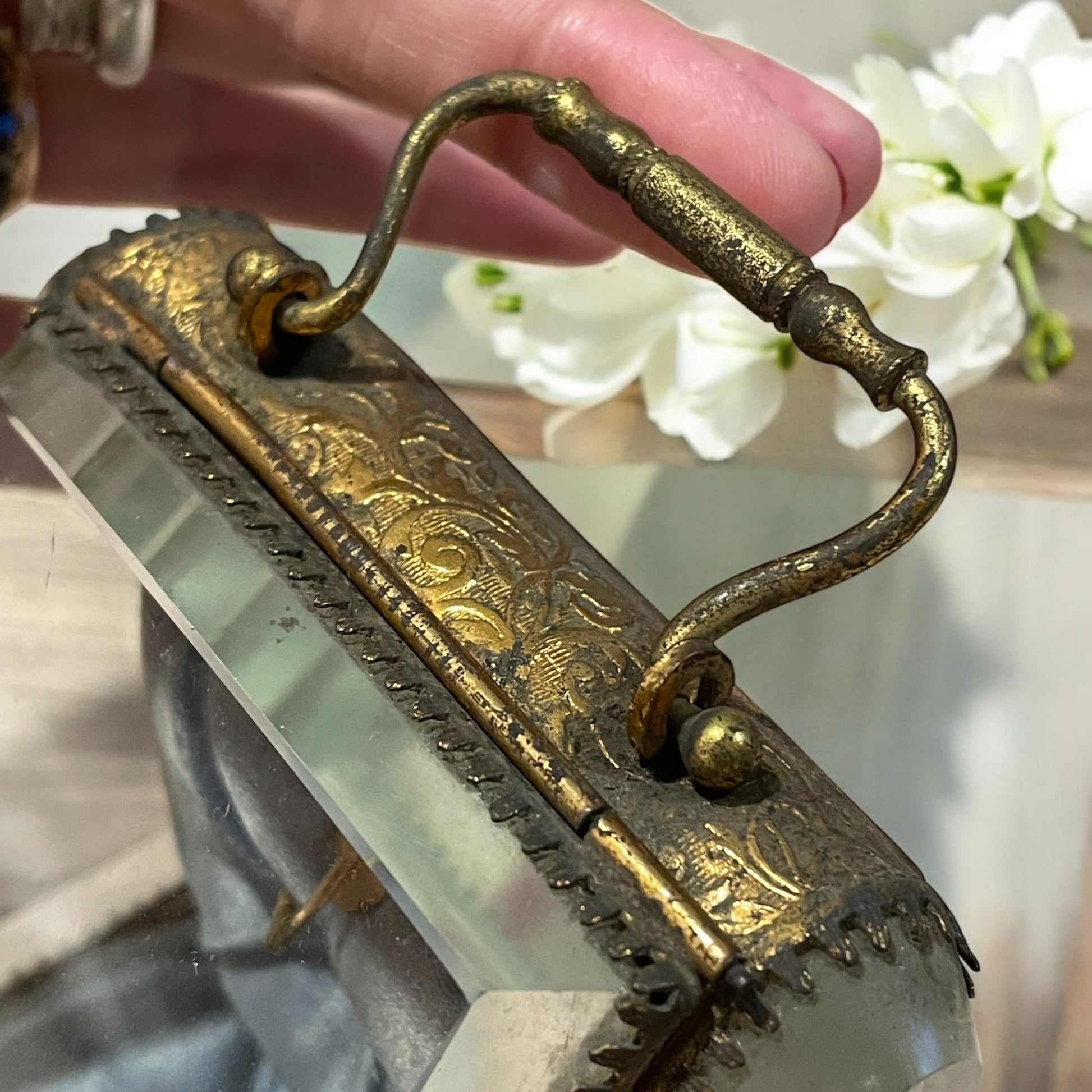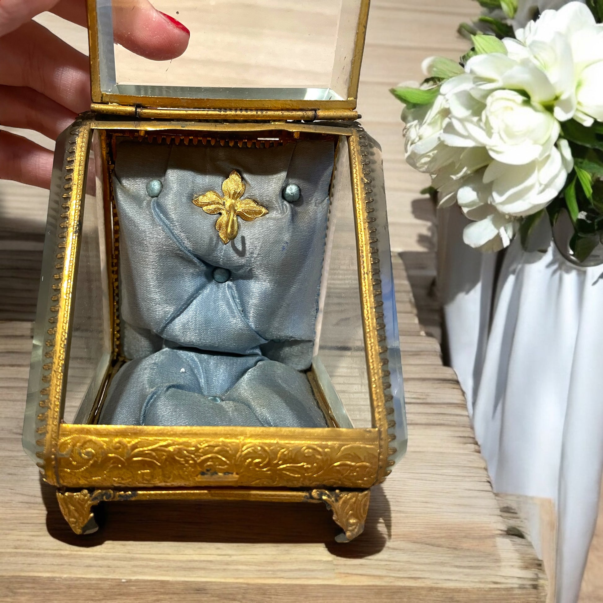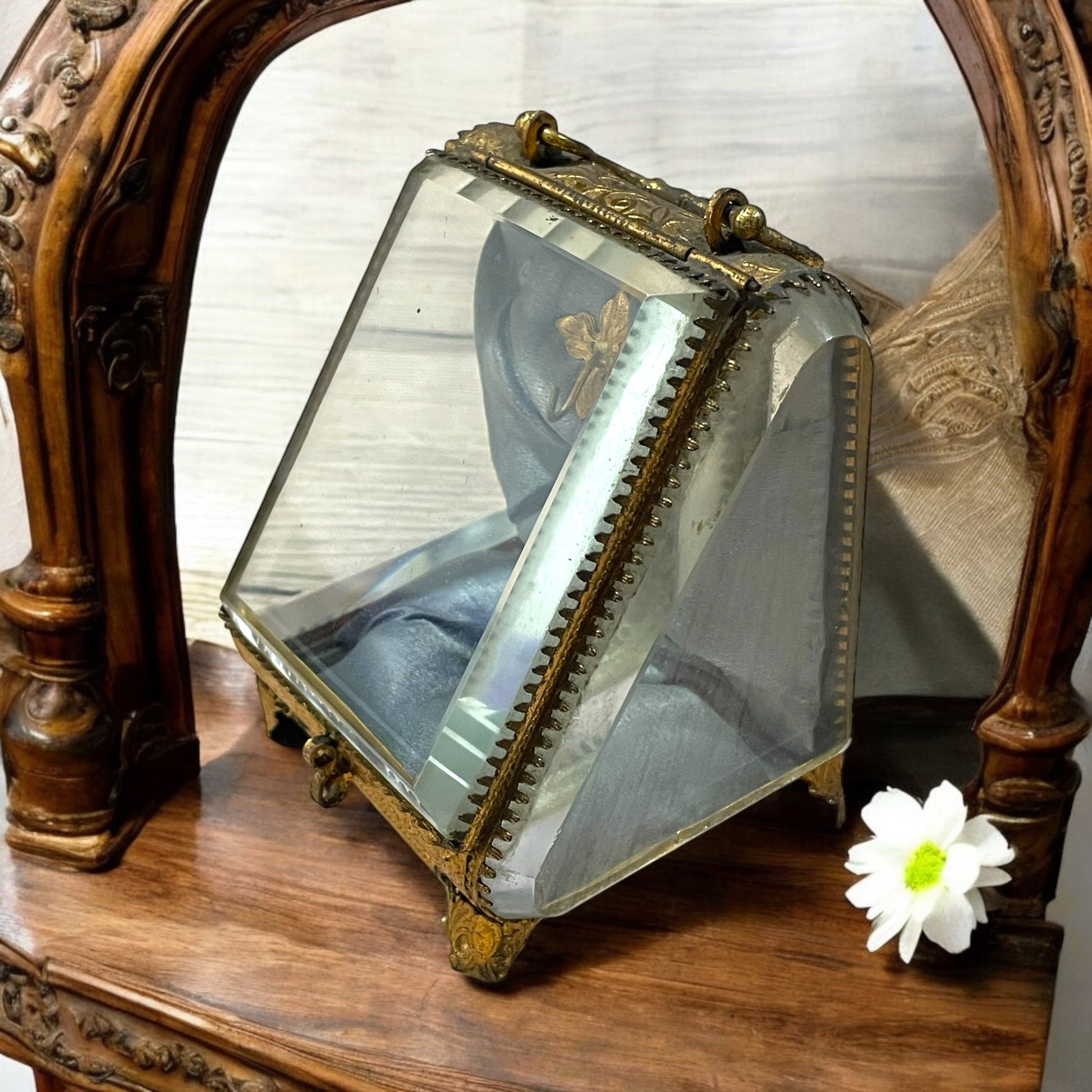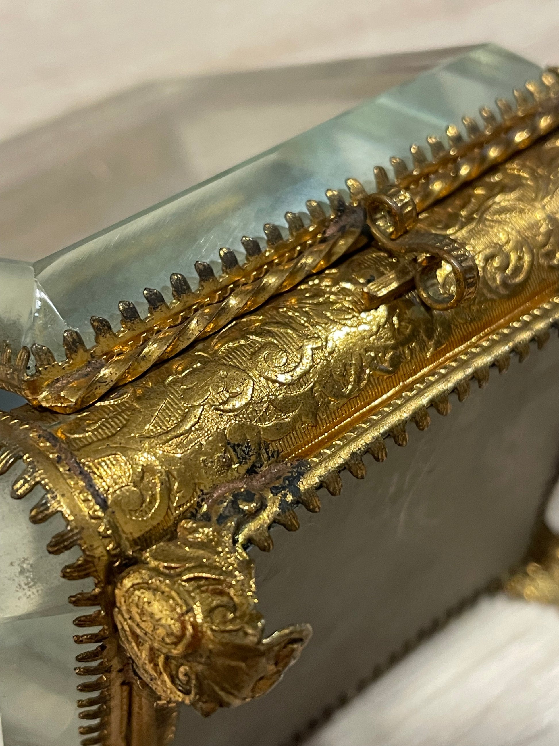 Materiali: vetro molato, ottone dorato, interno in raso imbottito