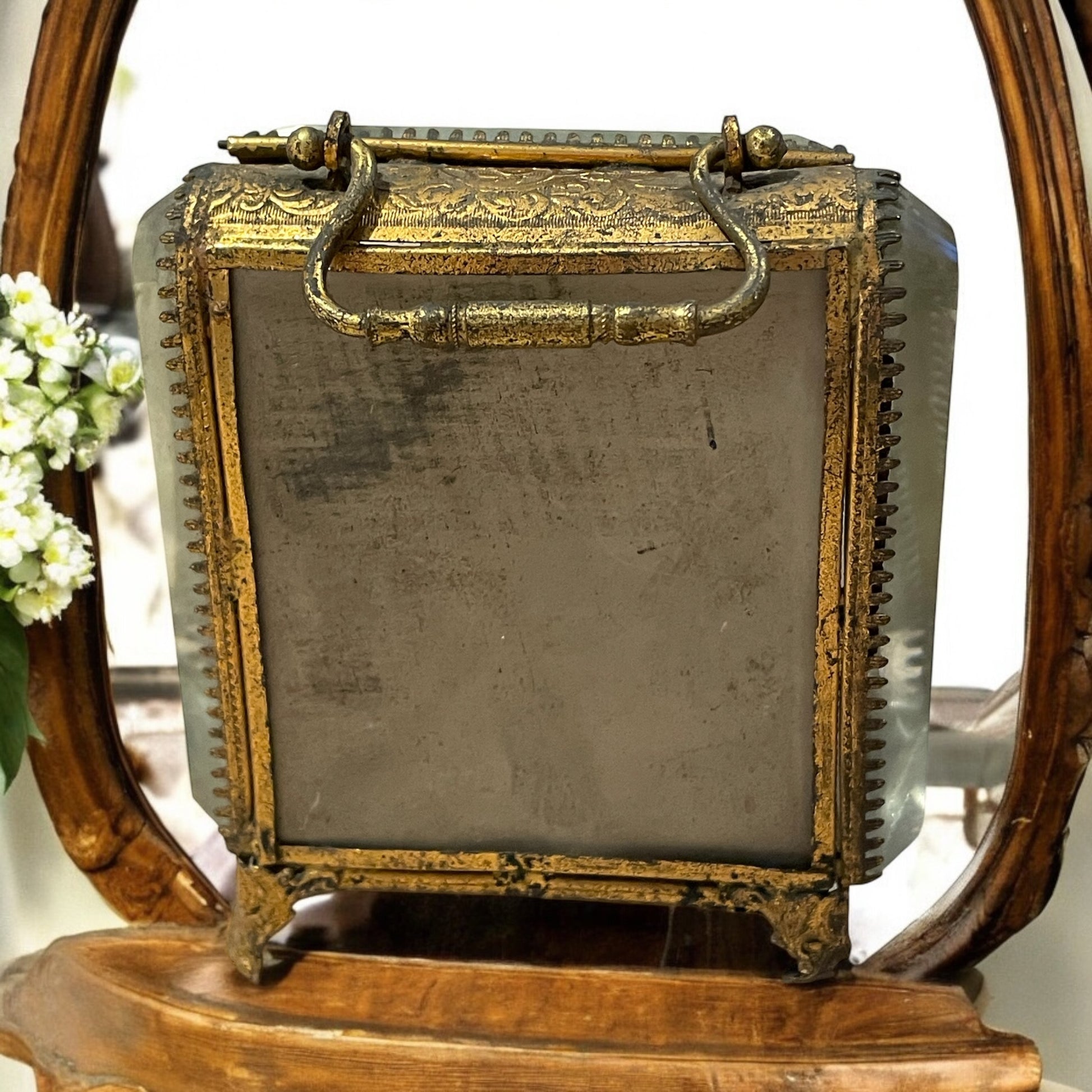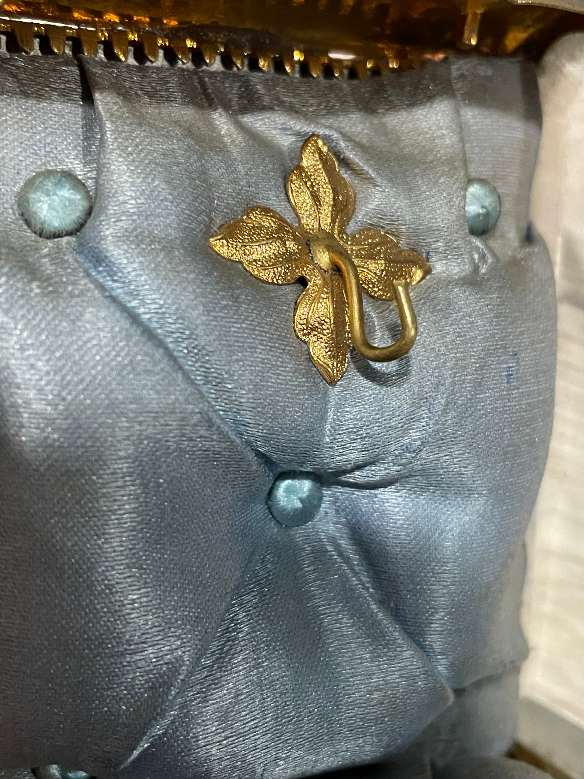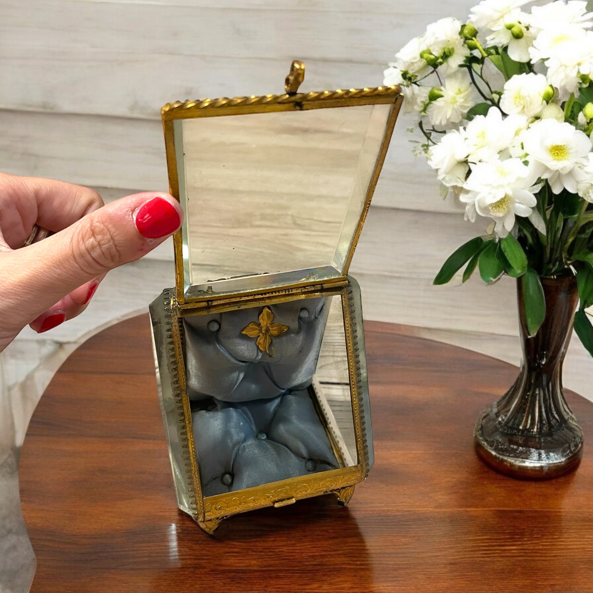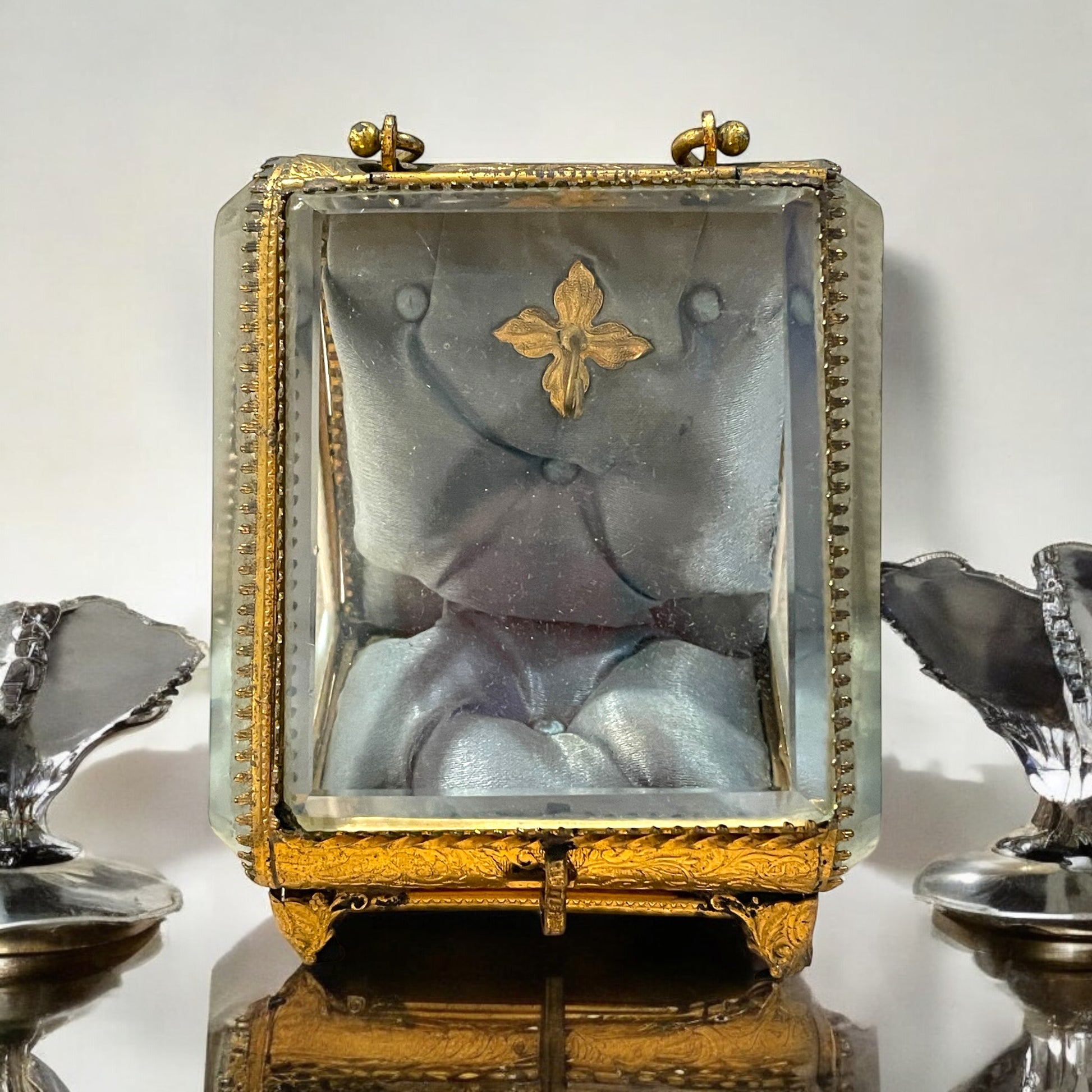 Materiali: vetro molato, ottone dorato, interno in raso imbottito
