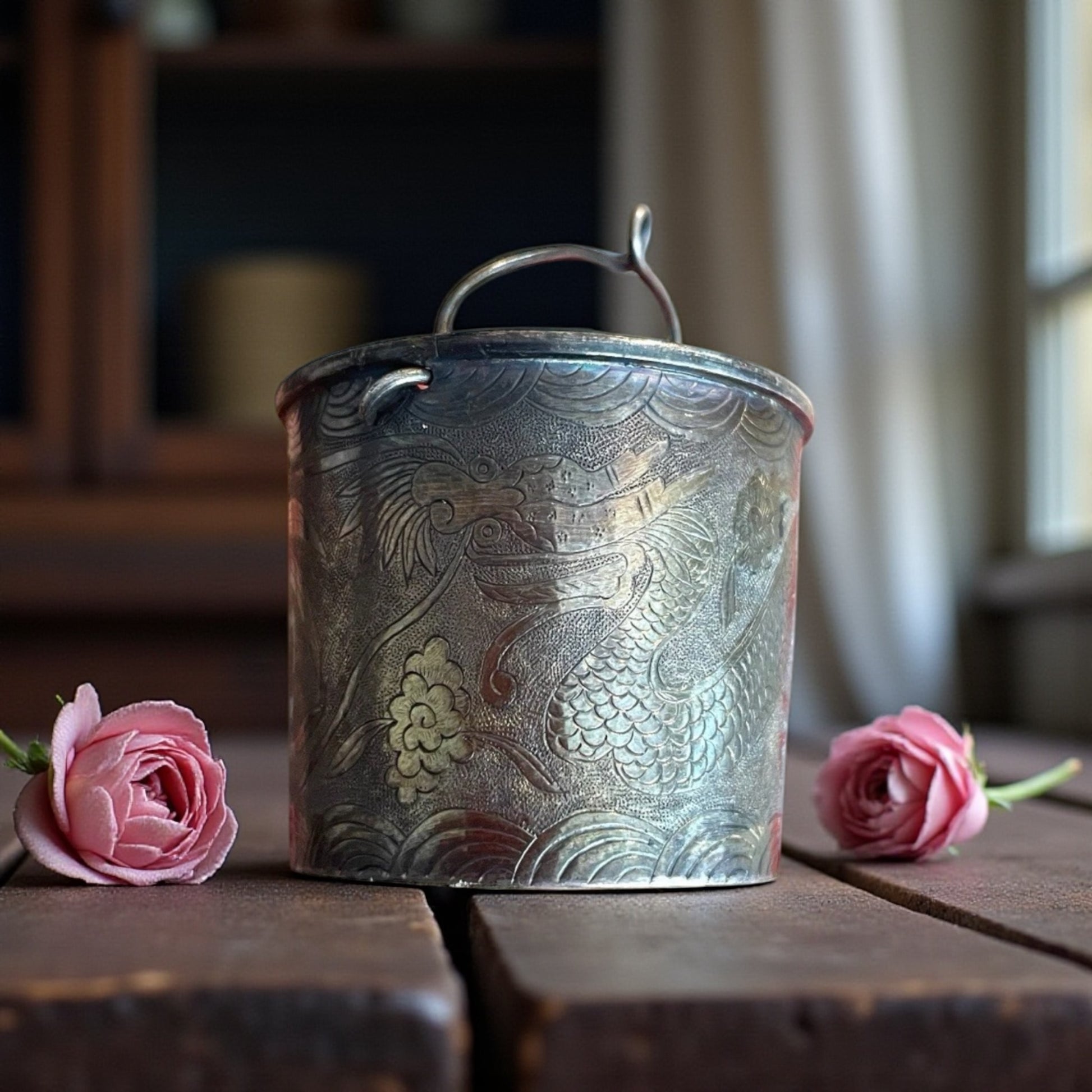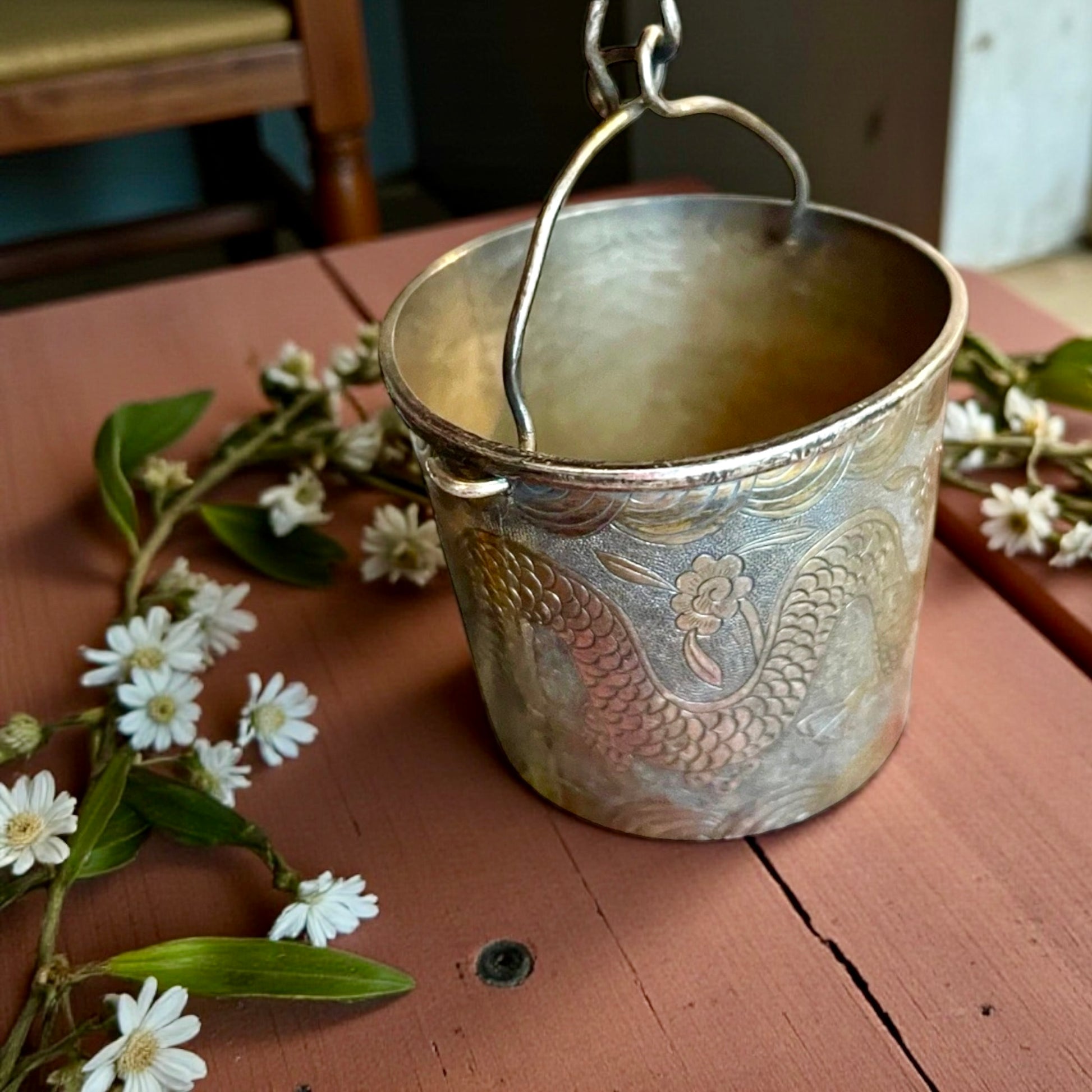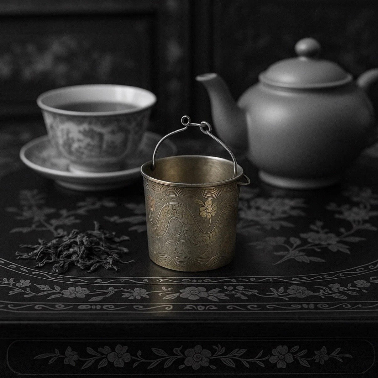 Non filtra solo il tè: filtra il tempo. C’è una creatura incisa sull’argento che accompagna questo gesto lento. Non è un drago aggressivo, ma un fenghuang, la fenice orientale: simbolo di armonia, equilibrio e raffinatezza. Il suo corpo sinuoso segue il profilo del colino come se vegliasse sul momento esatto in cui l’acqua calda incontra le foglie. Un gesto quotidiano che, grazie a questo oggetto, diventa rituale. Questo colino da tè in argento pieno, di manifattura orientale tra fine Ottocento e primo Novecento, nasce per l’uso reale: fori calibrati, struttura solida, manico pensato per essere sospeso con grazia sopra la tazza. Non è un oggetto che chiede di essere guardato. È un oggetto che chiede tempo. E l’incisione non è certo casuale: del resto la bevanda del tè assume un significato rituale molto importante in molte culture e il gesto stesso dell’infusione implica il concetto di trasformazione delle foglie in bevanda. Una chicca estremamente raffinata.