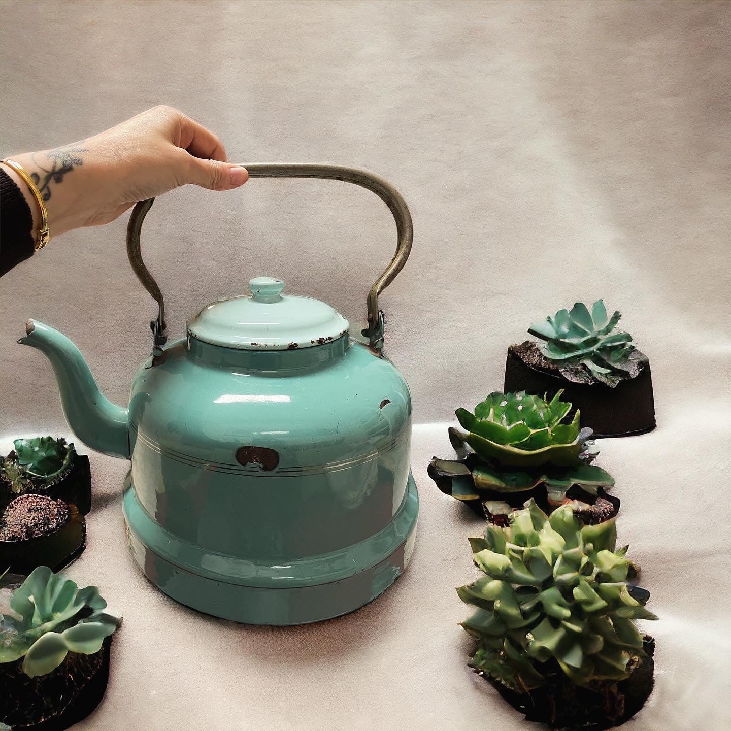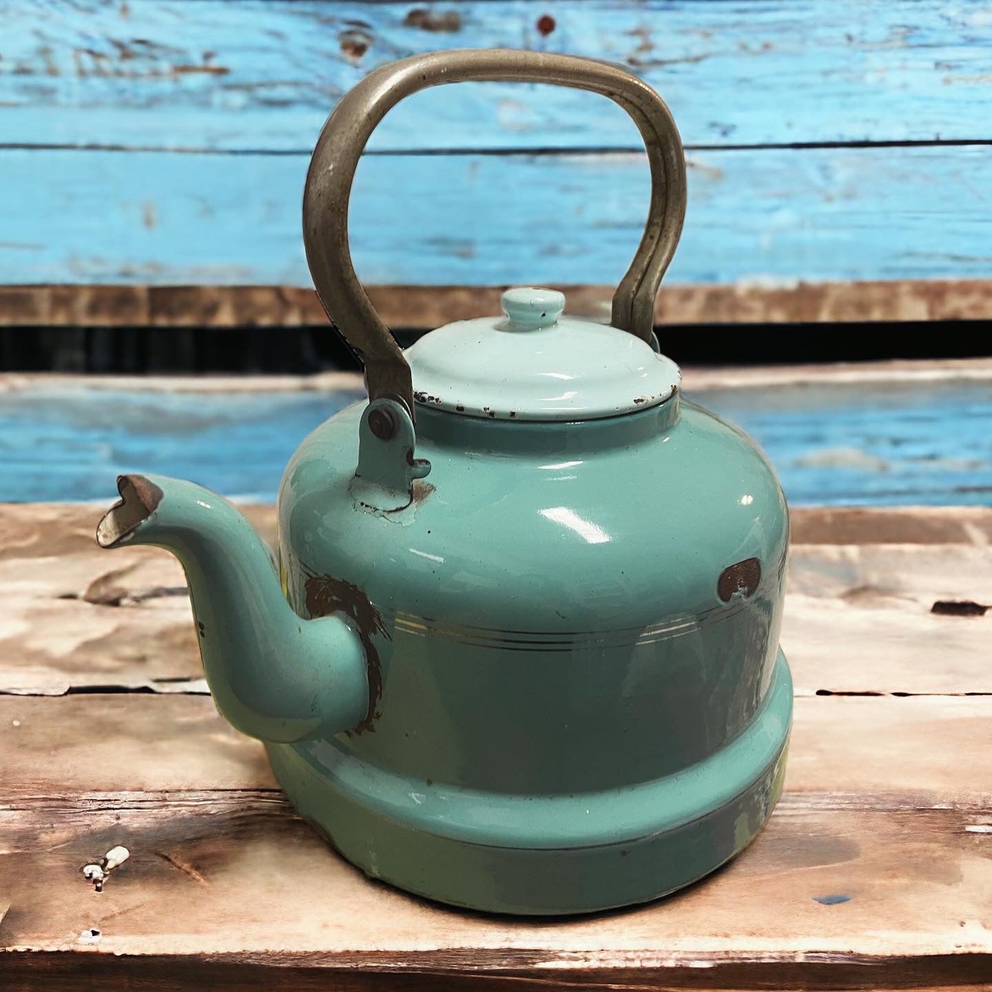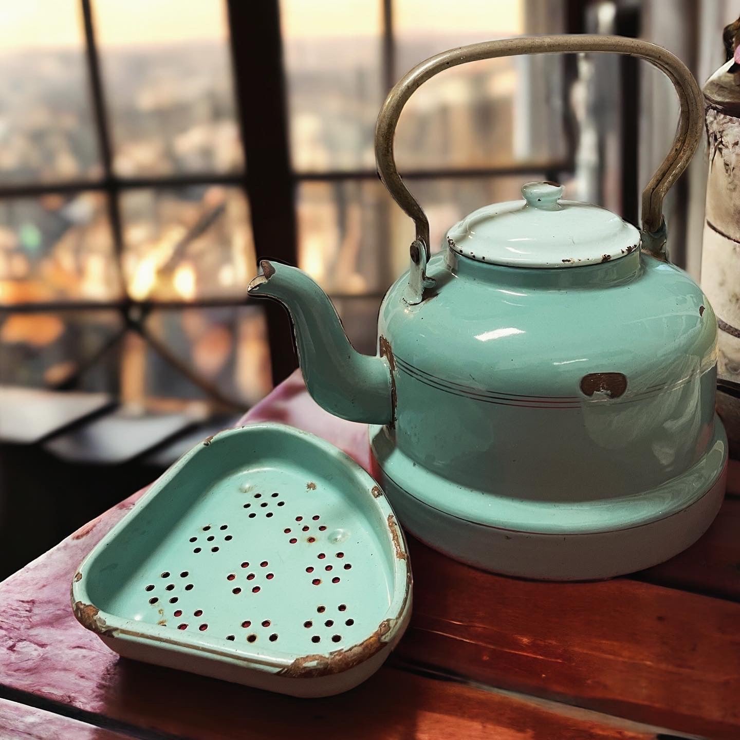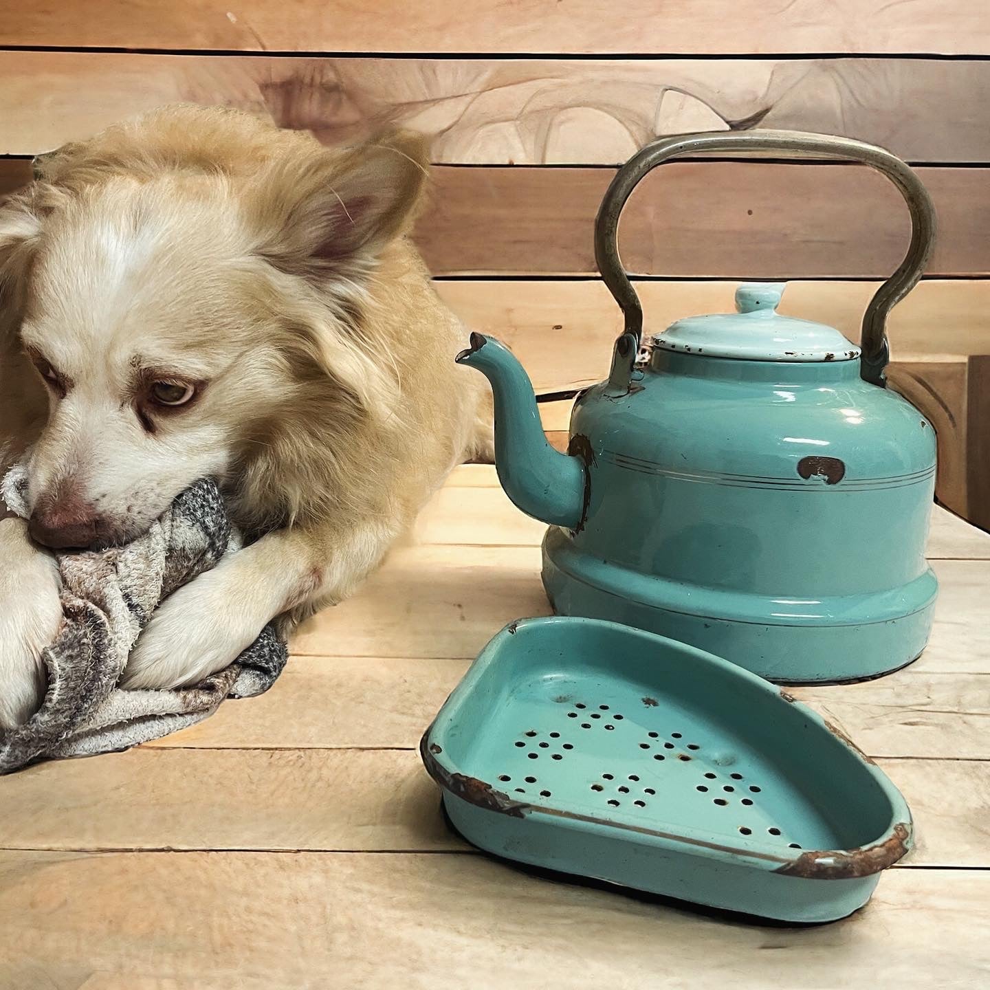 Our dog wants to help us prepare tea… with this huge antique kettle, enameled in a wonderful shade of aquamarine, a romantic and unobtainable color, complete with its large enameled strainer. It is 28 wide with the spout, 32 high with the handle, diameter 24 cm. This is always the collection from the farm of the previous posts; which will await you with new surprises 👀👀