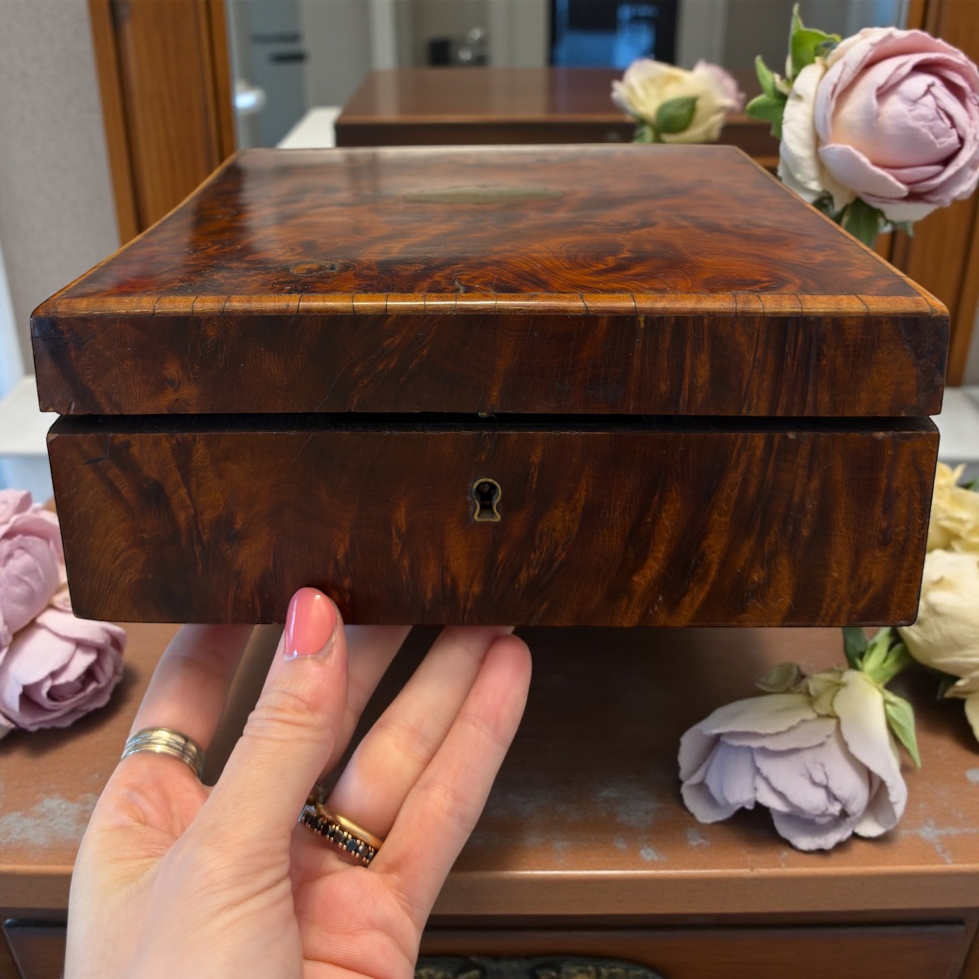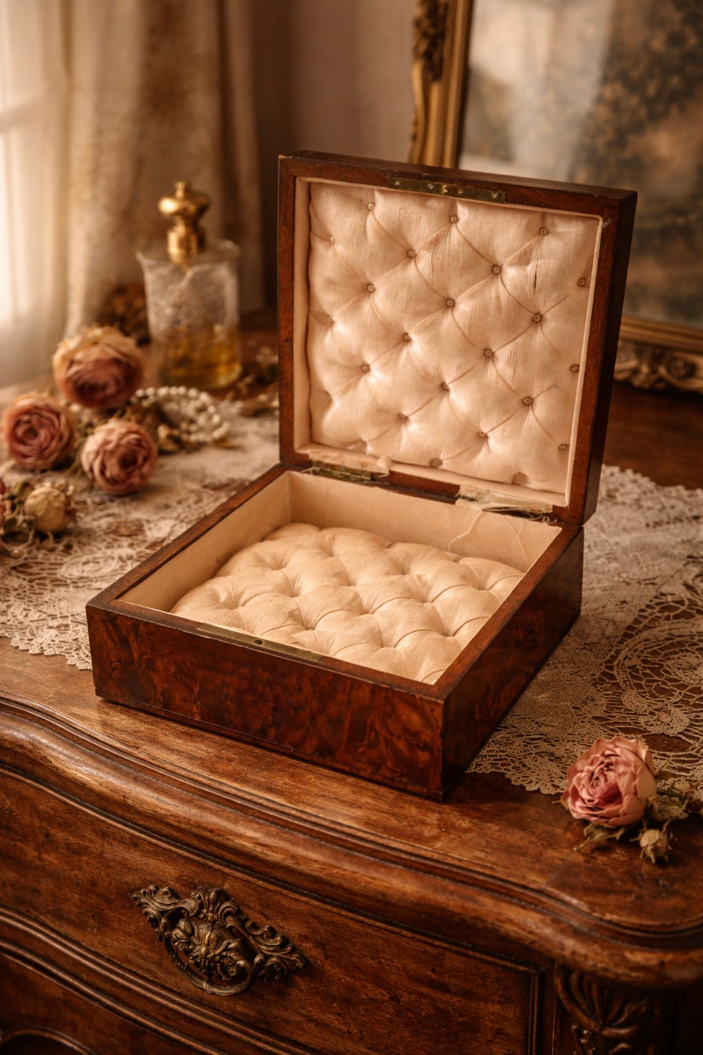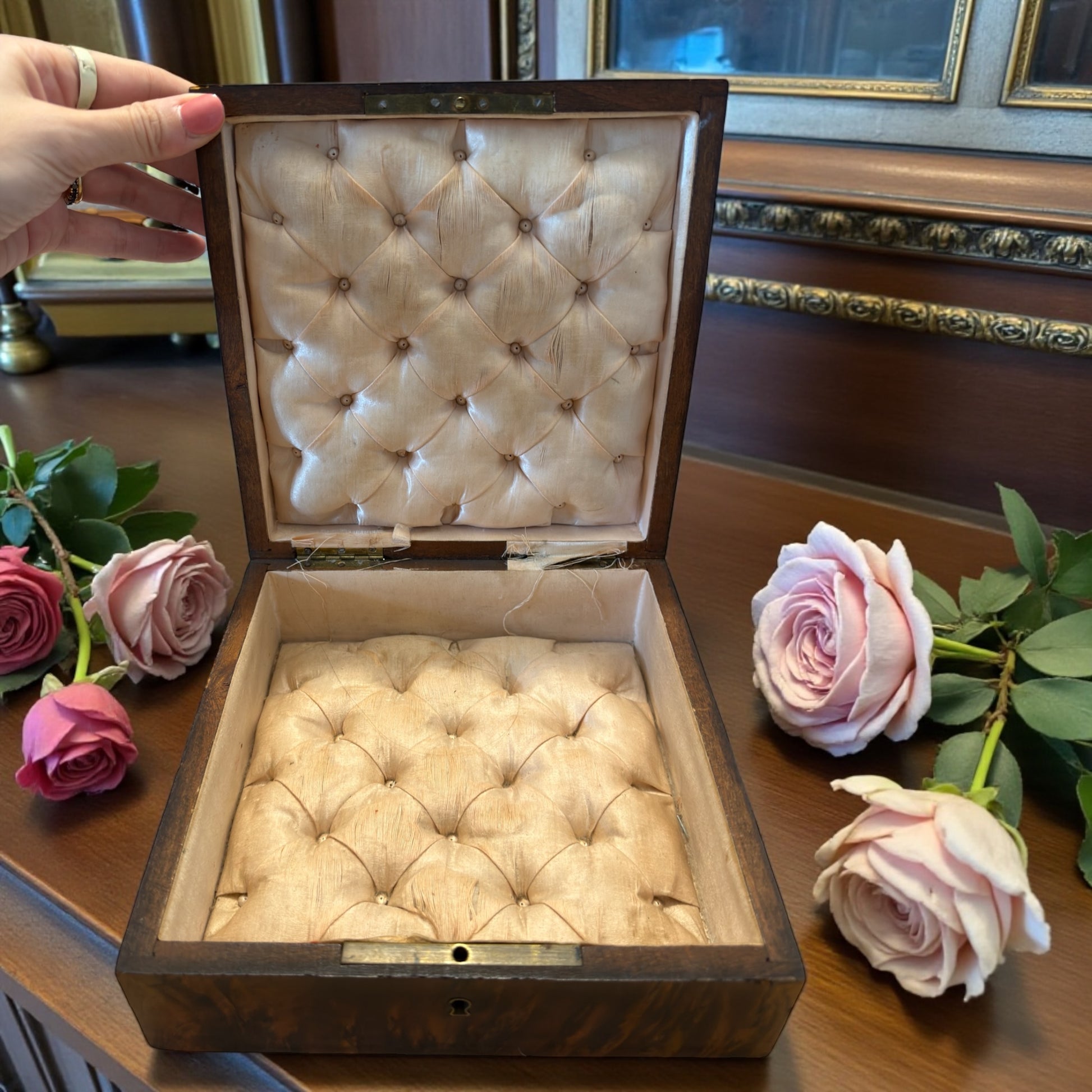 Ci sono oggetti che non si aprono: si svelano. Questo scrigno in radica di noce, quadrata e solida, sembra quasi trattenere un segreto. La superficie è un vortice naturale di venature profonde, calde, vive. Ogni nodo racconta una storia diversa, come se il legno avesse custodito memoria prima ancora di diventare forma. Poi sollevi il coperchio. E l’atmosfera cambia. L’interno in capitoné rosa cipria, morbido e luminoso, accoglie lo sguardo con una delicatezza inattesa. È un contrasto sottile, quasi emotivo: fuori compostezza borghese, dentro intimità femminile. La placca frontale, pensata per un monogramma mai inciso (o forse cancellato dal tempo), lascia spazio all’immaginazione. Era un dono? Un regalo di nozze? Una promessa?