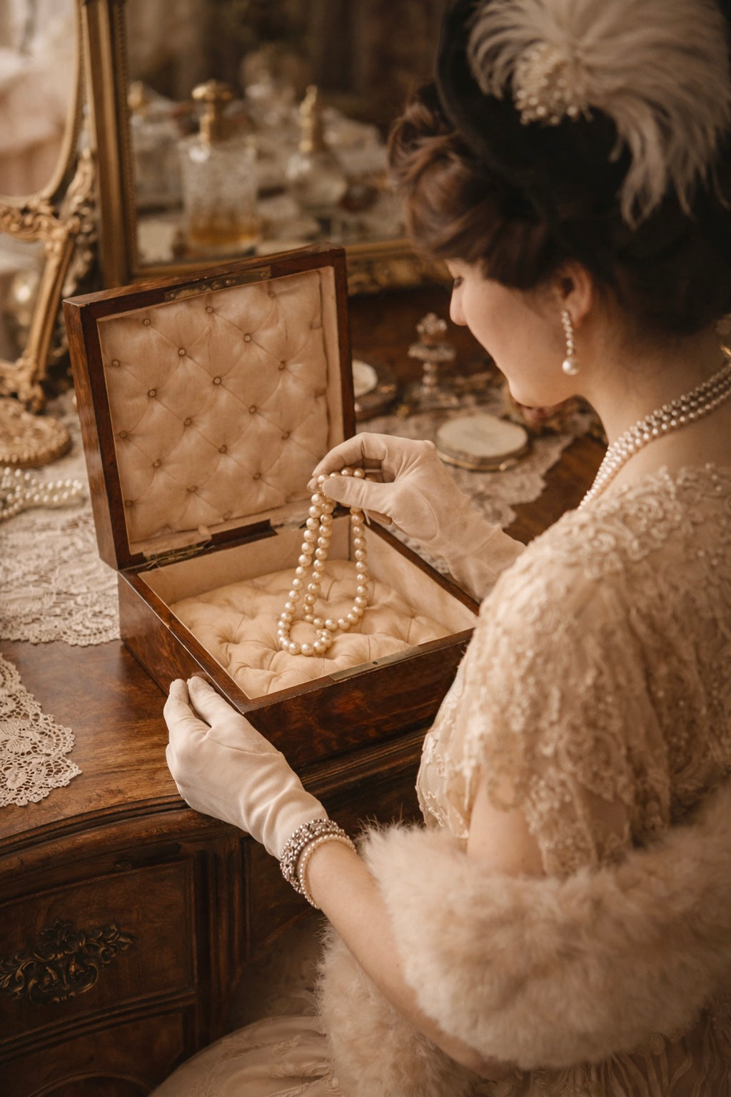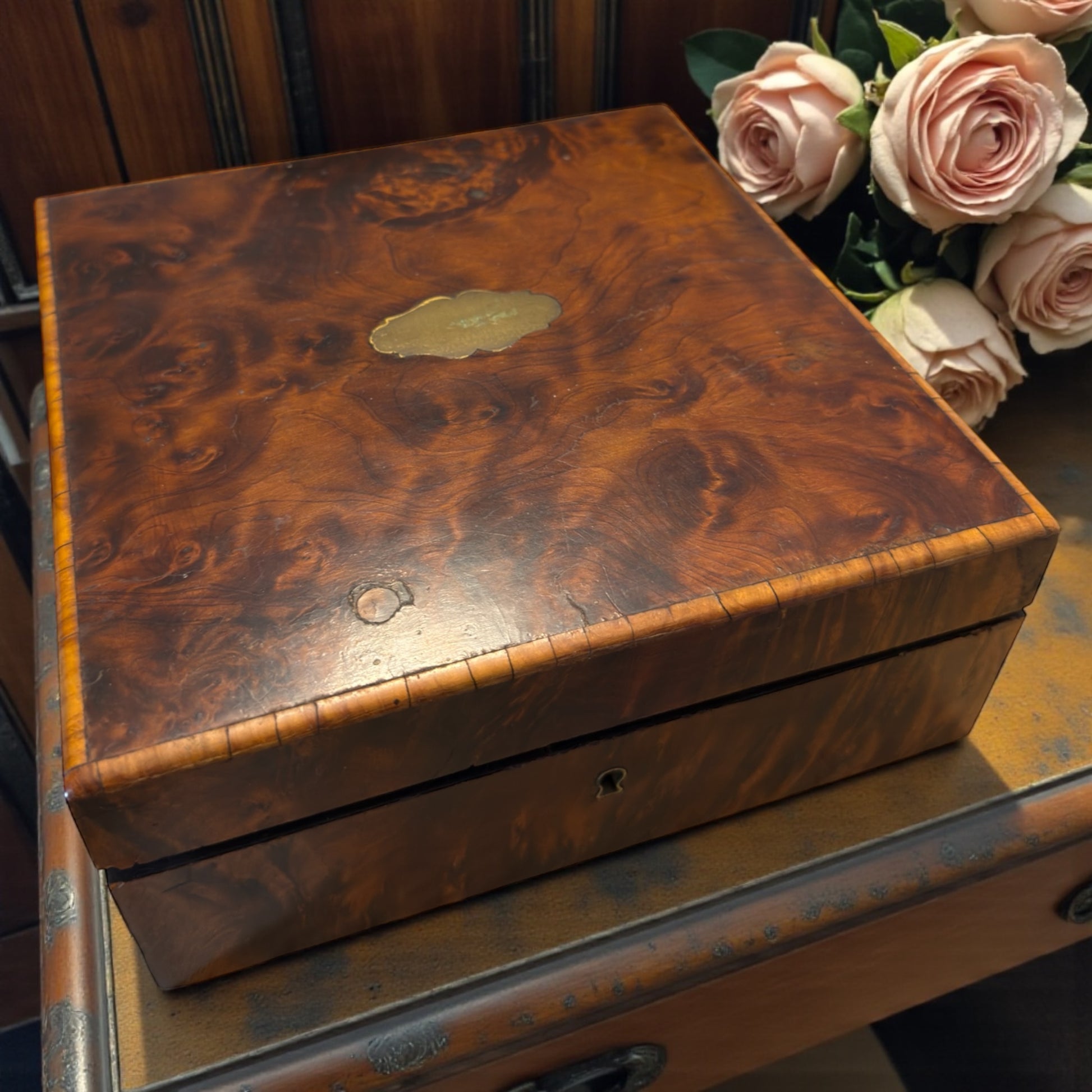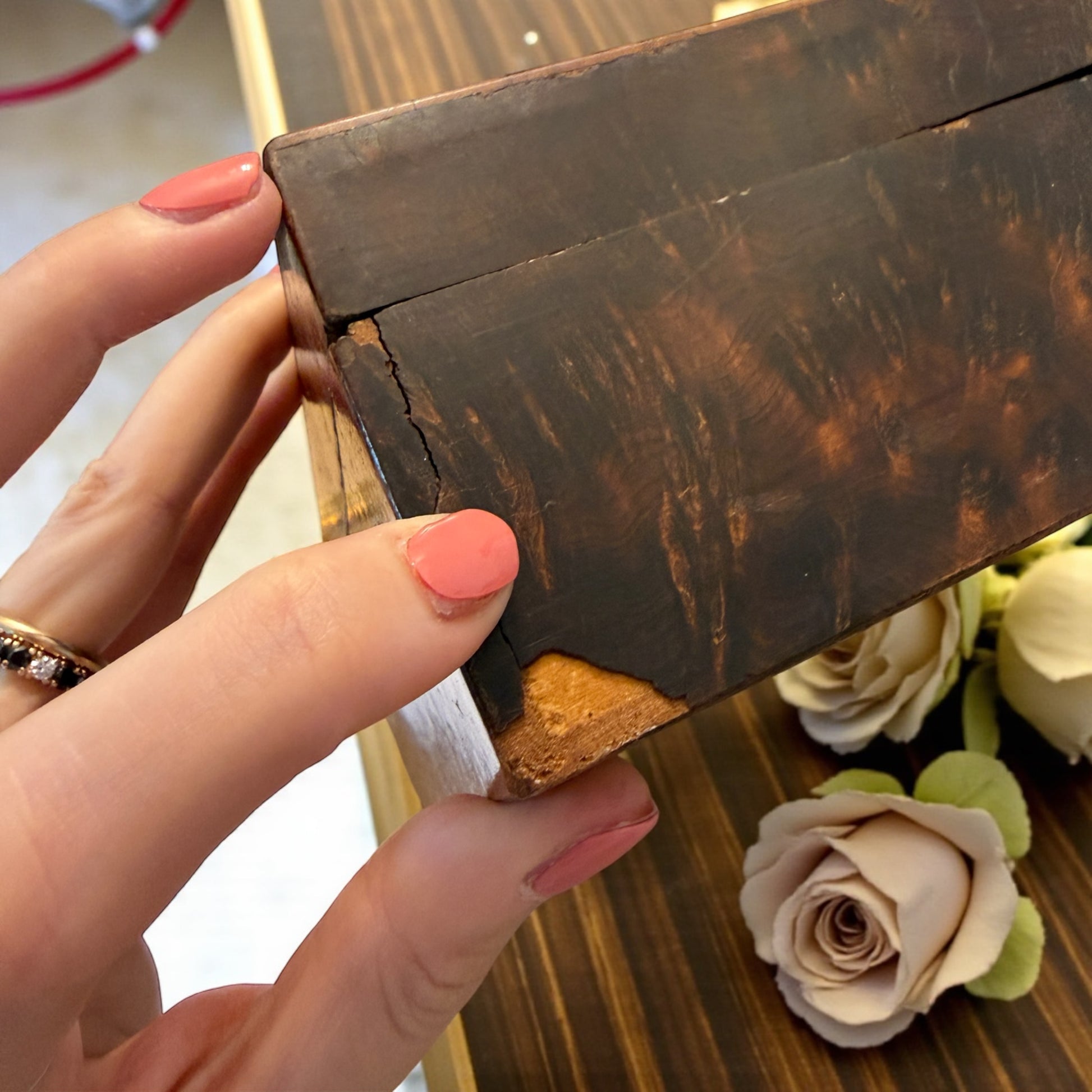 Ci sono oggetti che non si aprono: si svelano. Questo scrigno in radica di noce, quadrata e solida, sembra quasi trattenere un segreto. La superficie è un vortice naturale di venature profonde, calde, vive. Ogni nodo racconta una storia diversa, come se il legno avesse custodito memoria prima ancora di diventare forma. Poi sollevi il coperchio. E l’atmosfera cambia. L’interno in capitoné rosa cipria, morbido e luminoso, accoglie lo sguardo con una delicatezza inattesa. È un contrasto sottile, quasi emotivo: fuori compostezza borghese, dentro intimità femminile. La placca frontale, pensata per un monogramma mai inciso (o forse cancellato dal tempo), lascia spazio all’immaginazione. Era un dono? Un regalo di nozze? Una promessa?