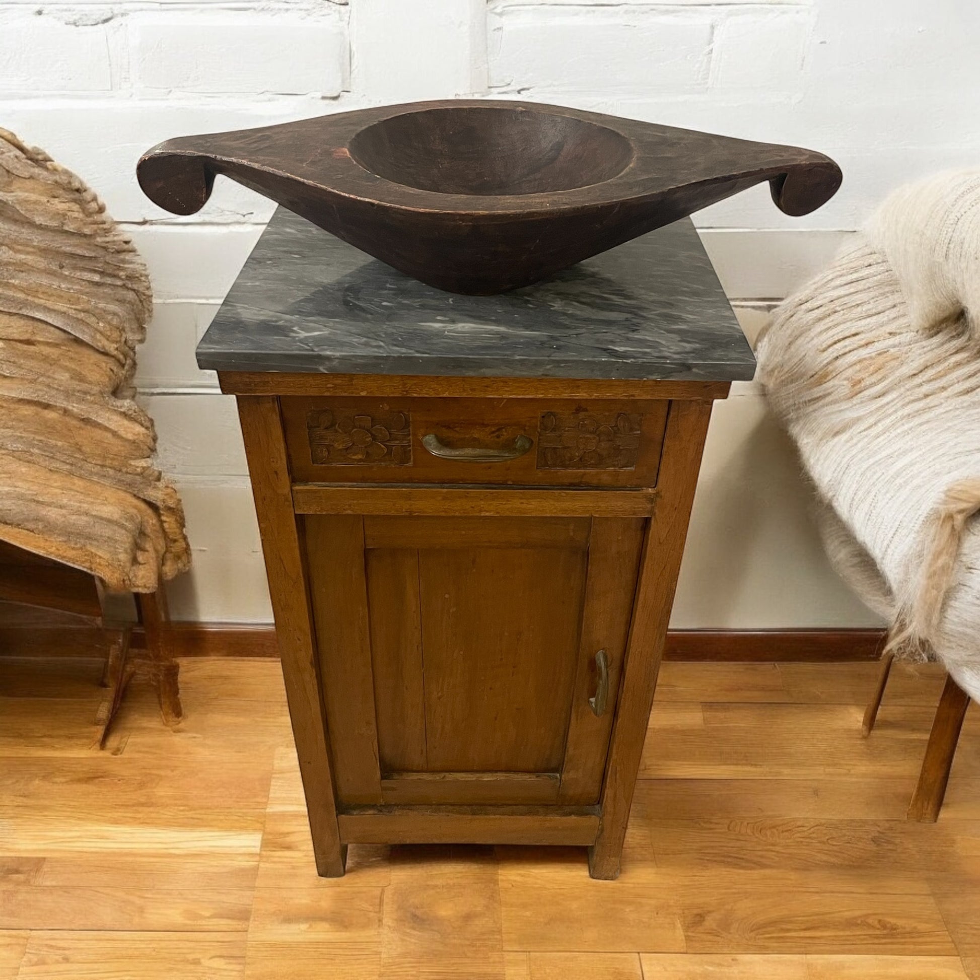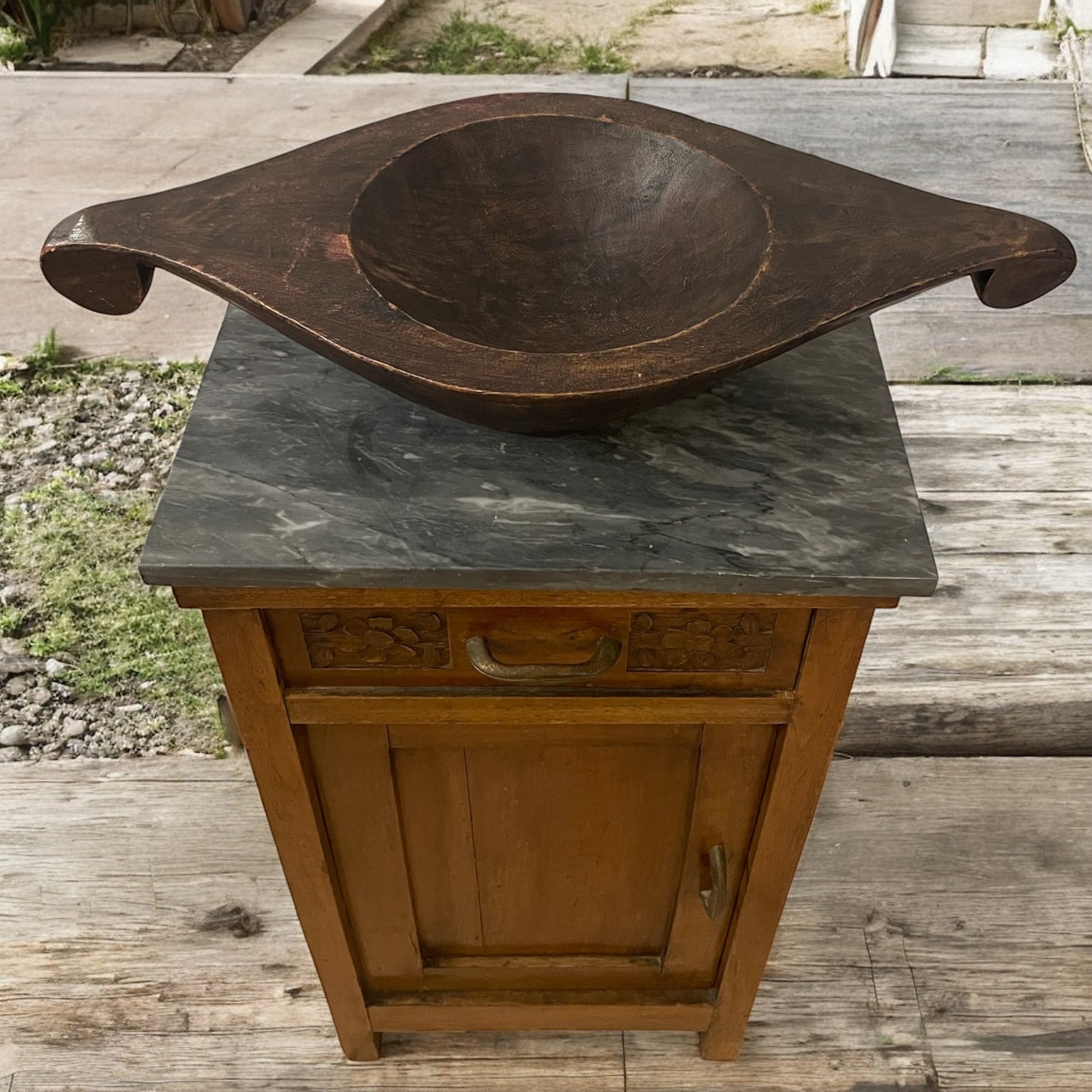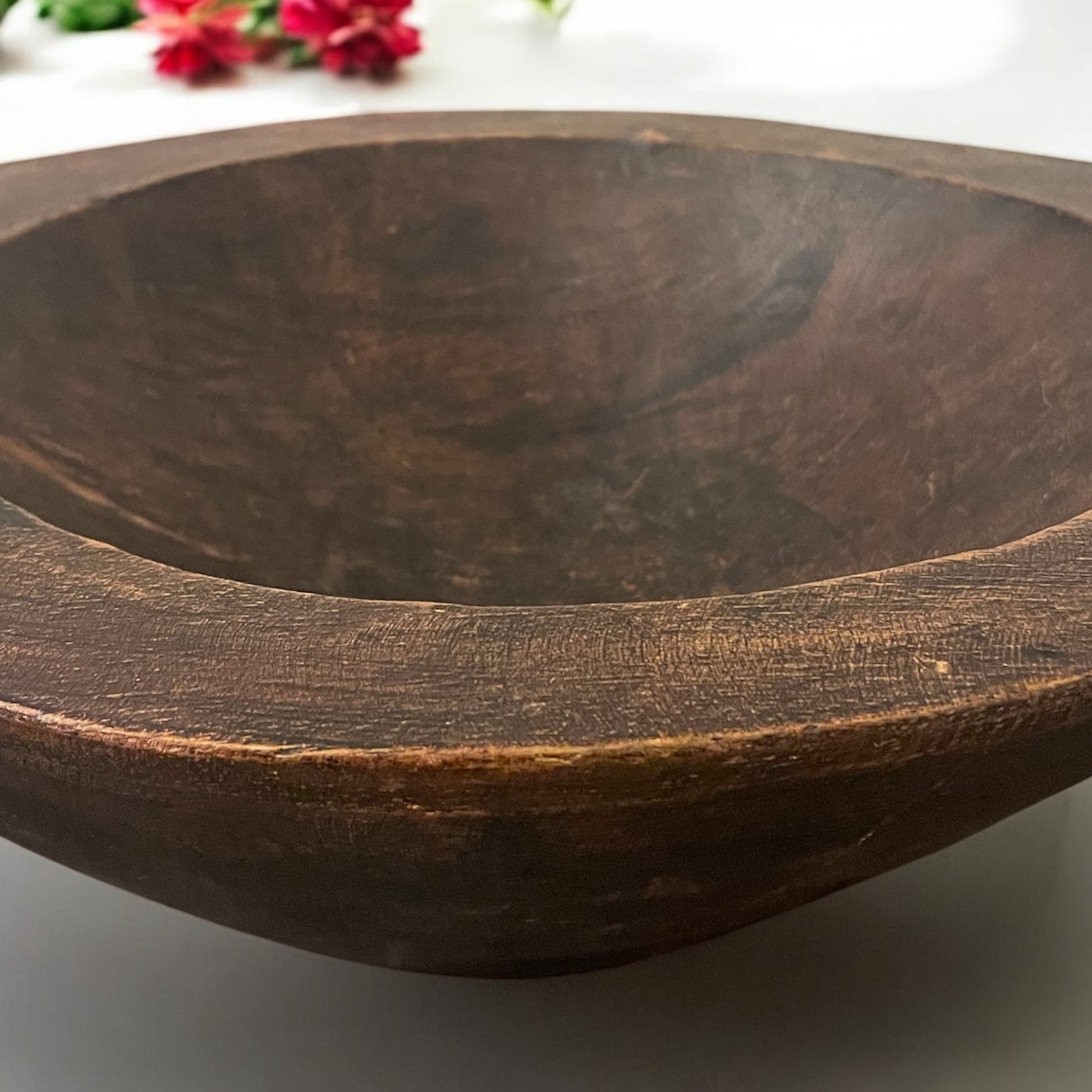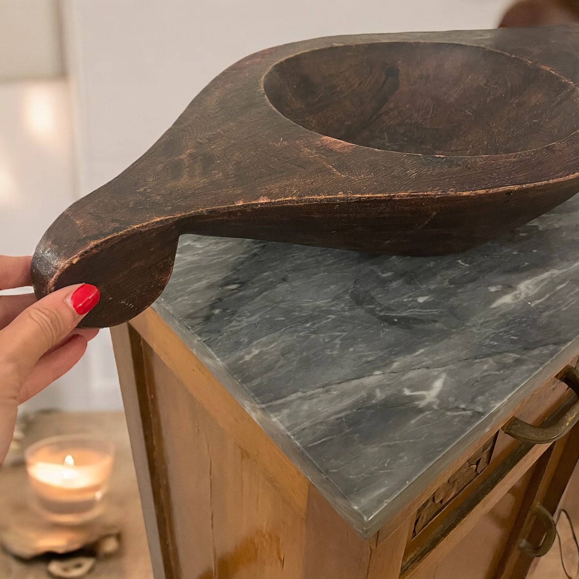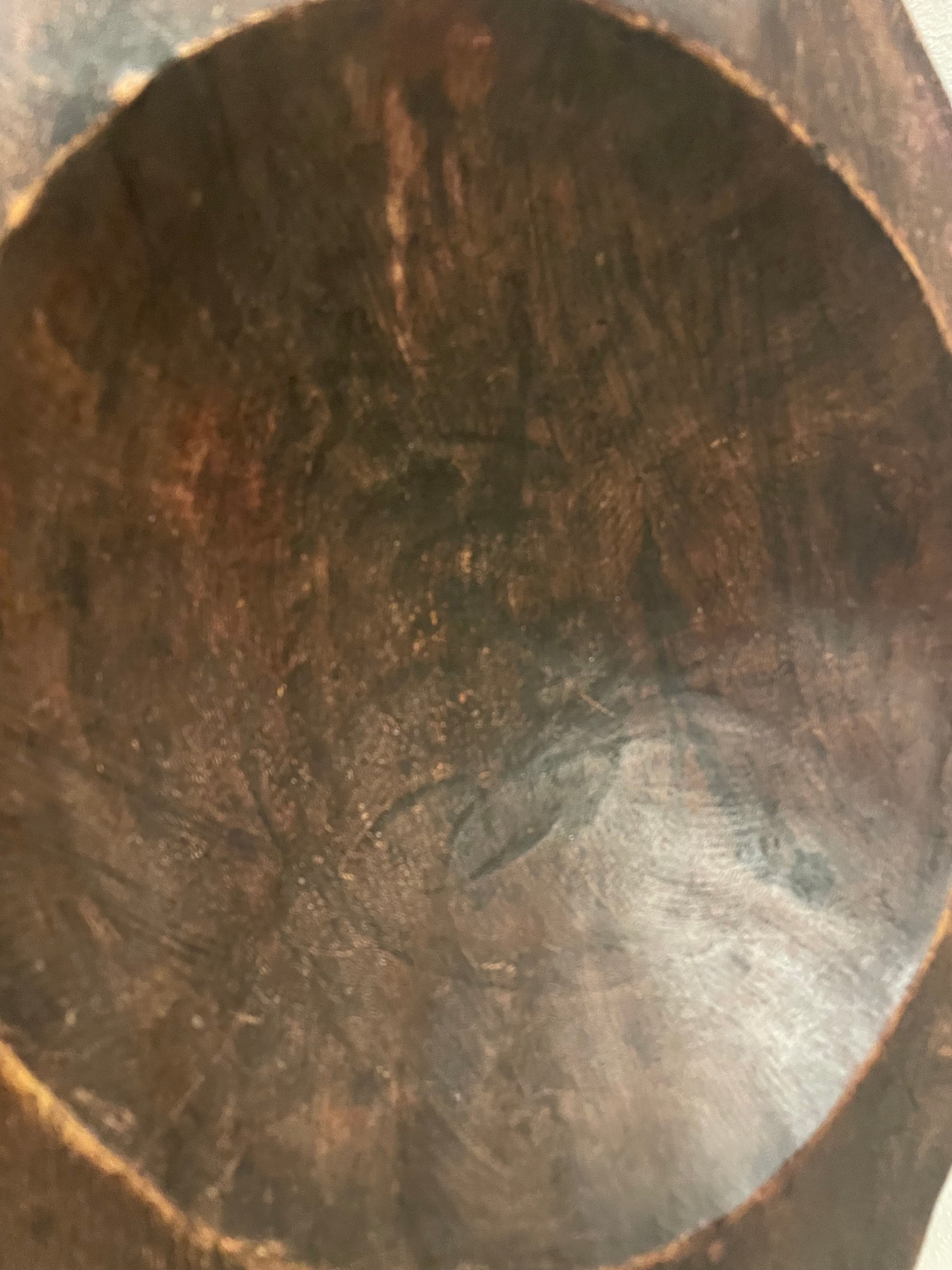 Parat – la ciotola del pane e della memoria. Ha la forma di una navicella, come se volesse solcare mari invisibili. Ma non è fatta per l’acqua: è fatta per il grano, per la farina, per le mani callose e sapienti che vi impastavano il pane del giorno. Questo parat in legno massiccio, scolpito a mano e liscio di gesti antichi, viene da un altrove dove il pane è sacro, e la preparazione un rito tramandato da madre a figlia. Ogni graffio racconta una storia. Ogni segno circolare è il ricordo di un movimento ripetuto con pazienza e amore, giorno dopo giorno. Le estremità allungate, scolpite a spirale e consumate dal tempo, servivano per afferrarlo e ruotarlo. Lo si poggiava a terra, sul pavimento di una casa in terra cruda o sotto un portico ombroso, e il lavoro cominciava: farina, acqua, lievito, e il suono sordo delle nocche che affondano nell’impasto. Non è solo un oggetto: è un frammento di quotidianità rurale, un testimone silenzioso di comunità e nutrimento. E oggi, anche vuoto, questo parat resta pieno: di simboli, di storie, di una bellezza semplice che sfida il tempo.