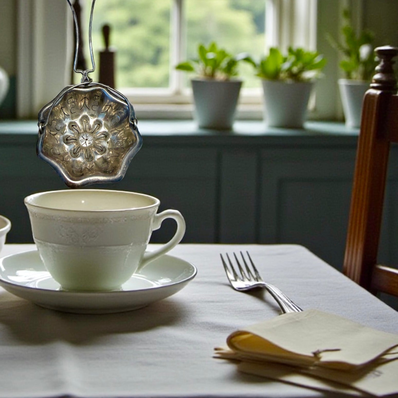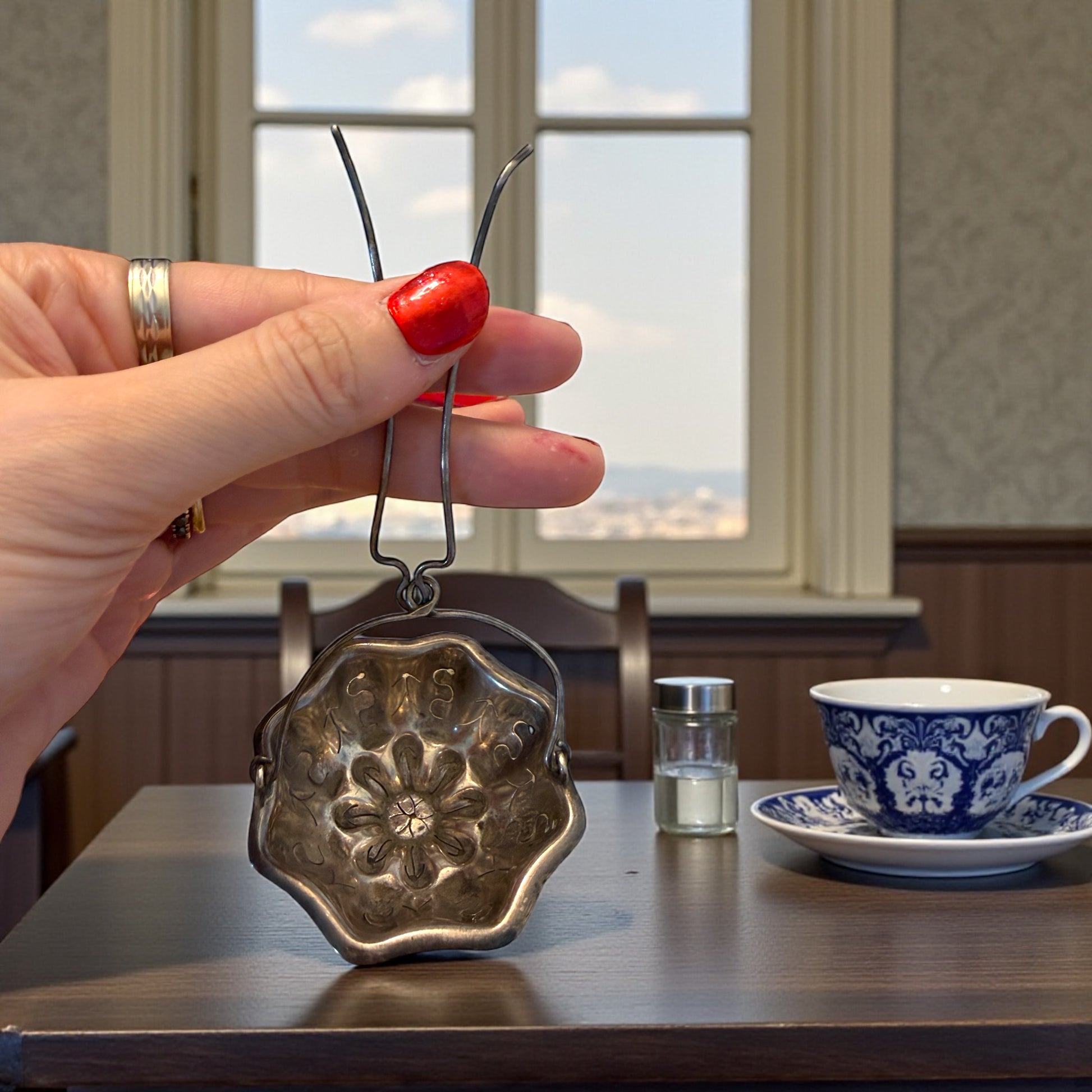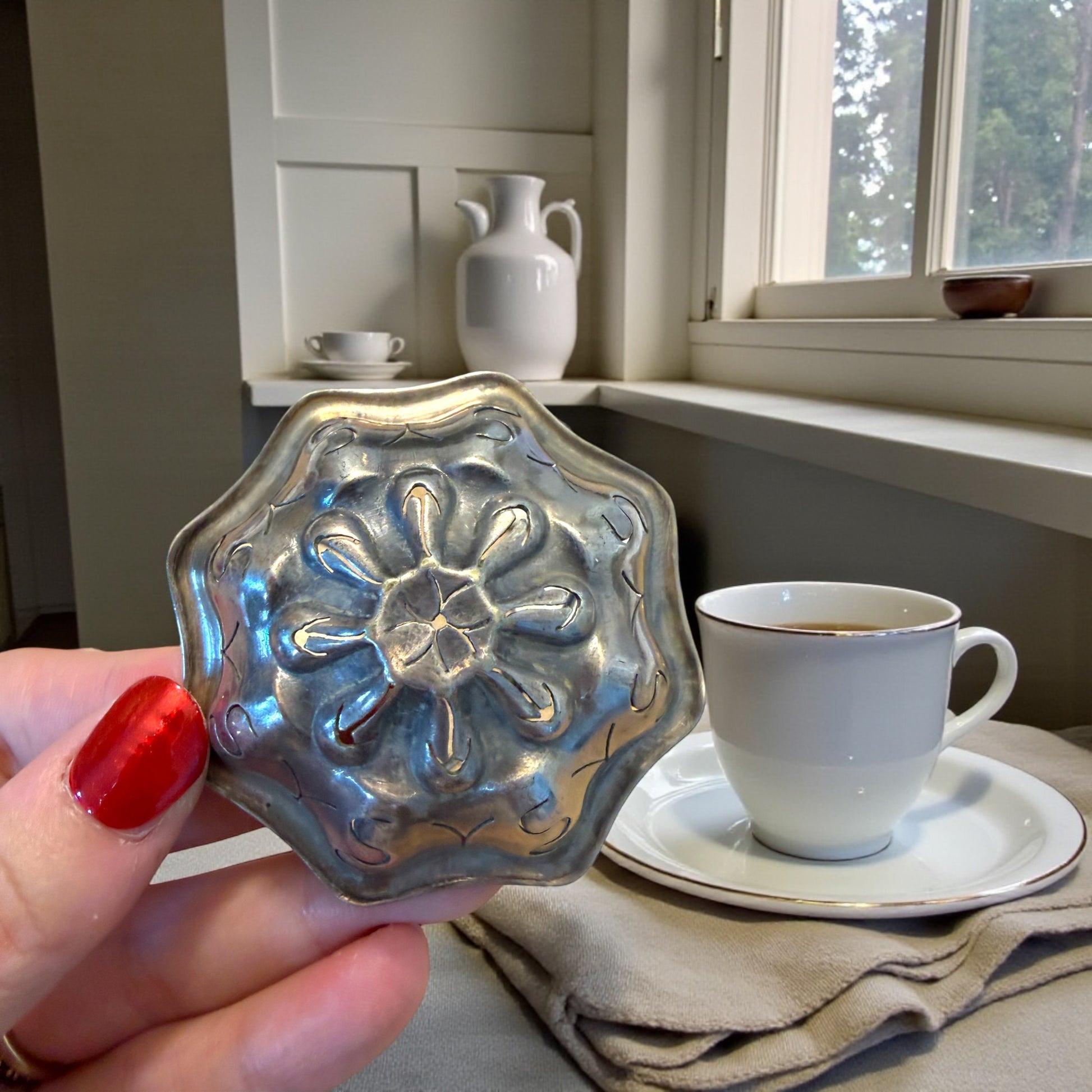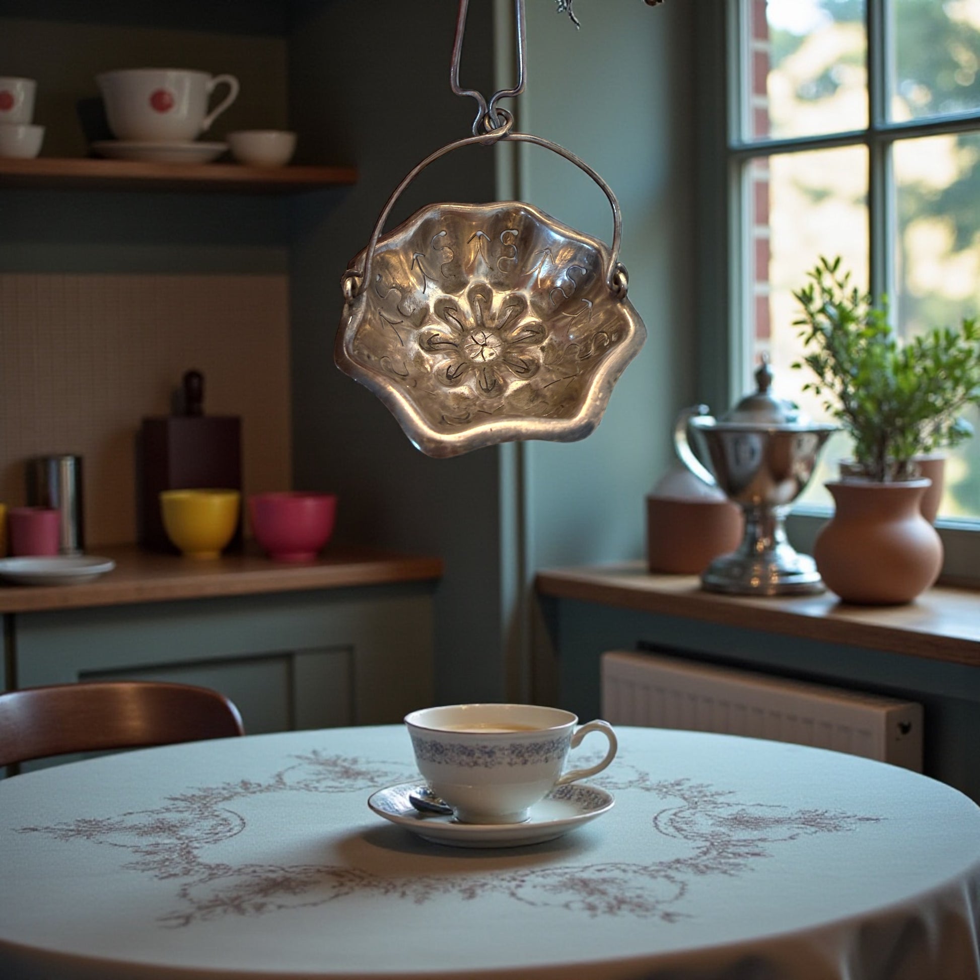 C’è un gesto lento, quasi cerimoniale, nel sollevare un filtro e lasciar scendere l’acqua calda attraverso le foglie di una tisana. Questo passe-thé argentato sembra nato proprio per quel momento: quando la tazza è già pronta, il tempo si dilata e anche un’azione semplice diventa elegante. La coppa, modellata come un fiore mosso, accoglie le erbe con discrezione; il decoro traforato e inciso disegna ombre leggere sul liquido sottostante, mentre il manico ad archetto permette di sospenderlo con naturalezza sopra la tazza o la teiera. È un oggetto che parla di cucine silenziose, di pomeriggi luminosi, di attenzione ai dettagli. Non è solo un accessorio: è un piccolo rito domestico che riporta alla grazia quotidiana di un’altra epoca.