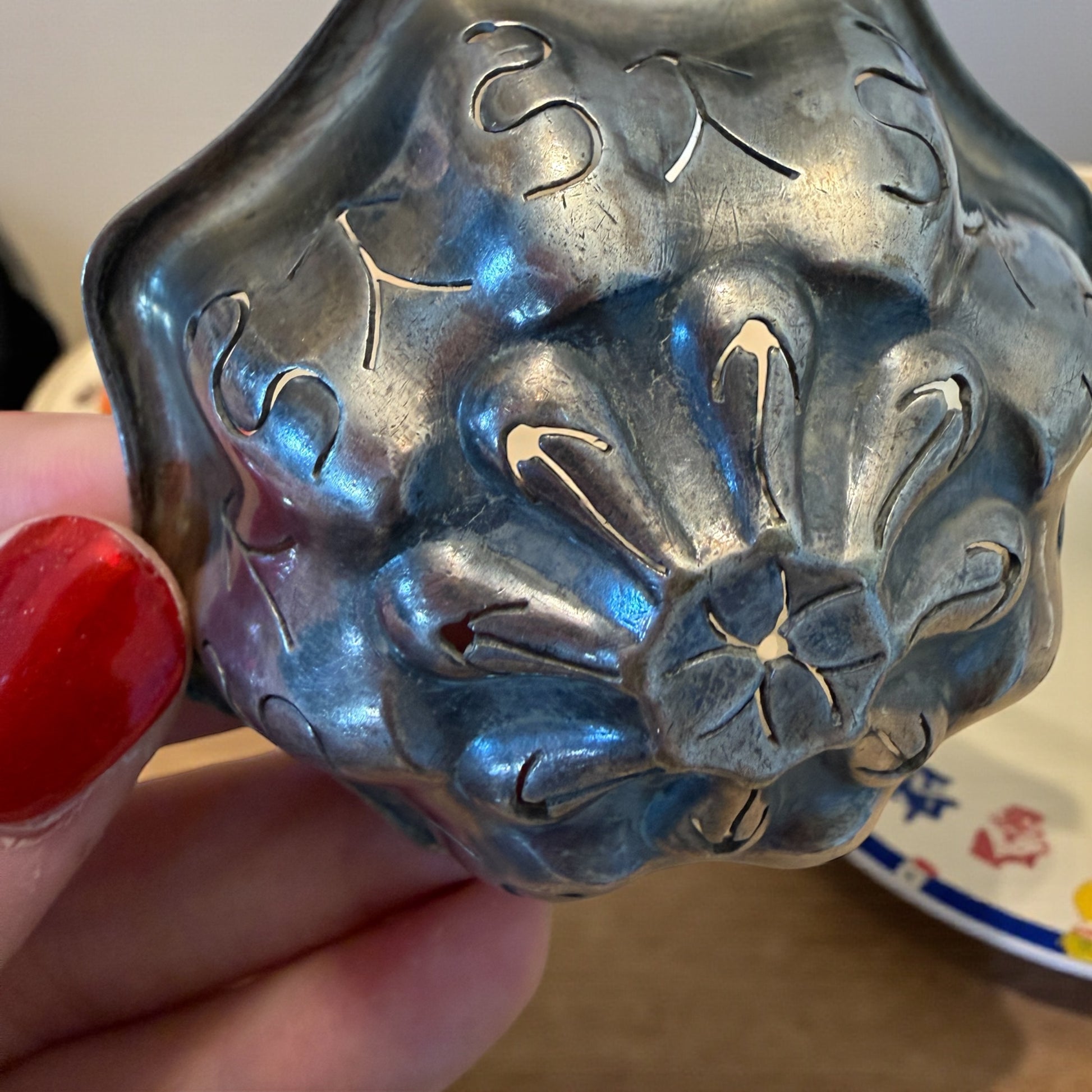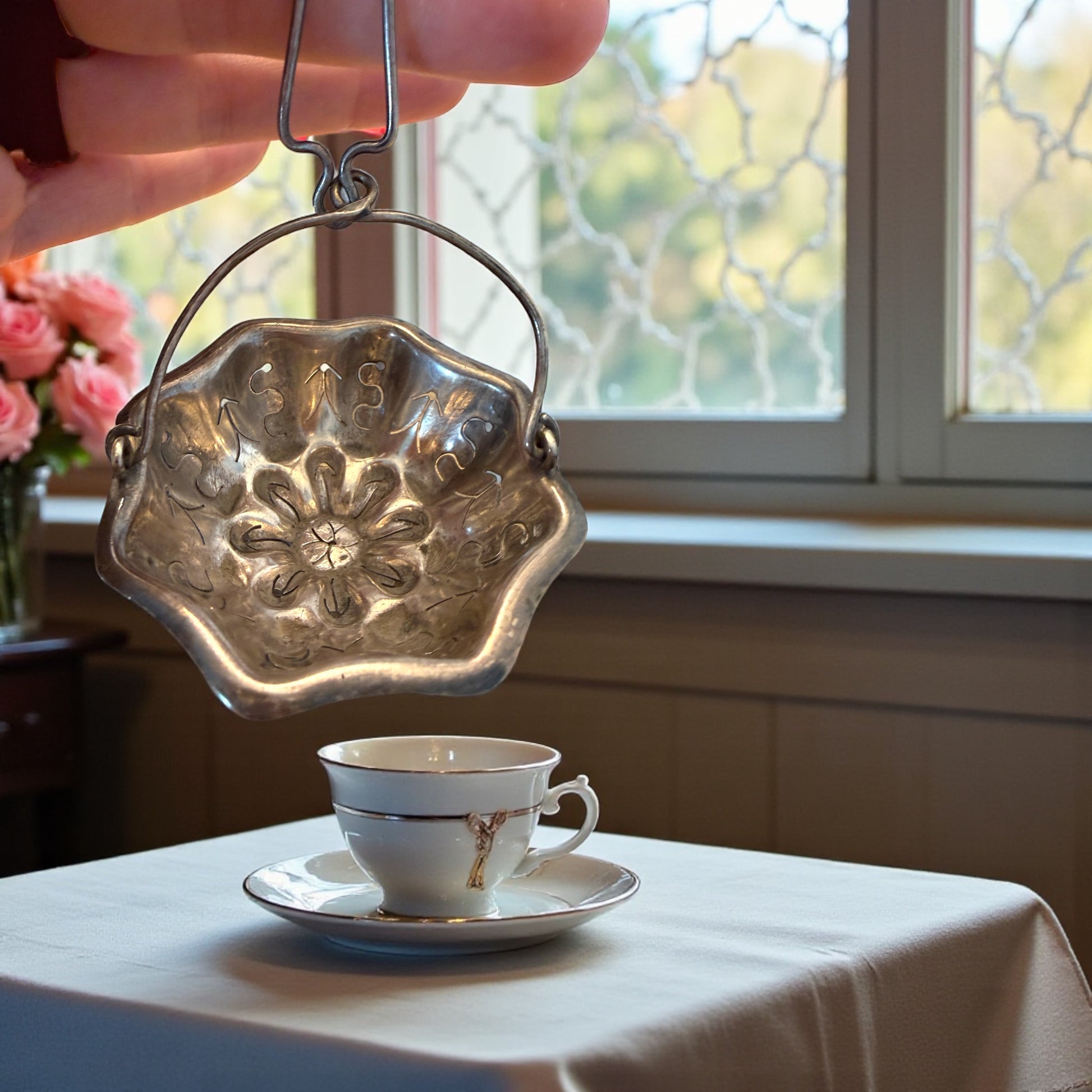 Oggetto: passe-thé / filtro per tè e tisane. Materiale: metallo argentato (probabile argentatura, privo di punzoni). Epoca: fine XIX – inizi XX secolo. Lavorazione: coppa stampata con decoro floreale traforato e incisioni manuali. Forma: fiore ondulato con manico ad archetto sospendibile. Condizioni: buone, con patina coerente con l’età