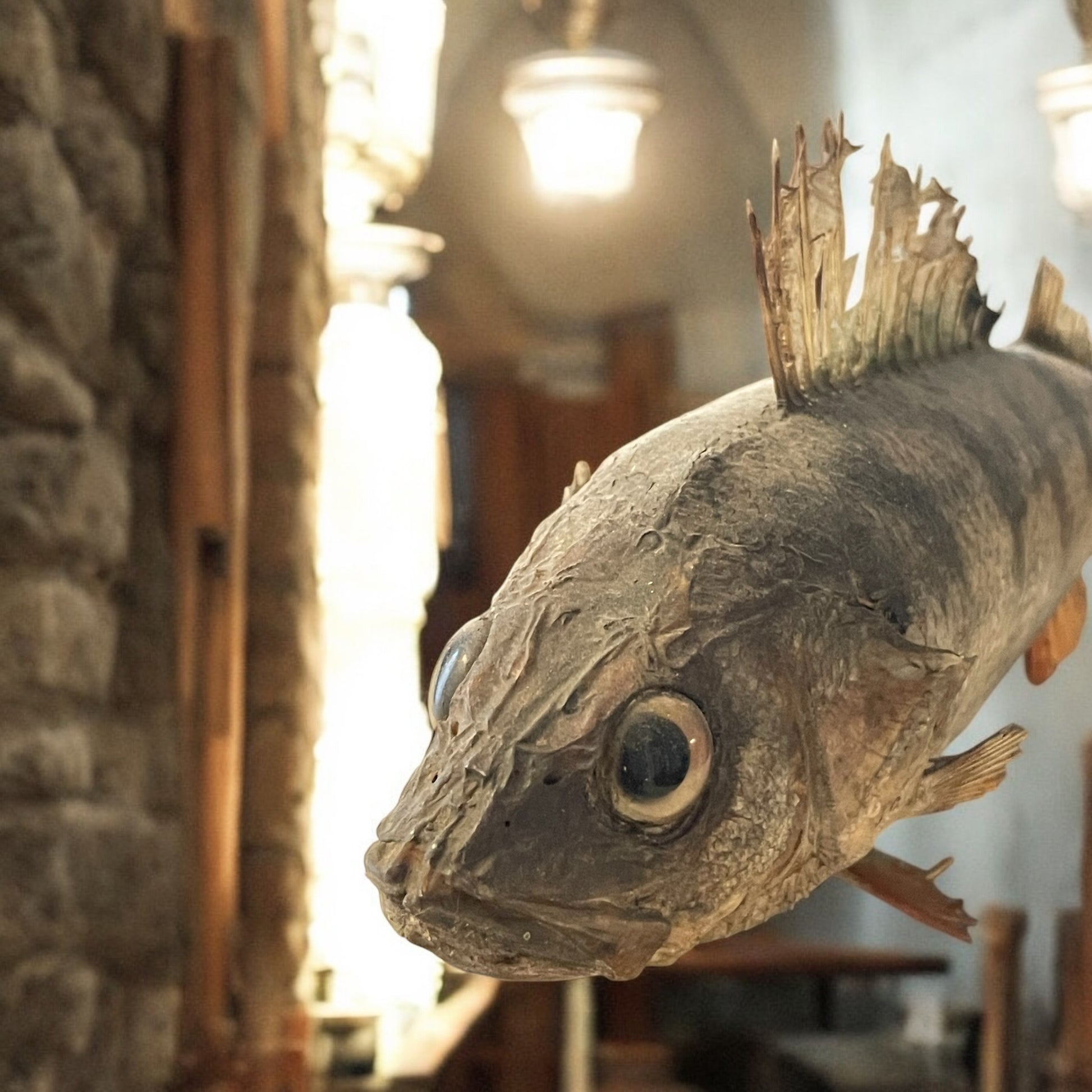 un persico imbalsamato, testimone silenzioso di racconti ormai perduti. Le sue pinne, secche come pergamena, ancora fremono al pensiero del lago che un giorno lo ha ospitato. L’occhio vitreo — immobile e stupito — sembra scrutare chi entra, come a domandare: “E tu, cosa cerchi davvero?” Fissato su una base di legno scuro con antichi ferri ribattuti a mano, una volta aveva una etichetta scritta a mano - negli anni più recenti una scritta tracciata sotto la base. Erano le wunderkammer degli anni ‘20, dalle luci soffuse e dal profumo di ceralacca, dove lui vegliava. Oggi, riemerge dalla penombra. Non è un semplice oggetto. È un enigma, un frammento d’epoca, un ponte tra il mondo della natura e quello della meraviglia…. Il simbolo del gusto dei cabinet des curiosités. Dimensioni: base 32.5 x 10, altezza 16 cm. Soggetto fragile…. Ma è la sua bellezza, il suo essere effimero.
