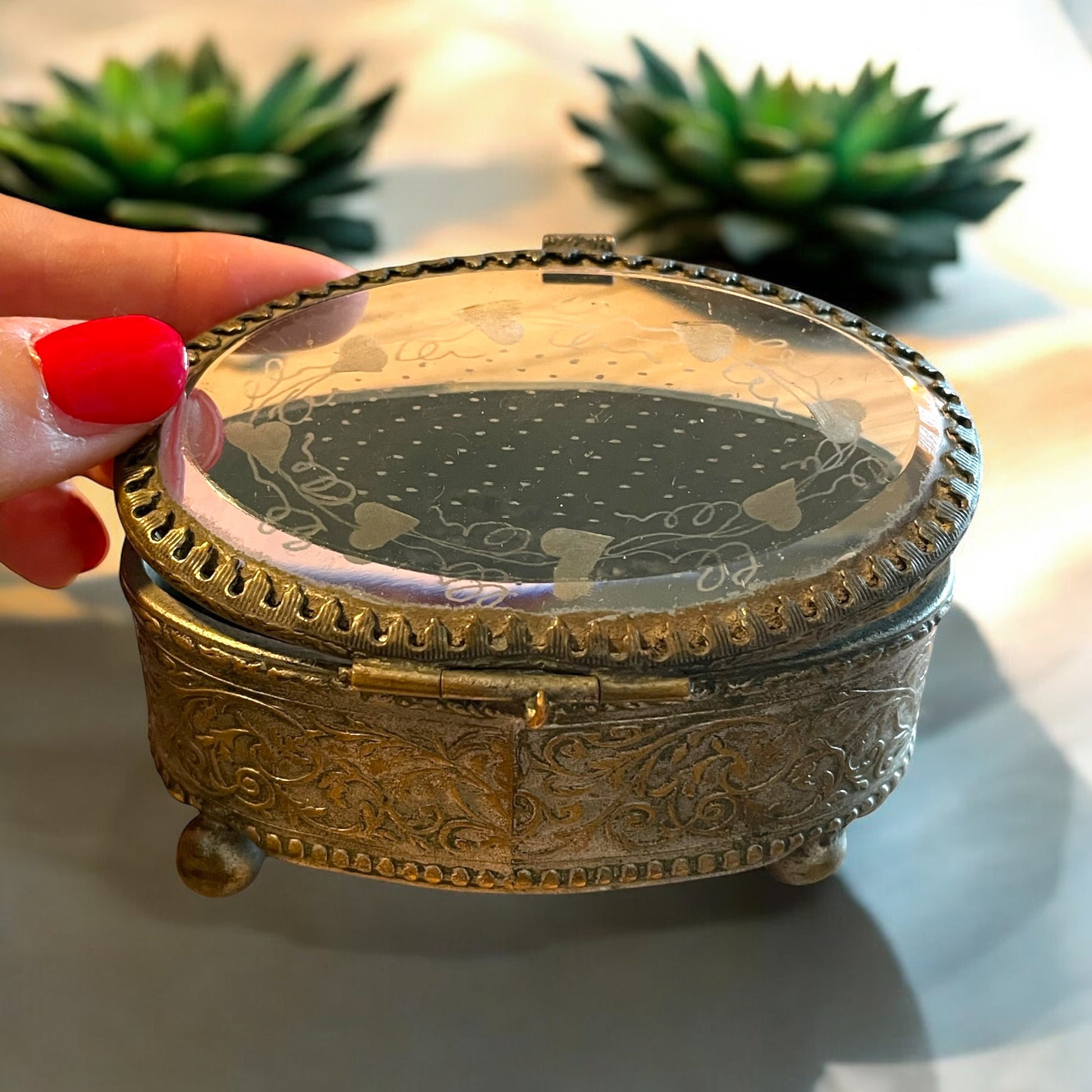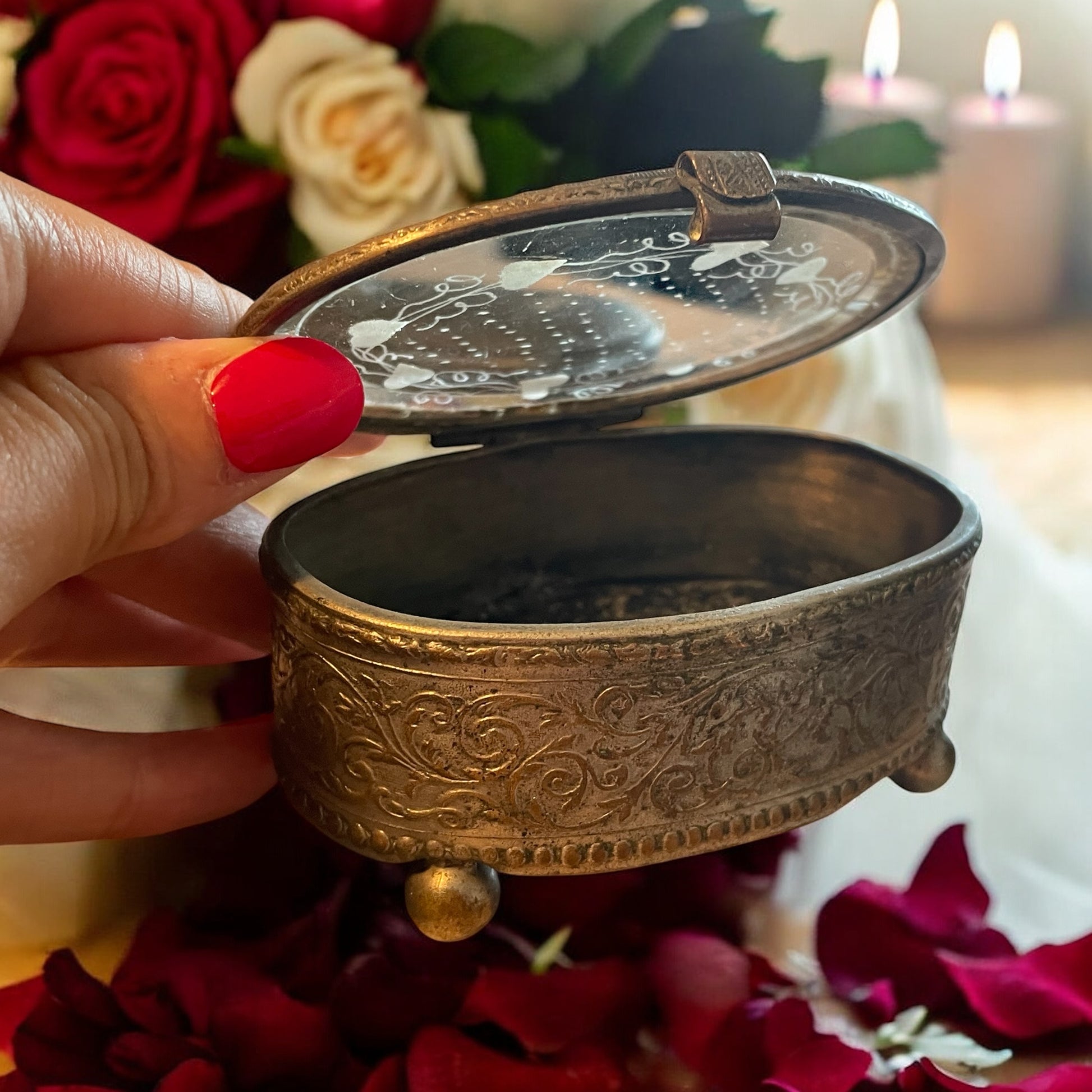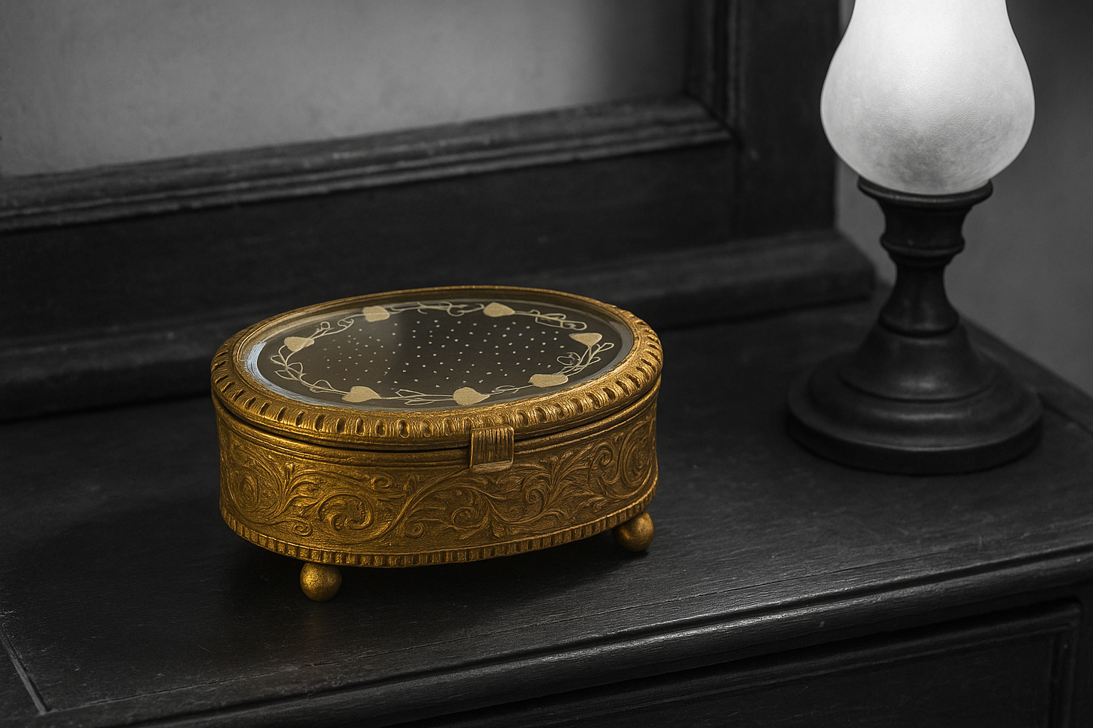 Ogni sera, prima di spegnere la lampada in vetro opalino sul suo comodino, lei apriva con gesto lento questa piccola scatola dorata. Non era solo un portagioie, era il suo scrigno segreto. Con dita lievi, sfiorava le due minuscole ciocche di capelli: una più chiara, l’altra più scura. I primi riccioli tagliati ai suoi bambini, conservati come un tesoro sacro, più prezioso dell’oro o delle perle. Lo scrigno, poggiato da sempre su un centrino ricamato, sembrava fatto apposta per custodire ricordi. La base in metallo dorato, finemente cesellata con volute e motivi floreali in rilievo, poggia su piedini sferici che lo sollevano appena dal piano, come se volesse fluttuare in una bolla d’intimità. Il coperchio, ovale e trasparente, è un piccolo capolavoro: il vetro, tagliato e spesso, racchiude all’interno un decoro inciso che sembra danzare alla luce. Il motivo di cuoricini e arabeschi disegna una corona silenziosa attorno ai pensieri più teneri. Non c’è serratura, né chiave: solo un piccolo fermaglio discreto, a cui affidare con fiducia le emozioni più profonde. La doratura, un po’ consunta dal tempo, racconta di mani che l’hanno amata, usata, aperta con delicatezza, sera dopo sera. È facile immaginare quella donna degli anni Venti — il viso già truccato per la notte, il profumo lieve della cipria nell’aria — mentre sorride guardando ciò che il tempo ha portato via solo in apparenza. Perché certi ricordi non sfioriscono. Si posano, si rannicchiano, si conservano in piccoli scrigni come questo.