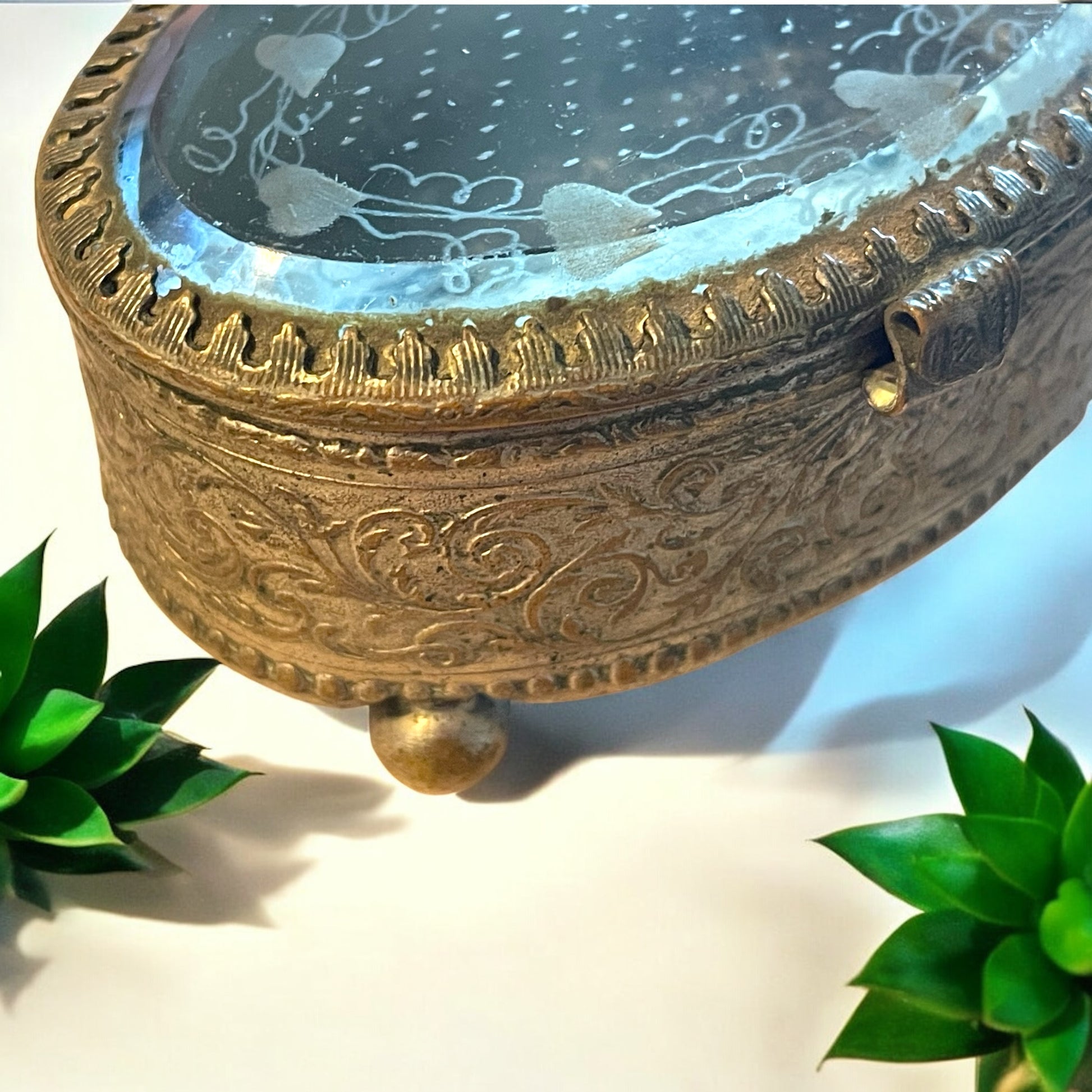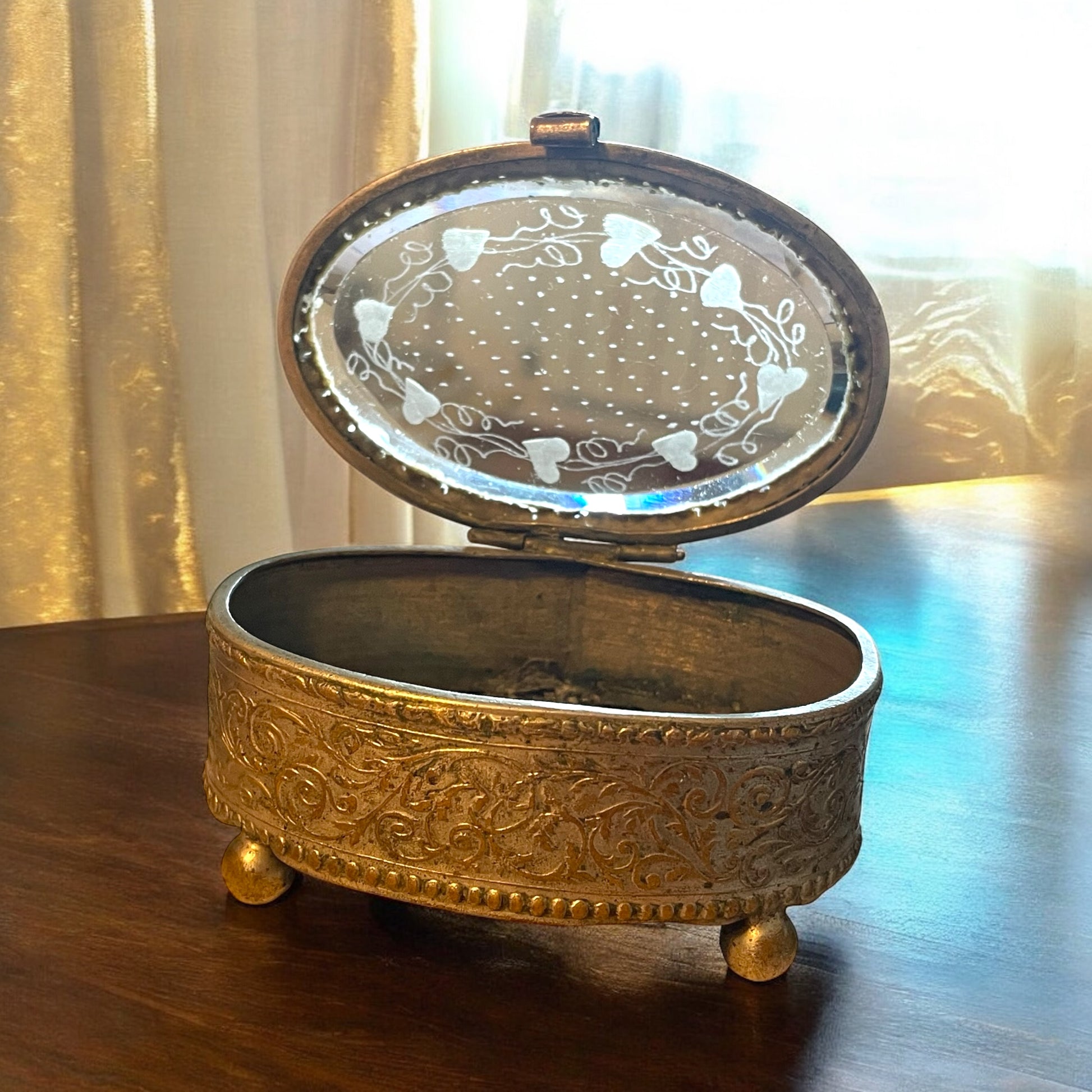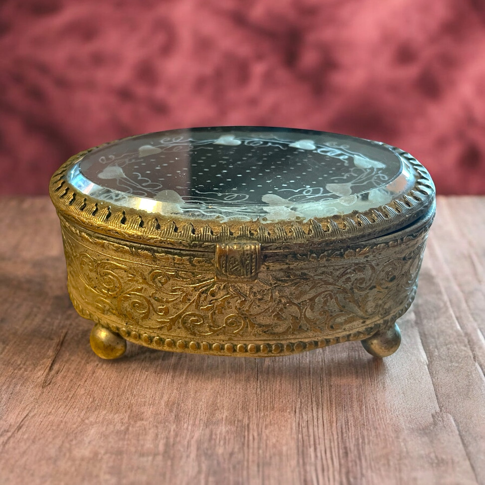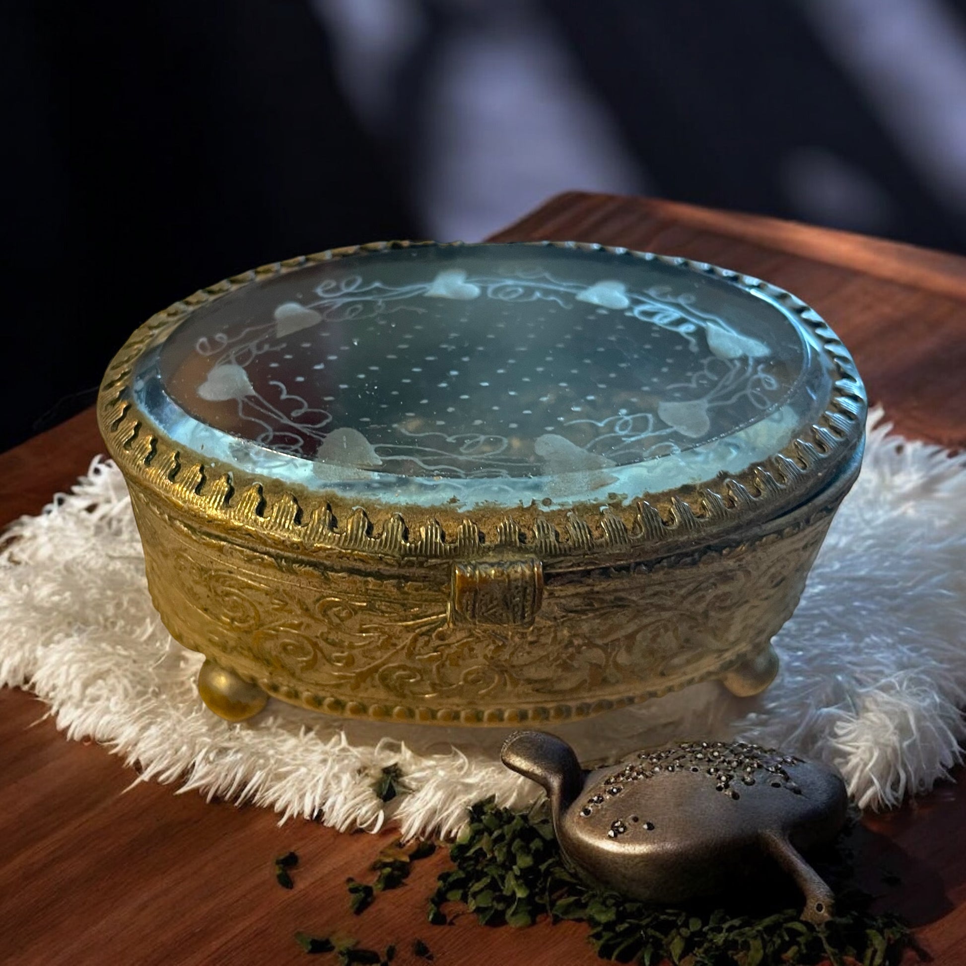 Ogni sera, prima di spegnere la lampada in vetro opalino sul suo comodino, lei apriva con gesto lento questa piccola scatola dorata. Non era solo un portagioie, era il suo scrigno segreto. Con dita lievi, sfiorava le due minuscole ciocche di capelli: una più chiara, l’altra più scura. I primi riccioli tagliati ai suoi bambini, conservati come un tesoro sacro, più prezioso dell’oro o delle perle. Lo scrigno, poggiato da sempre su un centrino ricamato, sembrava fatto apposta per custodire ricordi. La base in metallo dorato, finemente cesellata con volute e motivi floreali in rilievo, poggia su piedini sferici che lo sollevano appena dal piano, come se volesse fluttuare in una bolla d’intimità. Il coperchio, ovale e trasparente, è un piccolo capolavoro: il vetro, tagliato e spesso, racchiude all’interno un decoro inciso che sembra danzare alla luce. Il motivo di cuoricini e arabeschi disegna una corona silenziosa attorno ai pensieri più teneri. Non c’è serratura, né chiave: solo un piccolo fermaglio discreto, a cui affidare con fiducia le emozioni più profonde. La doratura, un po’ consunta dal tempo, racconta di mani che l’hanno amata, usata, aperta con delicatezza, sera dopo sera. È facile immaginare quella donna degli anni Venti — il viso già truccato per la notte, il profumo lieve della cipria nell’aria — mentre sorride guardando ciò che il tempo ha portato via solo in apparenza. Perché certi ricordi non sfioriscono. Si posano, si rannicchiano, si conservano in piccoli scrigni come questo.