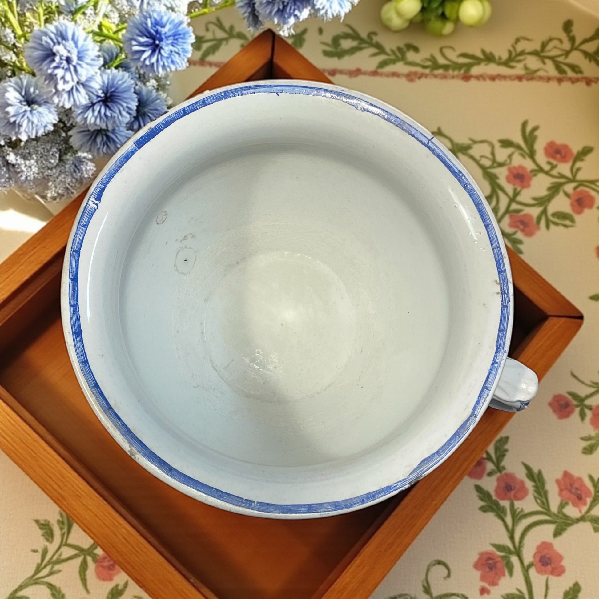 ✨ Immagina una camera da letto della fine dell’Ottocento, con mobili di legno massiccio, un grande catino con brocca in ceramica appoggiato al comò e, accanto, questo vaso da notte in elegante terraglia bianca e blu. Era parte integrante dei raffinati servizi da toilette che accompagnavano la vita borghese del tempo. Prodotto dalla celebre manifattura Keller & Guérin di Lunéville, in Lorena (Francia), questo vaso da notte risale agli anni 1880-1900. Lunéville è stata una delle capitali francesi della faïence fine: le sue ceramiche erano apprezzate per la qualità della terraglia e per i decori eleganti, spesso realizzati con la tecnica del transferware. Il decoro floreale blu, nitido e armonioso, riflette il gusto naturalistico dell’epoca, che cercava di portare in casa la grazia della natura. Il marchio con la corona e la scritta “LUNÉVILLE” ne certifica l’origine. Oggi, un tempo relegato alla vita privata, questo oggetto diventa un affascinante vaso per fiori freschi, centrotavola, o perché no… trova la sua collocazione nel bagno degli ospiti ospitando deliziose lavette tono su tono.