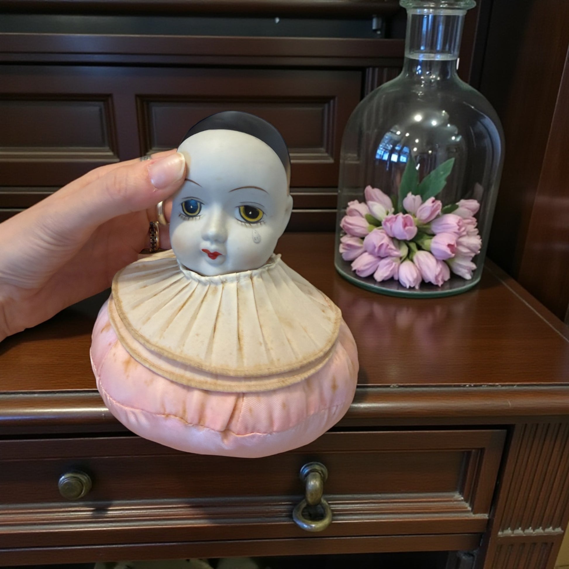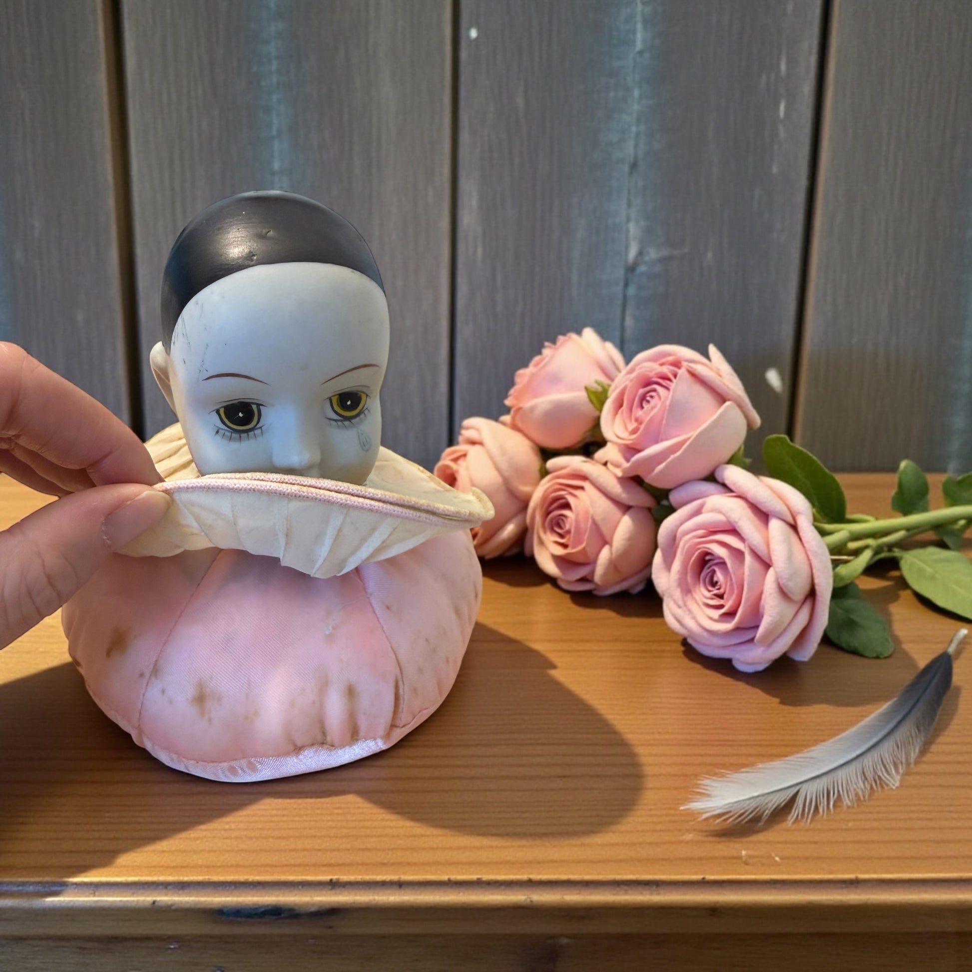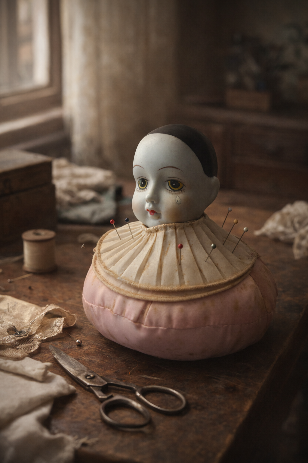 Ti guarda dal tavolo da cucito come se avesse appena interrotto il to lavoro e ti avesse chiamato. Questo antico puntaspilli con testa di bambola Pierrot nasce per accompagnare i gesti lenti e ripetuti del cucire, quando le mani lavoravano e la mente poteva vagare. La testa in biscuit, dipinta con tratti delicati e uno sguardo velato di malinconia, poggia su un corpo morbido e imbottito, pensato per essere punto e ripunto senza mai perdere la sua forma. Il grande collare plissettato incornicia il volto come un costume teatrale, richiamando l’estetica romantica di fine Ottocento. Non è un giocattolo, ma un oggetto funzionale e silenzioso, nato per restare fermo accanto a chi cuciva, assorbendo il tempo, i pensieri, la quotidianità. Le tracce sul tessuto raccontano un uso reale, autentico, mai cancellato. Un oggetto che non chiede di essere perfetto, ma vero. E che ancora oggi sembra custodire una presenza e tante, tante domande e pensieri intimi.