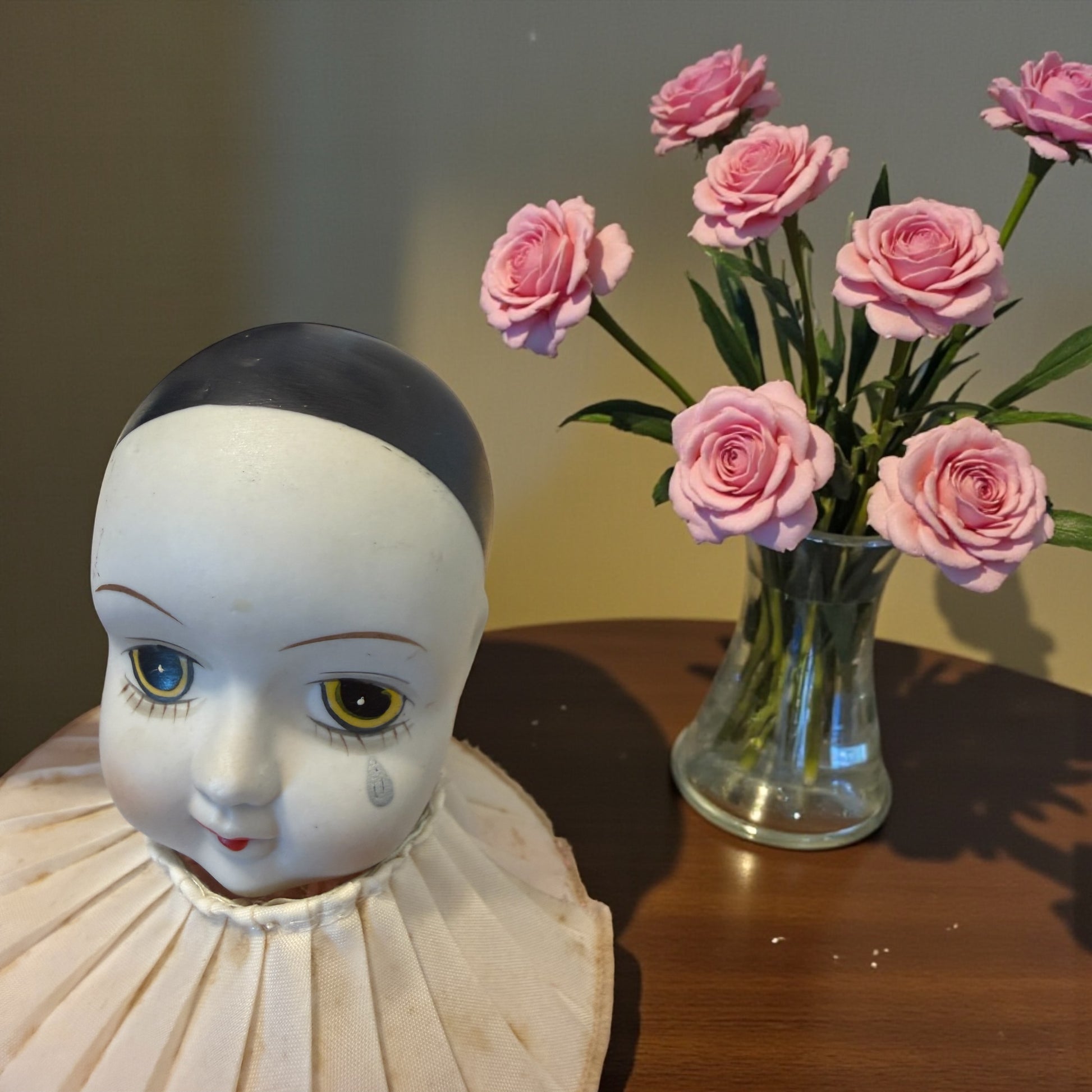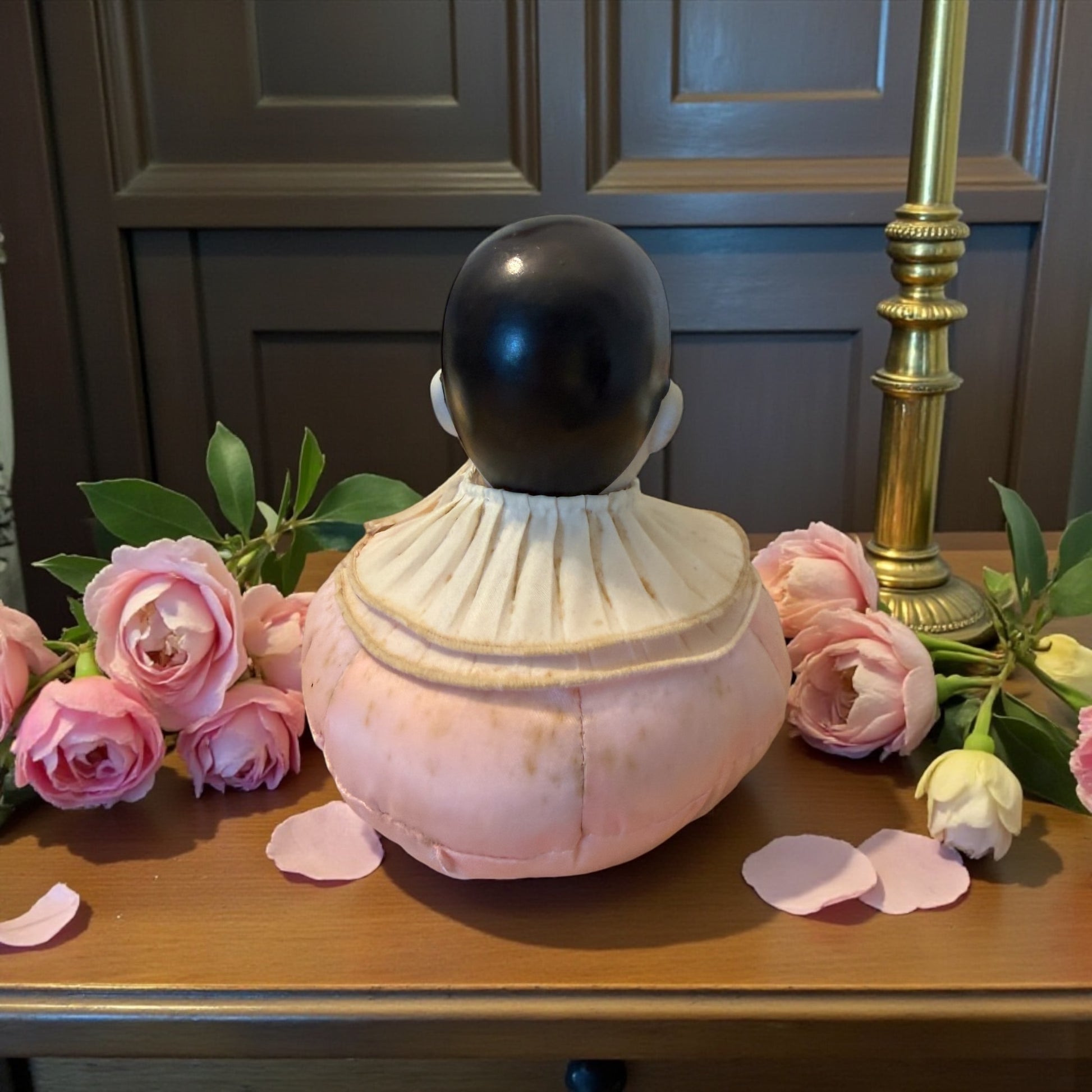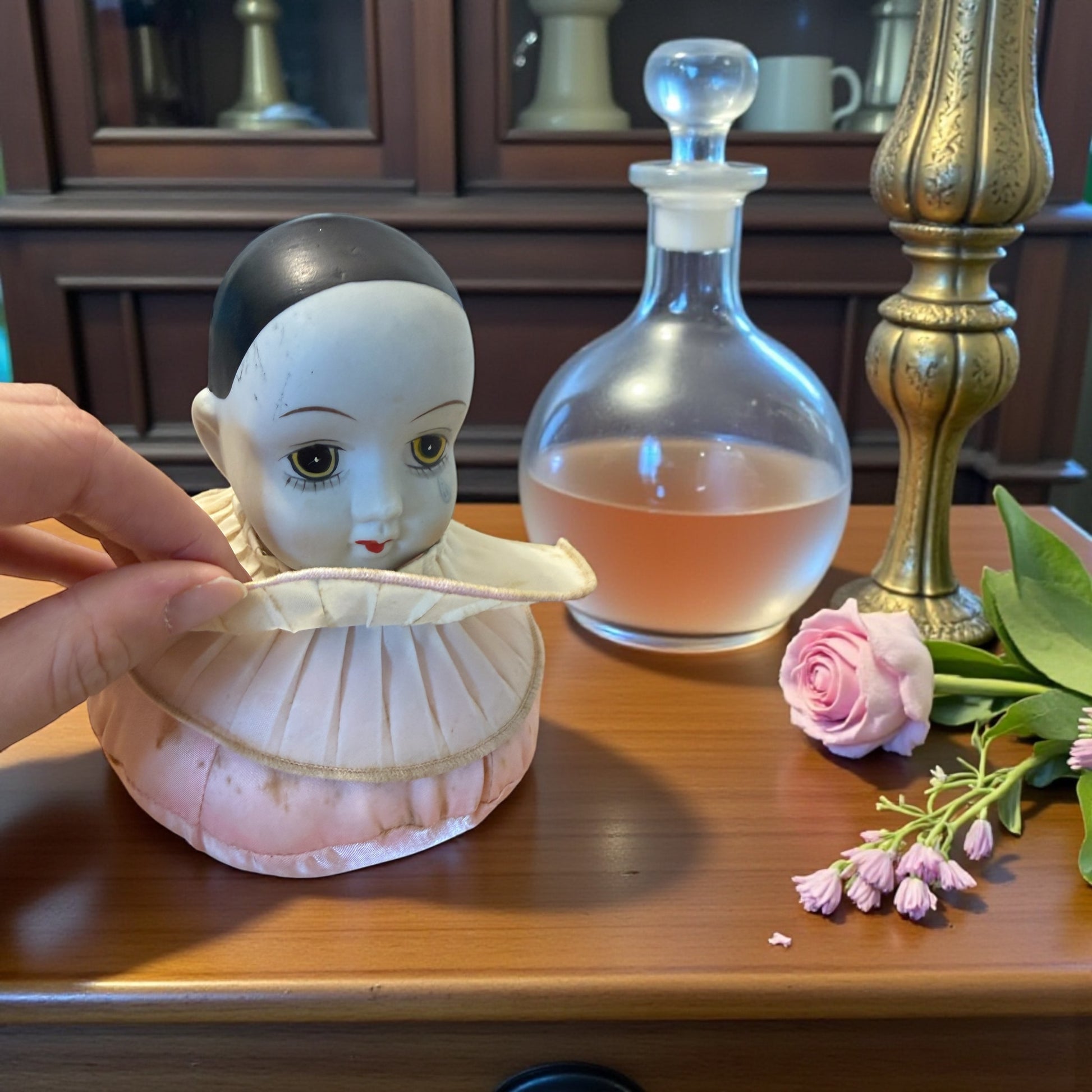 Ti guarda dal tavolo da cucito come se avesse appena interrotto il to lavoro e ti avesse chiamato. Questo antico puntaspilli con testa di bambola Pierrot nasce per accompagnare i gesti lenti e ripetuti del cucire, quando le mani lavoravano e la mente poteva vagare. La testa in biscuit, dipinta con tratti delicati e uno sguardo velato di malinconia, poggia su un corpo morbido e imbottito, pensato per essere punto e ripunto senza mai perdere la sua forma. Il grande collare plissettato incornicia il volto come un costume teatrale, richiamando l’estetica romantica di fine Ottocento. Non è un giocattolo, ma un oggetto funzionale e silenzioso, nato per restare fermo accanto a chi cuciva, assorbendo il tempo, i pensieri, la quotidianità. Le tracce sul tessuto raccontano un uso reale, autentico, mai cancellato. Un oggetto che non chiede di essere perfetto, ma vero. E che ancora oggi sembra custodire una presenza e tante, tante domande e pensieri intimi.
