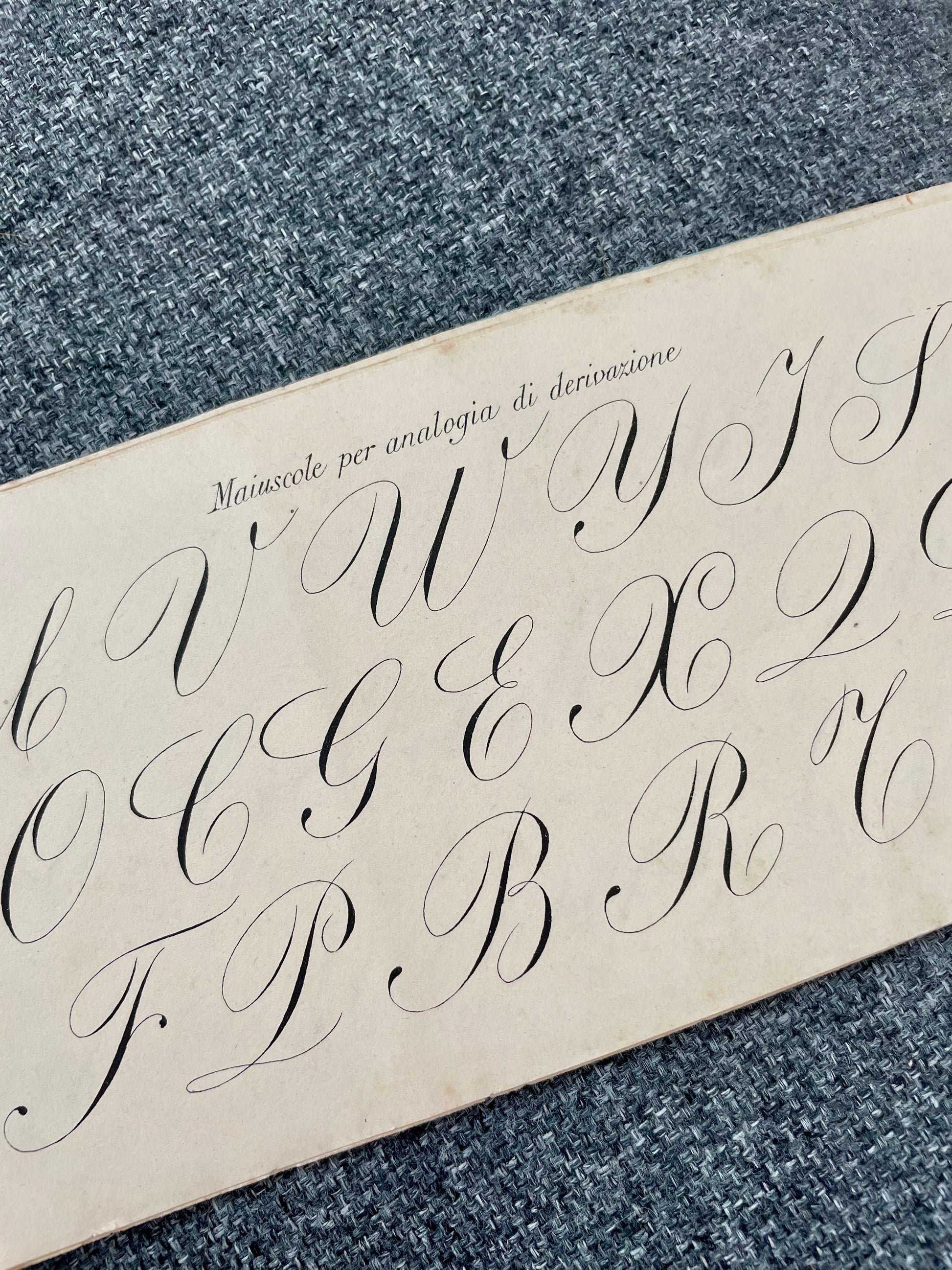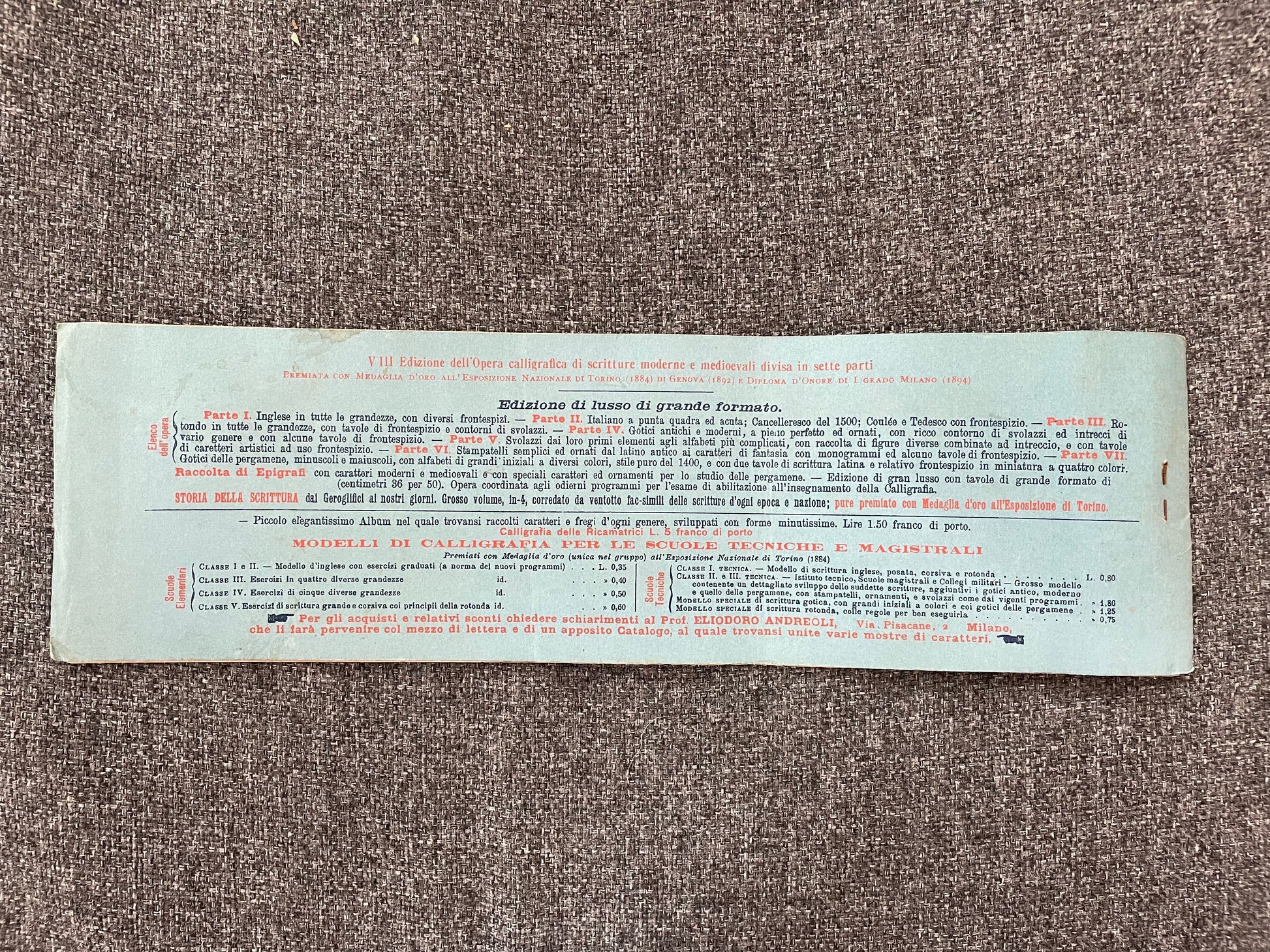 C’è grande fascino discreto in questo antico quaderno di calligrafia: pagine lunghe e strette, pensate per accompagnare il gesto della mano, per educare non solo alla scrittura ma alla grazia. Questo Modello di Calligrafia del Prof. Eliodoro Andreoli, edito da Paravia tra la fine dell’Ottocento e i primi del Novecento, conserva intatto il respiro lento di un’epoca in cui la bellezza della parola scritta era considerata parte dell’anima. Le lettere eleganti, tracciate con precisione quasi musicale, seguono linee sottili e curve armoniose: l’alfabeto diventa danza, la mano obbedisce al ritmo della mente. Ogni esercizio invita alla disciplina e alla pazienza — virtù che oggi sembrano perdute — mentre la copertina, stampata in rosso e blu su carta celeste, testimonia l’estetica raffinata della tipografia scolastica di fine secolo. Nato per le Scuole Tecniche e Magistrali, questo fascicolo venne adottato in oltre duecento istituti italiani, segno della straordinaria influenza didattica di Andreoli, premiato con medaglie d’oro alle esposizioni di Torino 1884, Genova 1892 e Milano 1894. Tra le sue pagine, ancora oggi, sembra di sentire il fruscio delle penne d’oca, il profumo dell’inchiostro, la concentrazione silenziosa degli allievi chini sui banchi di legno lucidato. Un frammento di scuola e di vita, sopravvissuto al tempo, che restituisce l’emozione di un passato in cui scrivere era un atto d’arte e di devozione.