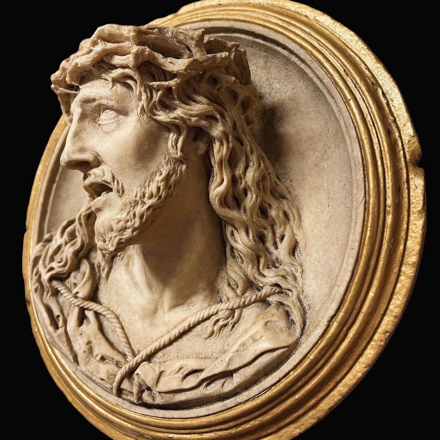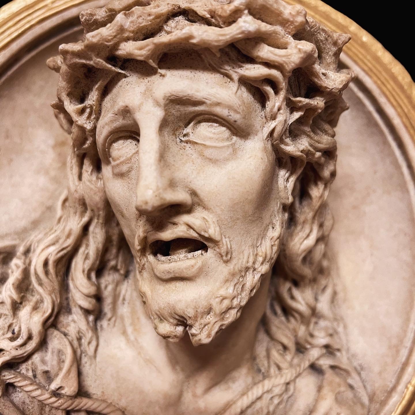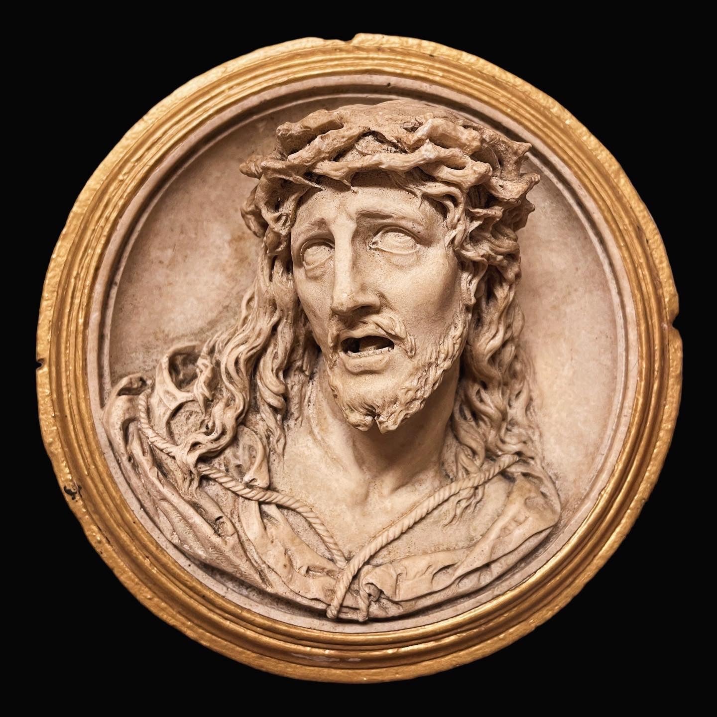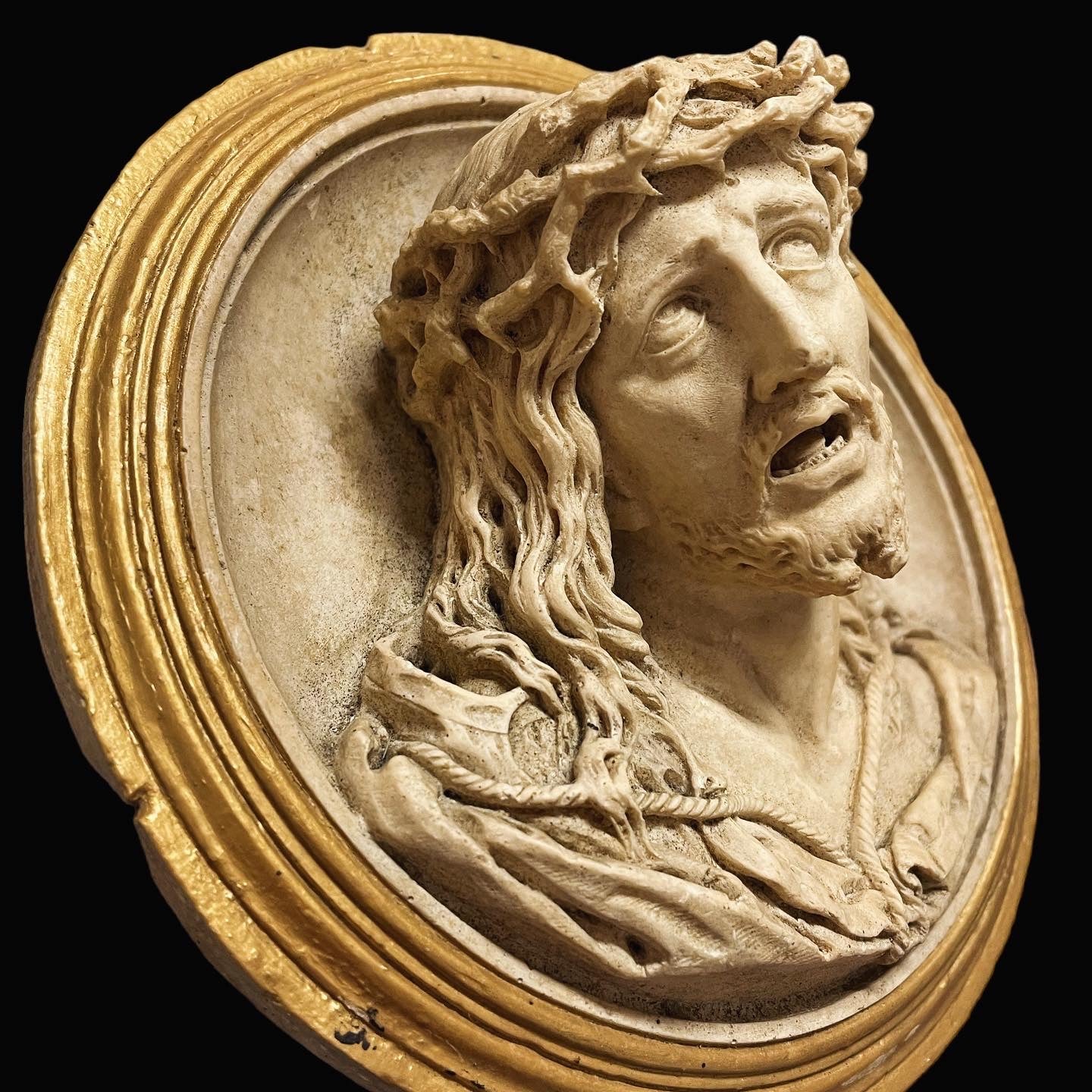 Valuable #relief of #sacredart with a depiction of #christ crucified with the crown of thorns. This #ancient #medallion has a diameter of 18 cm and was certainly inserted in an iron frame - the signs of this can be seen at the perpendiculars. It was created by the hand of a capable artist, judging by the skill with which he captured the expression of pain and the finesse of the details.
