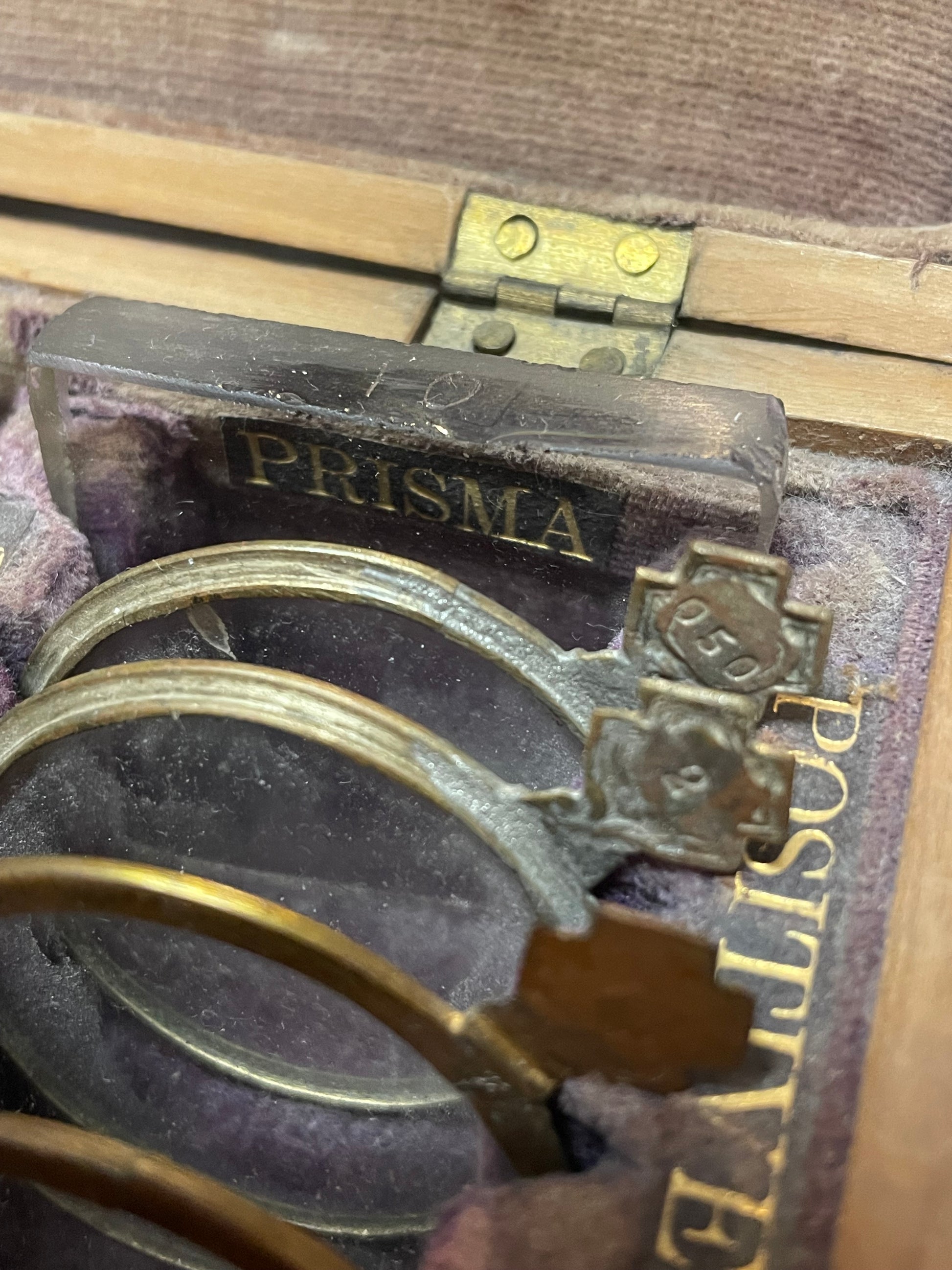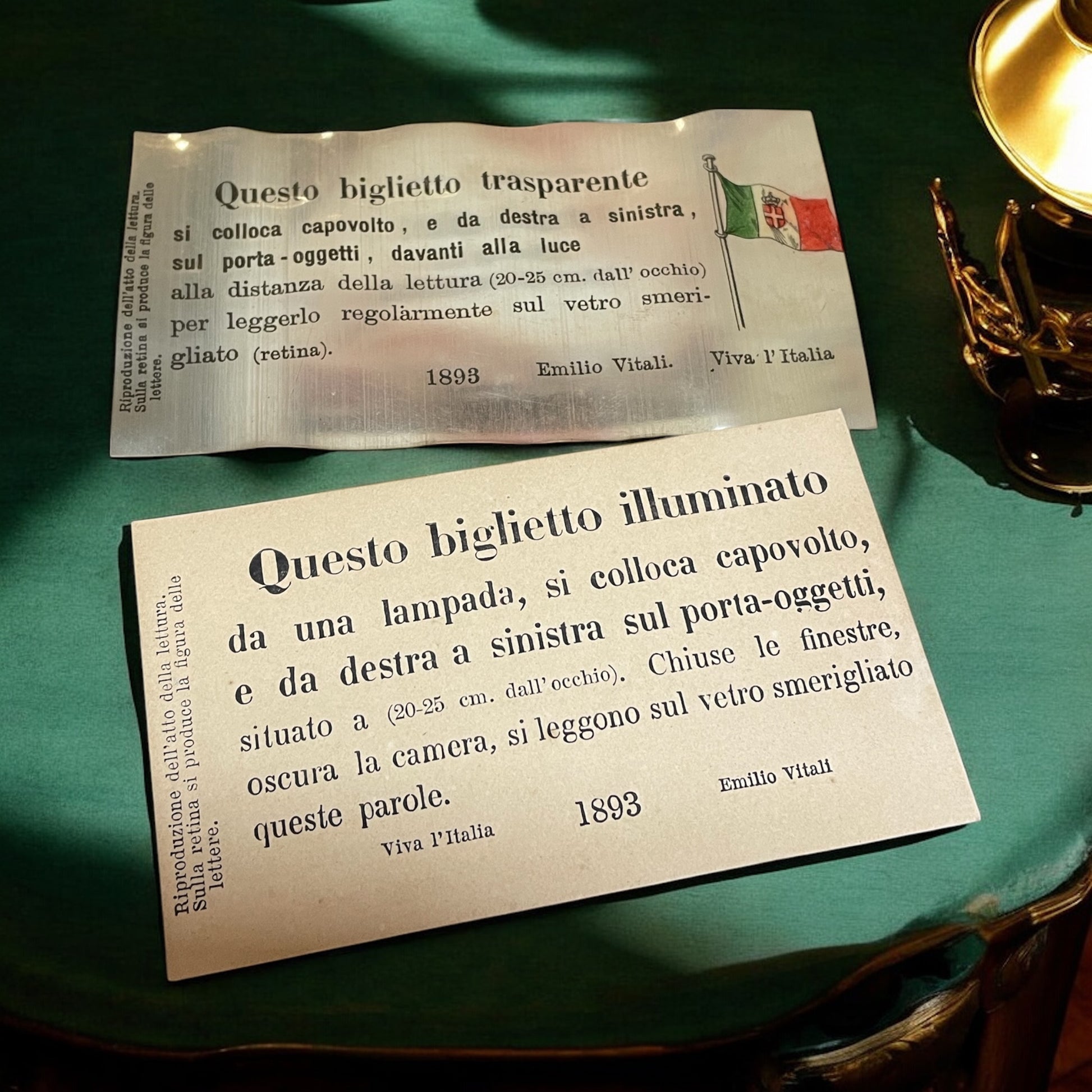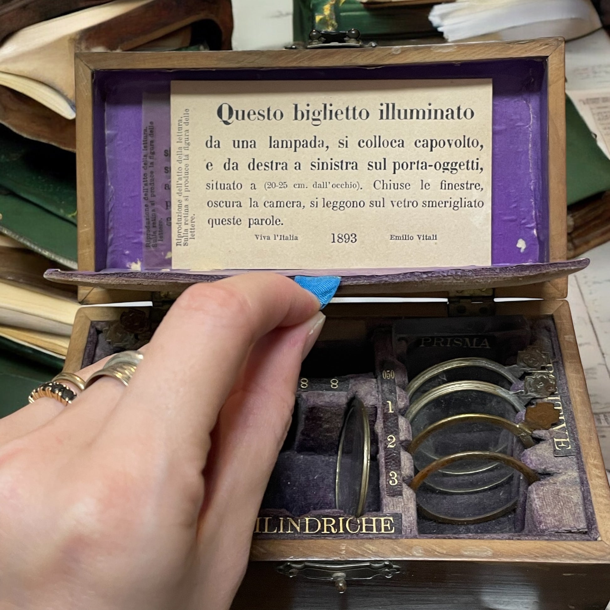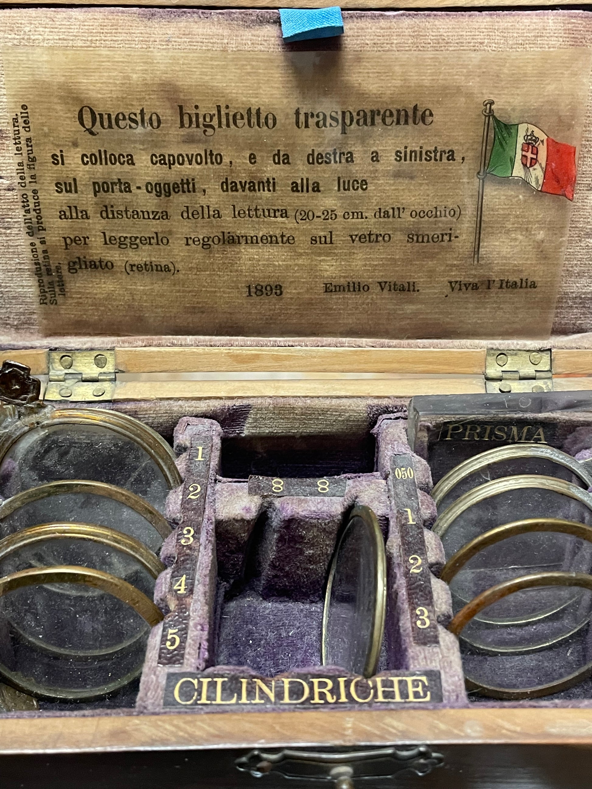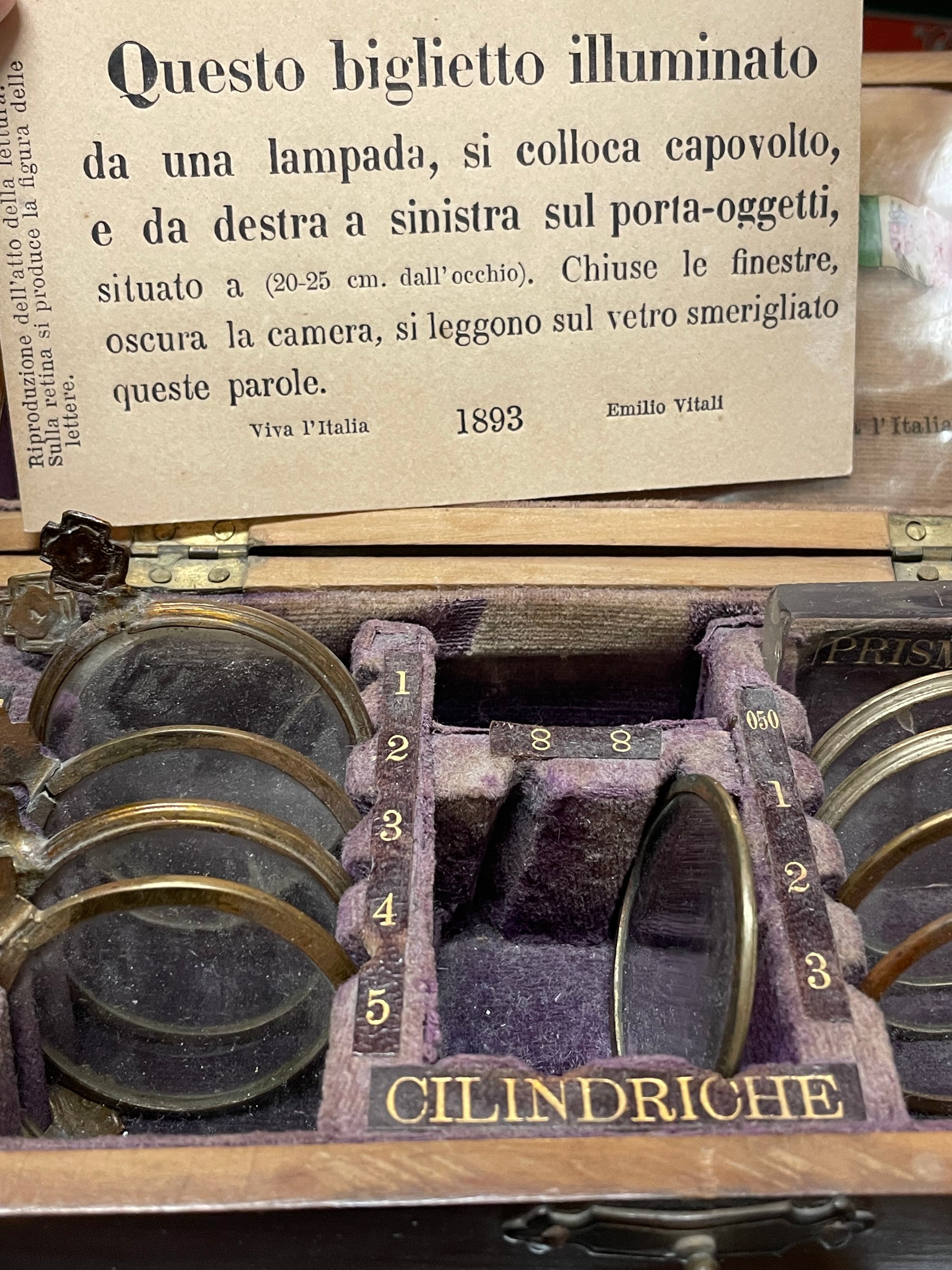 È il 1893. Una stanza fiocamente illuminata, lo studio di un ottico, accoglie questo straordinario set: un gioiello di artigianato e scienza firmato Emilio Vitali. Dentro la sua elegante custodia in legno, rivestita di velluto viola con scritte eleganti e dorate, si svelano le lenti numerate - ciascuna con la propria storia e funzione: positive, negative, cilindriche, e il prisma. Ogni lente, con il suo fine manico in ottone con indicata la correzione, sembra custodire il segreto di una visione più nitida, come se potesse restituire la luce a chi l’ha perduta. Nel coperchio del set lo “sportello segreto” si apre e rivela due biglietti dell’epoca che raccontano un uso che sa di magia: un gioco di luce, oscurità e vetri smerigliati che rende visibili le parole ‘Viva l’Italia’. Non è una frase casuale: siamo negli anni dell’unificazione, e quelle parole parlano di un tempo in cui l’ottica si intrecciava con il patriottismo e la scienza con l’identità nazionale. Questo set non è solo uno strumento, ma un frammento di storia. Racconta di mani precise e menti curiose, di un’epoca in cui l’innovazione era un’arte e ogni oggetto portava con sé il riflesso del mondo che lo aveva creato. Ideale per collezionisti e studiosi, ma anche per chi cerca un oggetto capace di raccontare l’anima di un’epoca lontana. Un pezzo museale, che sa unire storia, scienza e bellezza. Le lenti sono in totale 10 di cui 8 con impugnatura, più il prisma. Le dimensioni del cofanetto sono cm 16 x 11.