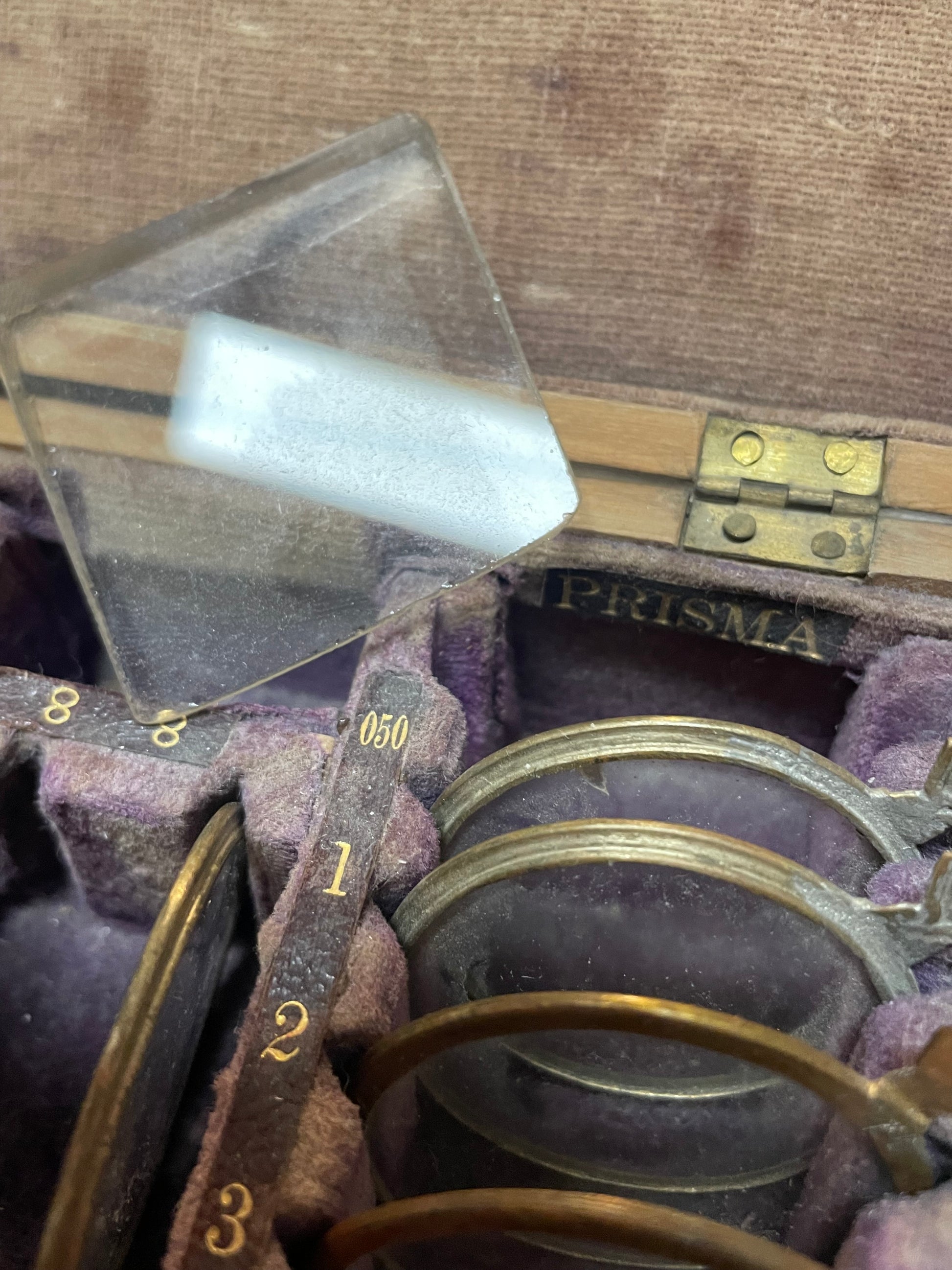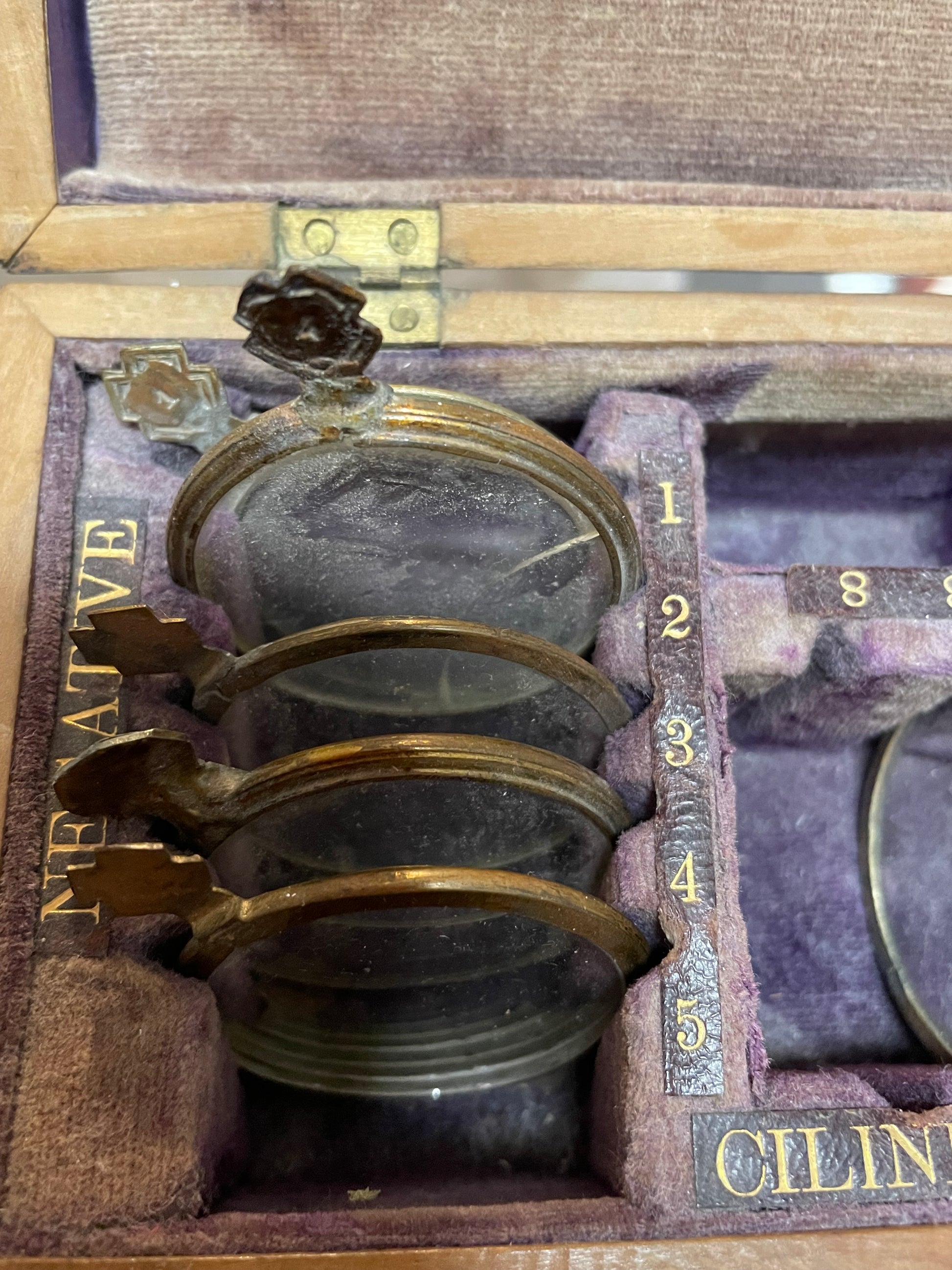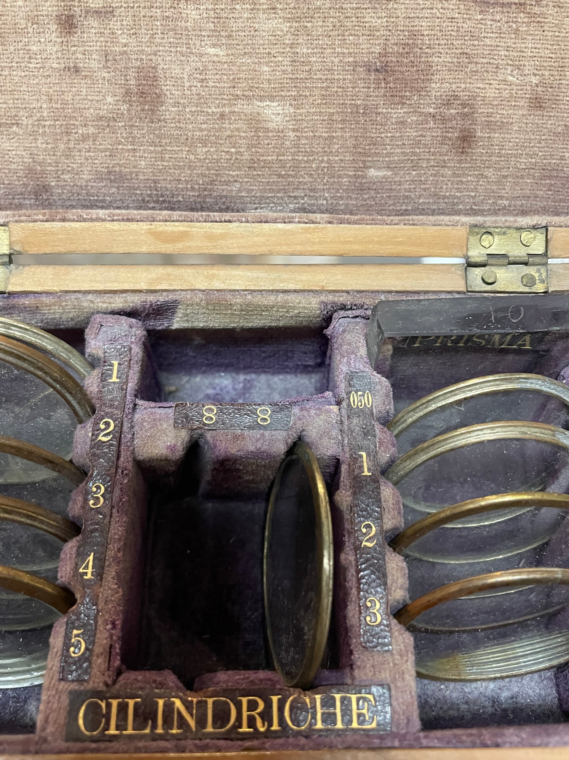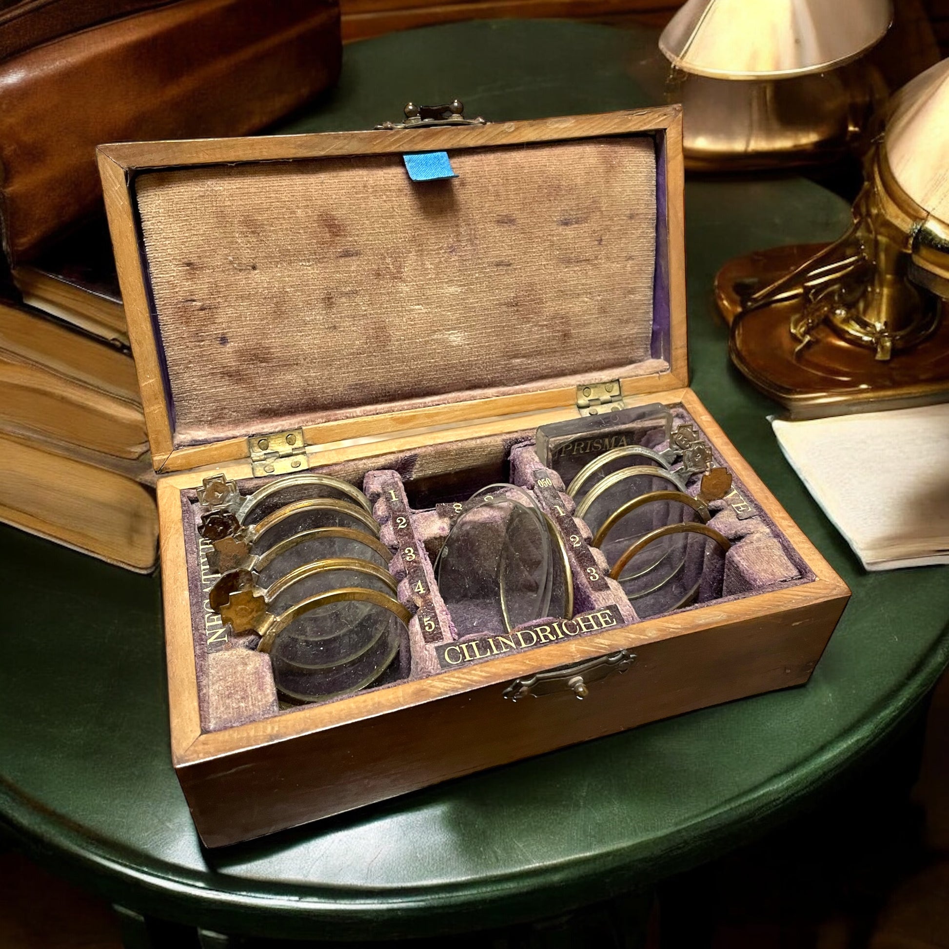 Antico set da ottico optometrista, lenti in cofanetto 1893