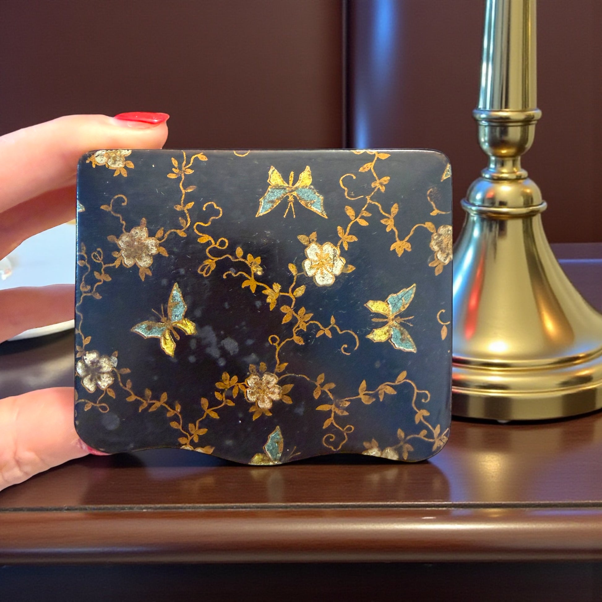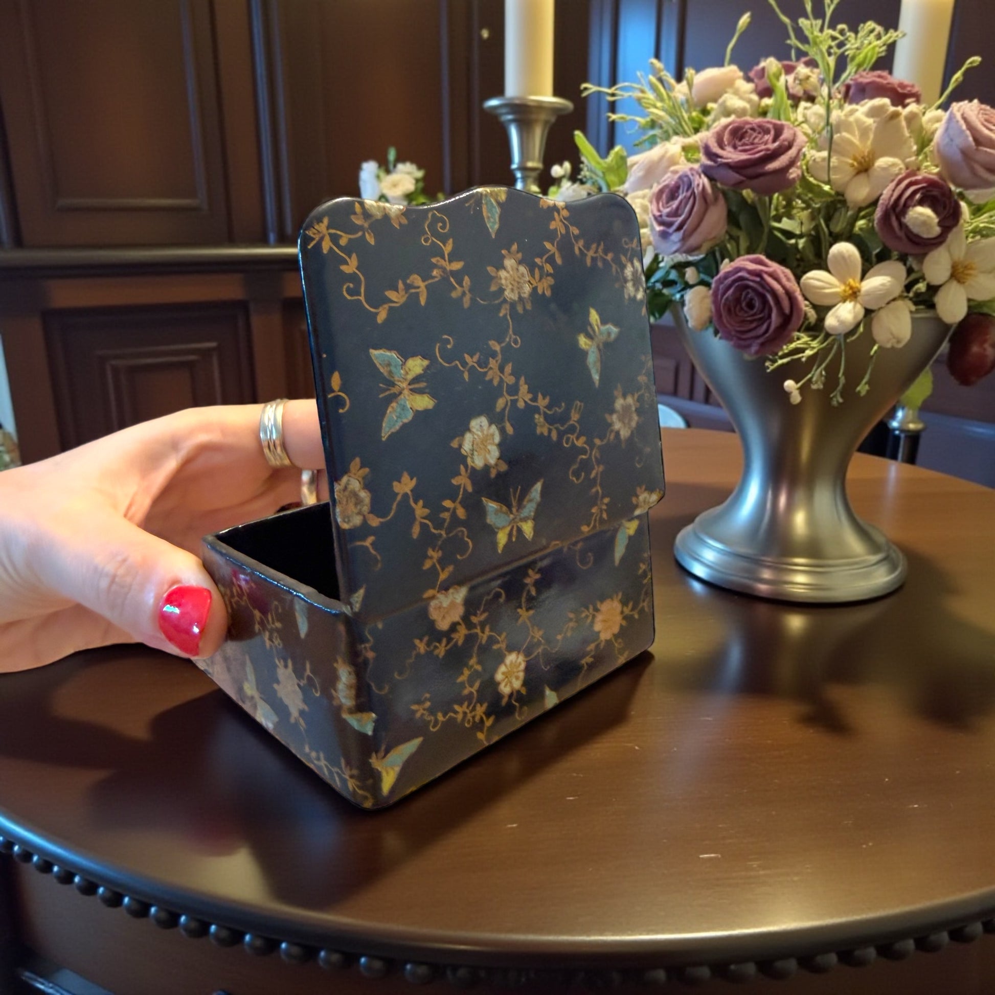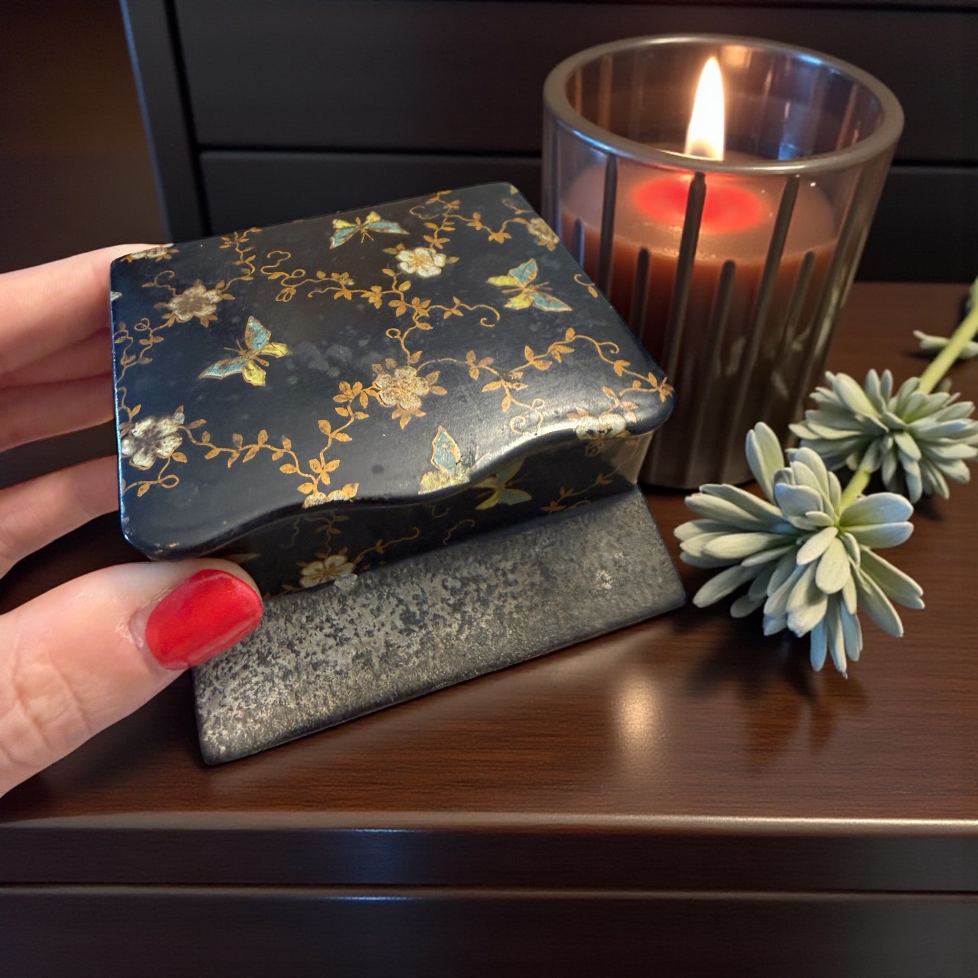 Vesta case / porta cerini. Materiale: papier mâché decorato. Epoca: fine XIX – primissimo XX secolo (ca. 1890–1910). Decorazione: fondo nero con motivi floreali dorati e farfalle. Caratteristica funzionale: fascia frontale con evidente usura da accensione cerini. Condizioni: buone, con segni del tempo coerenti con l’uso. Misure: larghezza 7,5 cm, profondità 7 cm (compresa la base scanalata), altezza 3,5 cm.