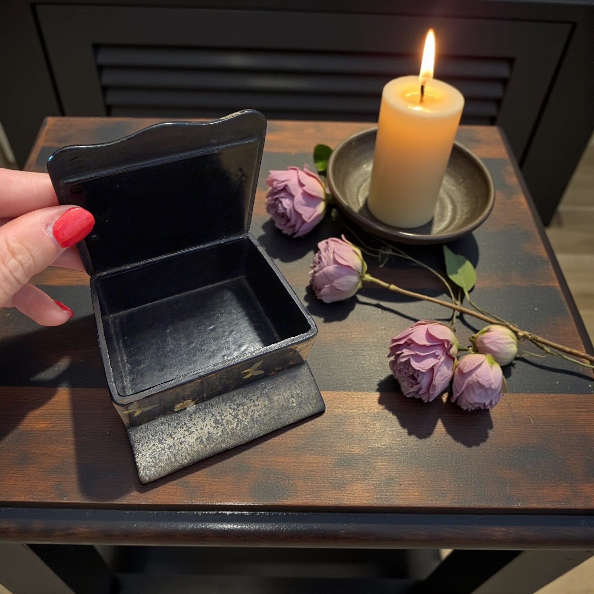 C’era un tempo in cui accendere una fiamma era un gesto lento, ripetuto, quotidiano. E questo piccolo oggetto lo ricorda ancora. Un vesta case in papier mâché, nero profondo, decorato con tralci dorati, fiori delicati e farfalle leggere, come sospese tra sera e notte. Ma ciò che lo rende davvero speciale è quella fascia frontale consumata, segnata da anni di sfregamenti: lì, centinaia di cerini hanno preso vita, uno dopo l’altro, illuminando tavoli, lampade, candele. Non è un semplice contenitore. È un oggetto pensato per l’uso, per stare accanto a una fiamma, su un mobile, su una toilette, vicino a una lampada a olio. La base scanalata lo rende stabile, l’interno è essenziale: tutto parla di funzione, non di ornamento superfluo… eppur non rinuncia ad essere incantevole. Le farfalle, dipinte con toni morbidi e leggermente ossidati dal tempo, raccontano una fase di passaggio stilistico, tra fine Ottocento e primo Novecento, quando anche gli oggetti più piccoli venivano pensati con grazia. Un vesta case che non ha bisogno di essere immaginato: si vede che ha vissuto.