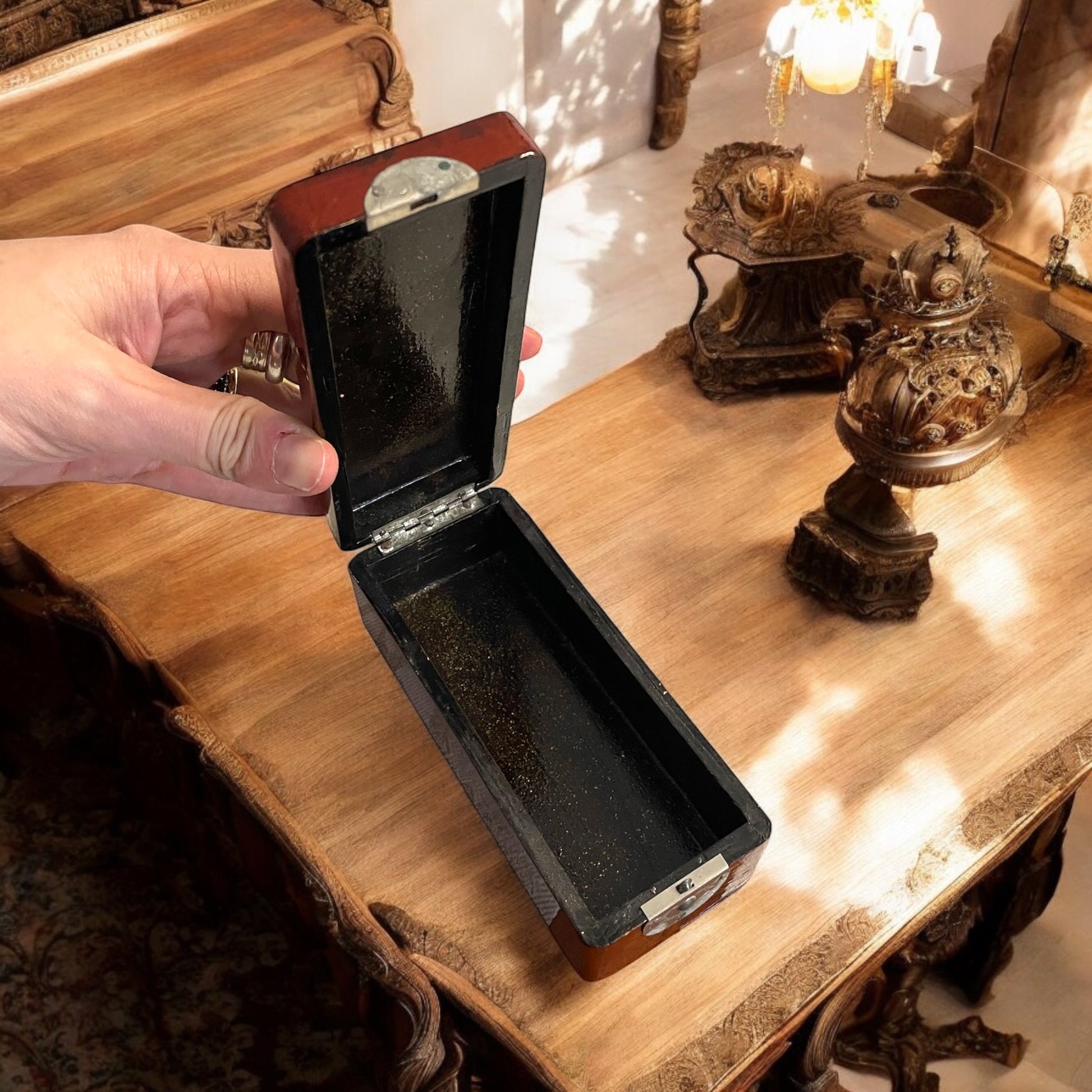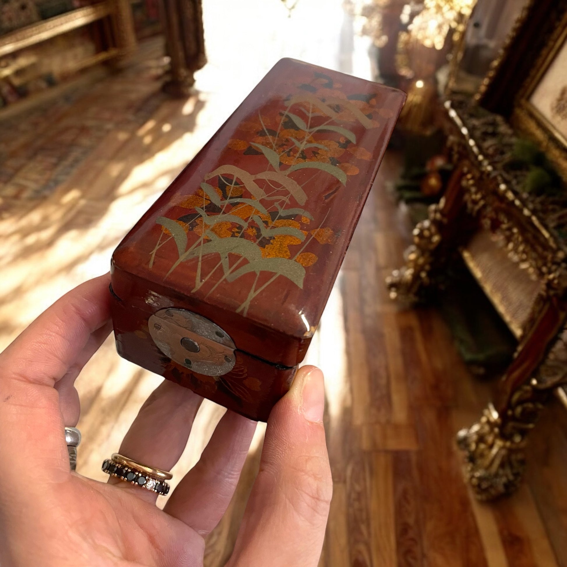 ✅ Astuccio da scrittura giapponese in lacca maki-e, inizi Novecento, tecnica che utilizza polveri d’oro e argento per creare eleganti motivi floreali su sfondo rosso-bruno. Dotato di serratura in metallo (non più funzionante). 13 x 5,3 cm.