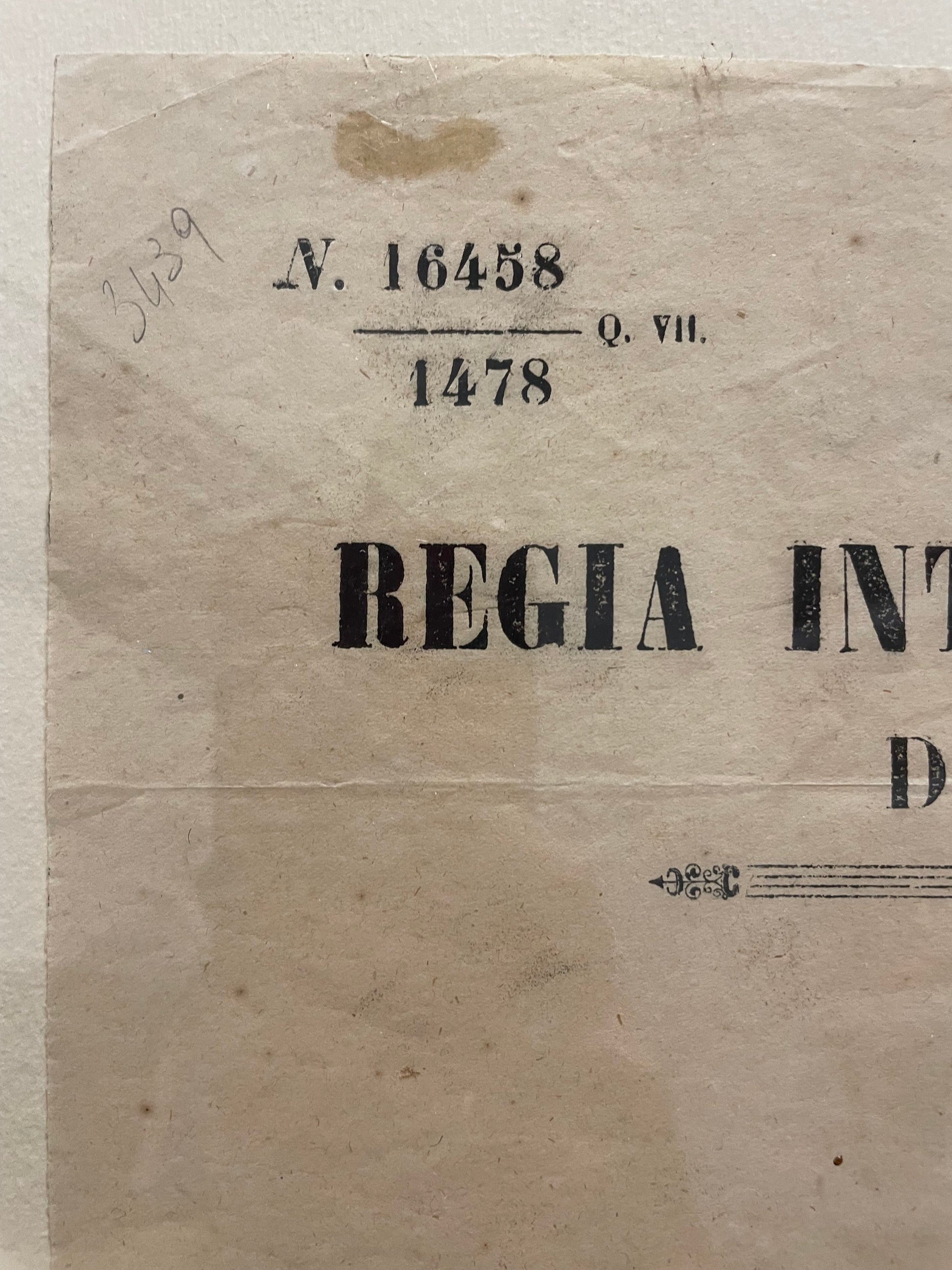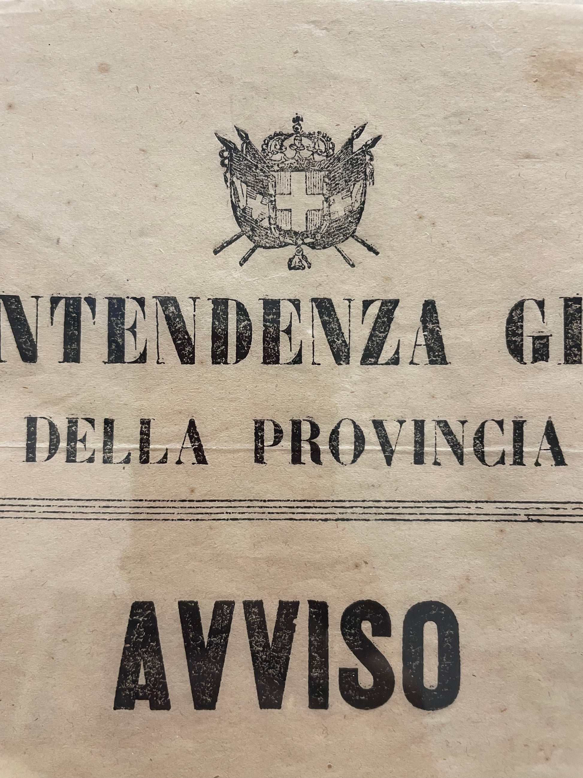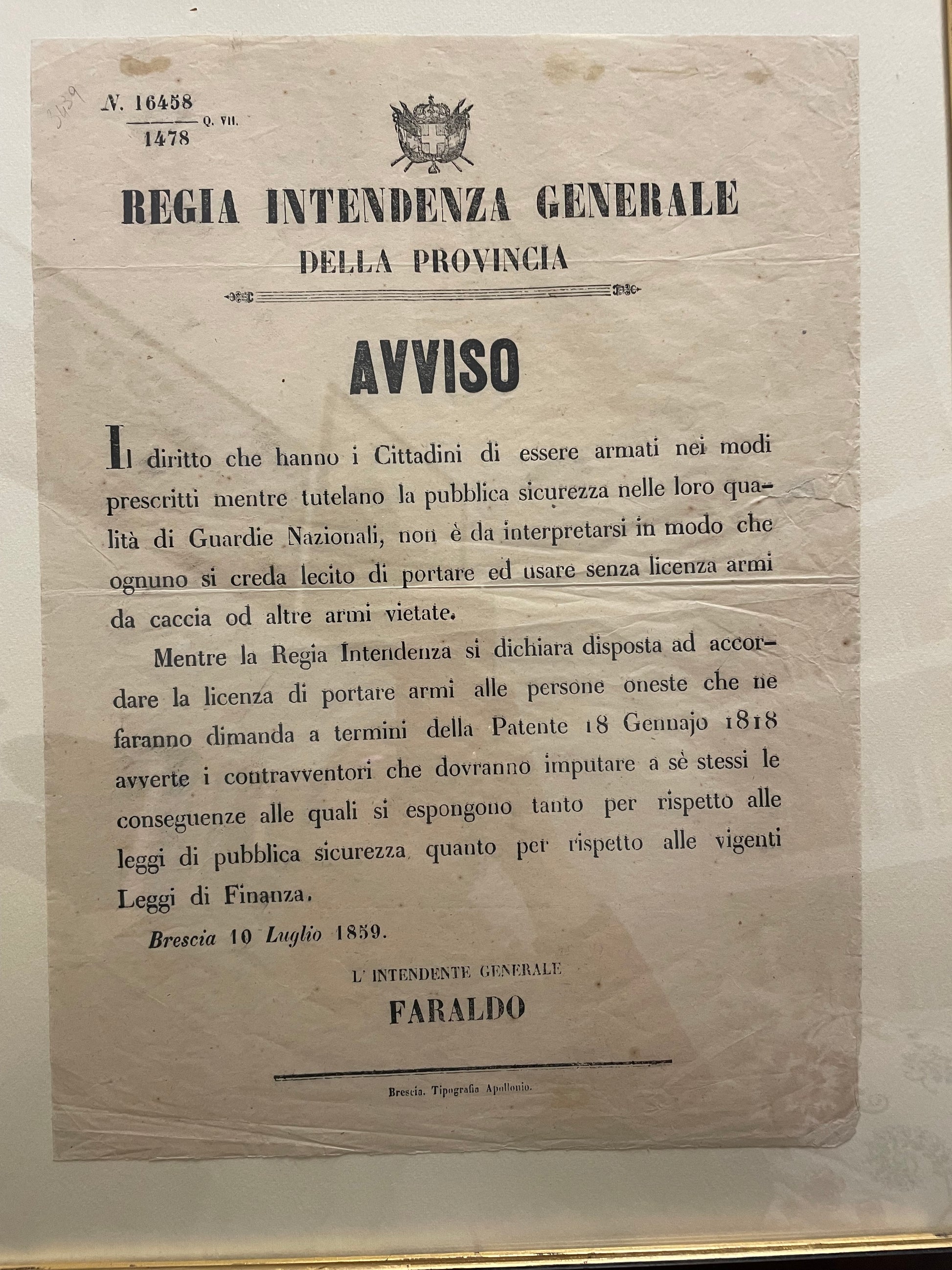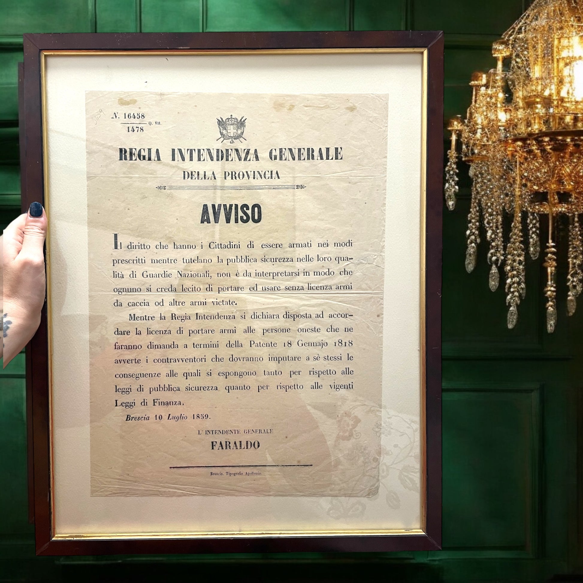 Un’autentica testimonianza del passato ci riporta indietro al XIX secolo: questo avviso in grande formato, rilasciato a Brescia il 10 luglio 1859, fu emesso dalla Regia Intendenza Generale a firma dell’intendente Faraldo. Si tratta di un documento ufficiale che regolamentava il porto d’armi, avvertendo i cittadini che il diritto di essere armati non autorizzava l’uso indiscriminato di armi da caccia o vietate senza licenza. L’avviso richiama esplicitamente la Patente del 18 gennaio 1818, sottolineando la necessità per le persone oneste di richiedere regolare licenza per portare armi, e ammonendo i trasgressori sulle conseguenze legali. L’anno 1859 è significativo per la storia d’Italia: siamo nel pieno della Seconda Guerra d’Indipendenza, che culminerà con la vittoria franco-piemontese contro gli austriaci e la cessione della Lombardia al Regno di Sardegna. Brescia, già nota per le Dieci Giornate del 1849, aveva una forte tradizione insurrezionale e un alto livello di tensione politica e sociale. È probabile che questo avviso nascesse proprio da una crescente necessità di controllo delle armi in un periodo di fermento patriottico e rivoluzionario. Il documento, di valore storico, è montato in una cornice moderna che, pur non d’epoca, si presenta discreta ed essenziale. La carta del retro della cornice è mancante. Dimensioni con cornice: cm 53,5 x 42,5.