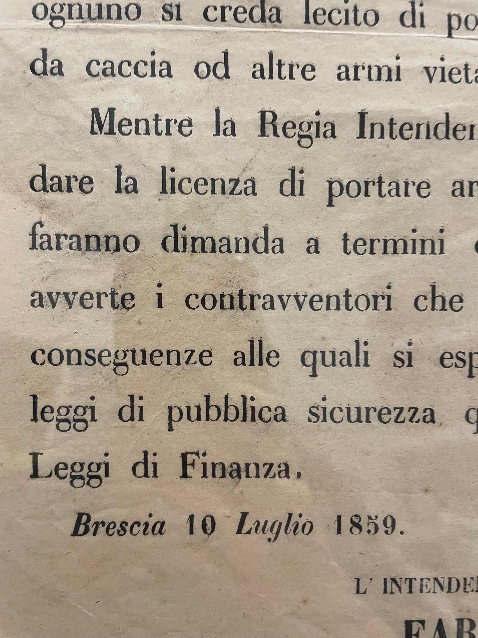 Avviso Regio Brescia 1859 sulla detenzione di armi, documento originale