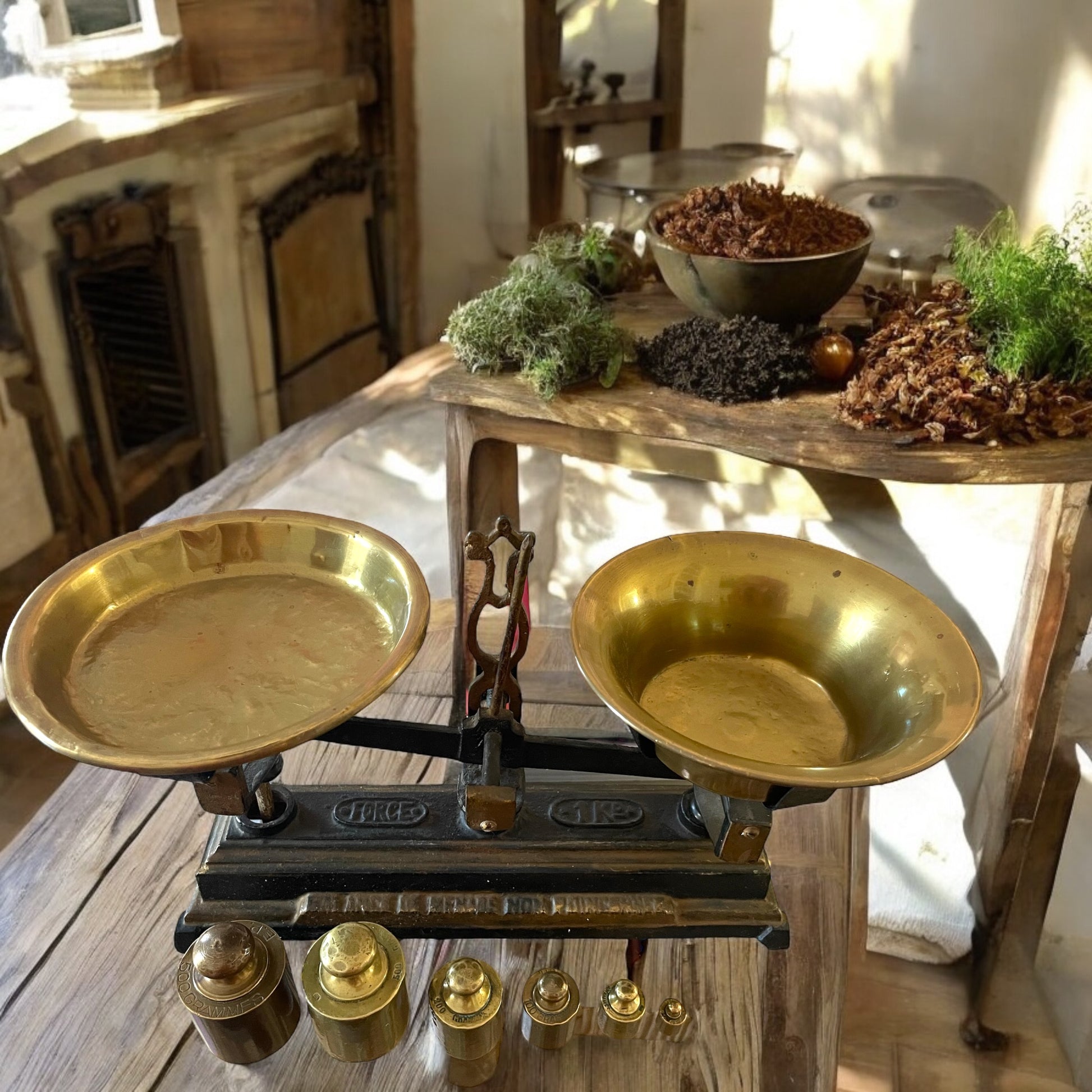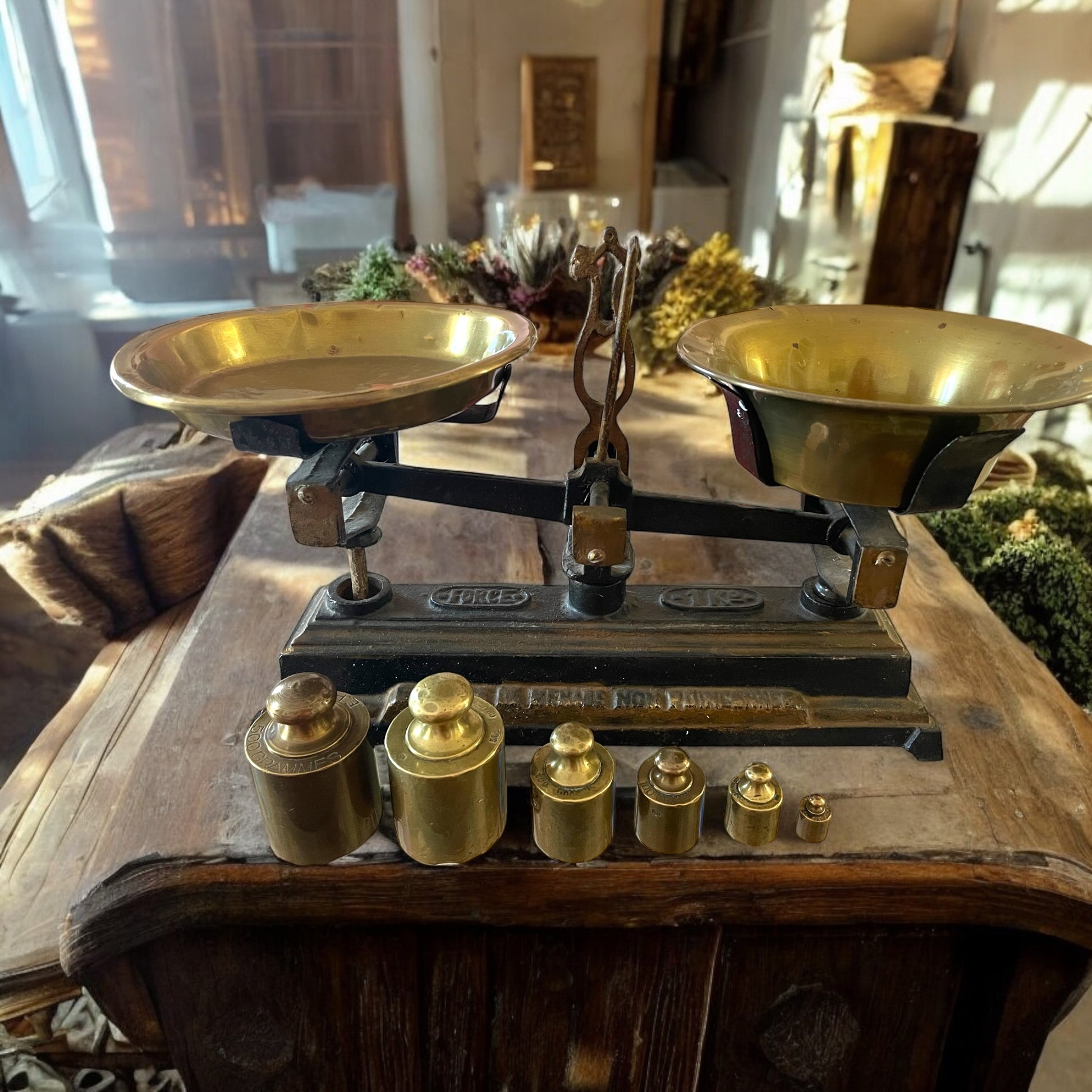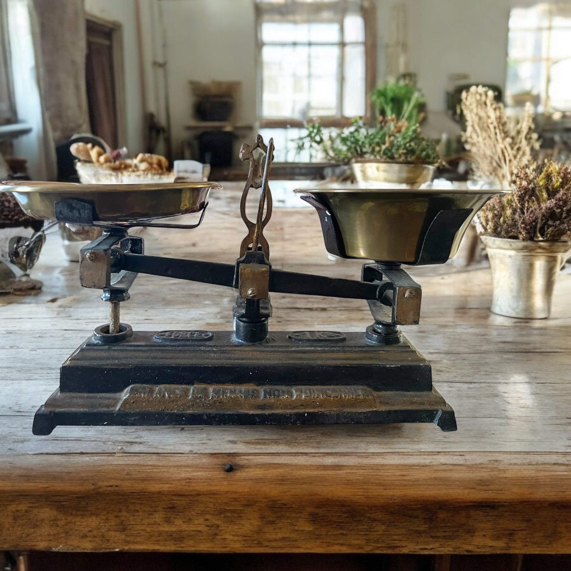 Questa meraviglia degli inizi del Novecento sembra uscire da un antico negozio di spezie, dove il tempo si mescolava ai profumi intensi di cannella, chiodi di garofano e pepe nero. I suoi piatti – un piatto concavo per accogliere spezie sfuse e un piatto di pesata perfetto per misurare con precisione le quantità – sono lucenti e carichi di storia, riflettono il mestiere di mani esperte che bilanciavano aromi preziosi con gesti antichi e misurati. Il corpo in ghisa, solido e intramontabile, trasmette l’eleganza della funzionalità, riportandoci a un’epoca in cui ogni oggetto era costruito per durare. Insieme ai suoi pesi originali, questa bilancia ci invita a rivivere un tempo in cui il valore delle cose si misurava con cura e lentezza, al ritmo delle storie che solo un emporio pieno di Vita e di vite poteva raccontare. Le dimensioni: lunghezza tot 32.5 cm altezza 20 cm