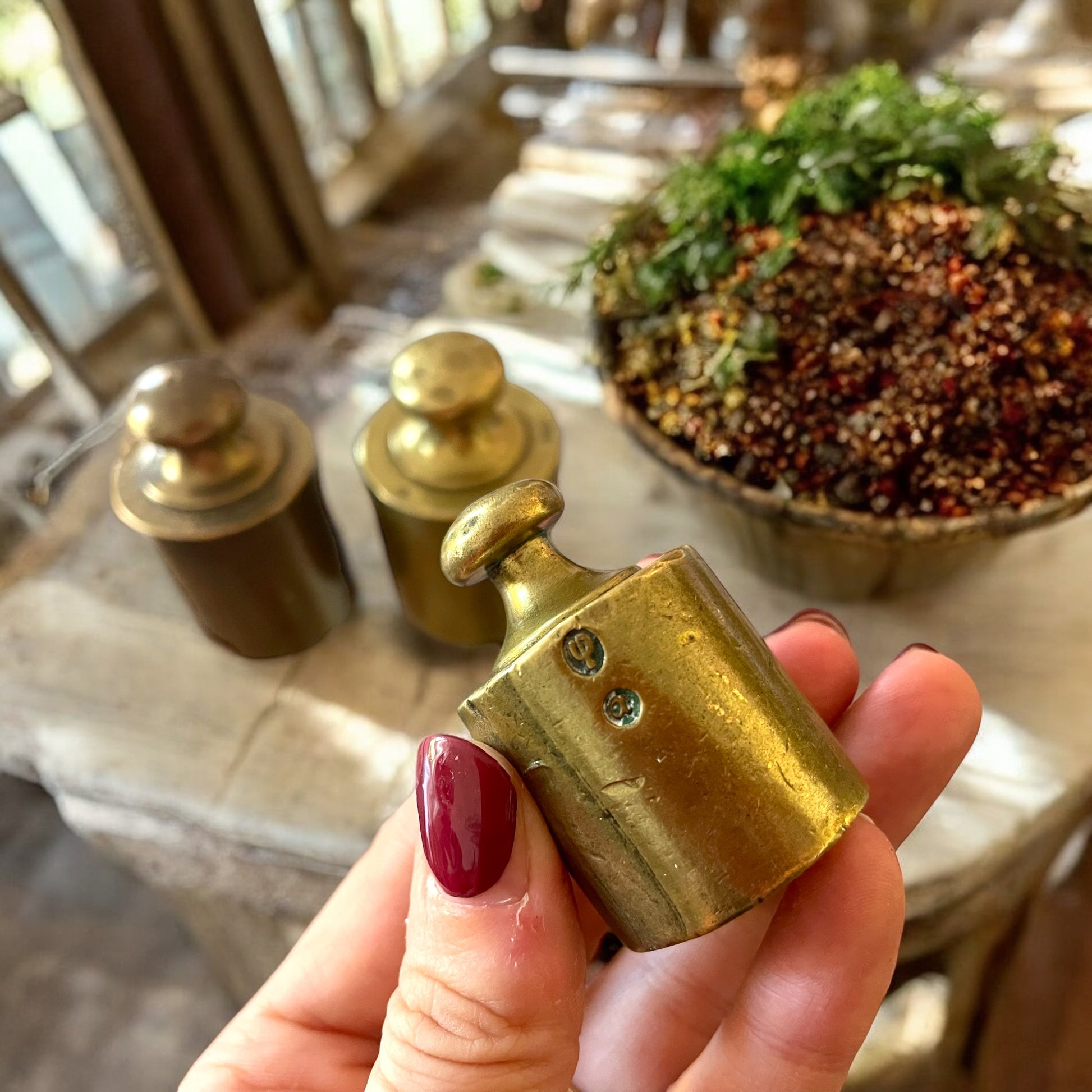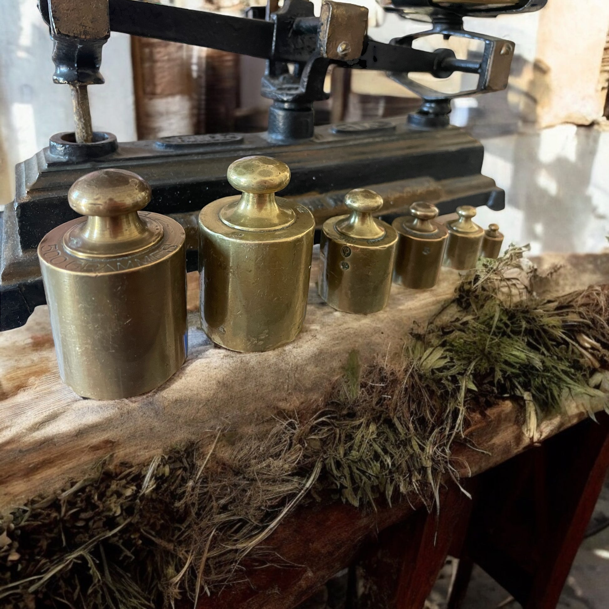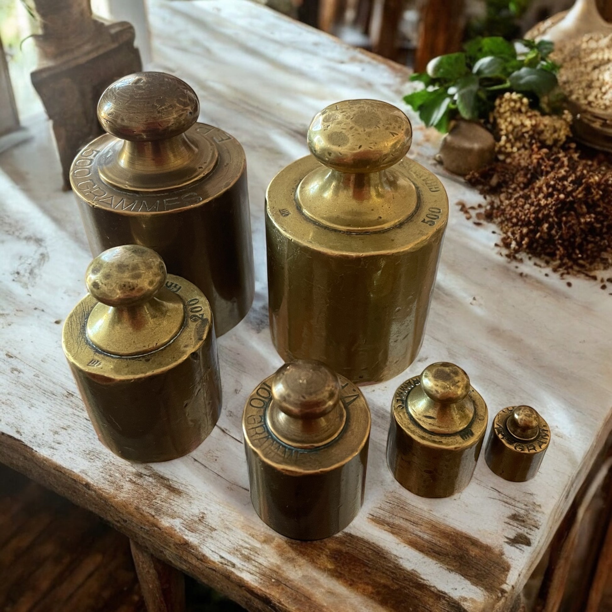Questa meraviglia degli inizi del Novecento sembra uscire da un antico negozio di spezie, dove il tempo si mescolava ai profumi intensi di cannella, chiodi di garofano e pepe nero. I suoi piatti – un piatto concavo per accogliere spezie sfuse e un piatto di pesata perfetto per misurare con precisione le quantità – sono lucenti e carichi di storia, riflettono il mestiere di mani esperte che bilanciavano aromi preziosi con gesti antichi e misurati. Il corpo in ghisa, solido e intramontabile, trasmette l’eleganza della funzionalità, riportandoci a un’epoca in cui ogni oggetto era costruito per durare. Insieme ai suoi pesi originali, questa bilancia ci invita a rivivere un tempo in cui il valore delle cose si misurava con cura e lentezza, al ritmo delle storie che solo un emporio pieno di Vita e di vite poteva raccontare. Le dimensioni: lunghezza tot 32.5 cm altezza 20 cm
