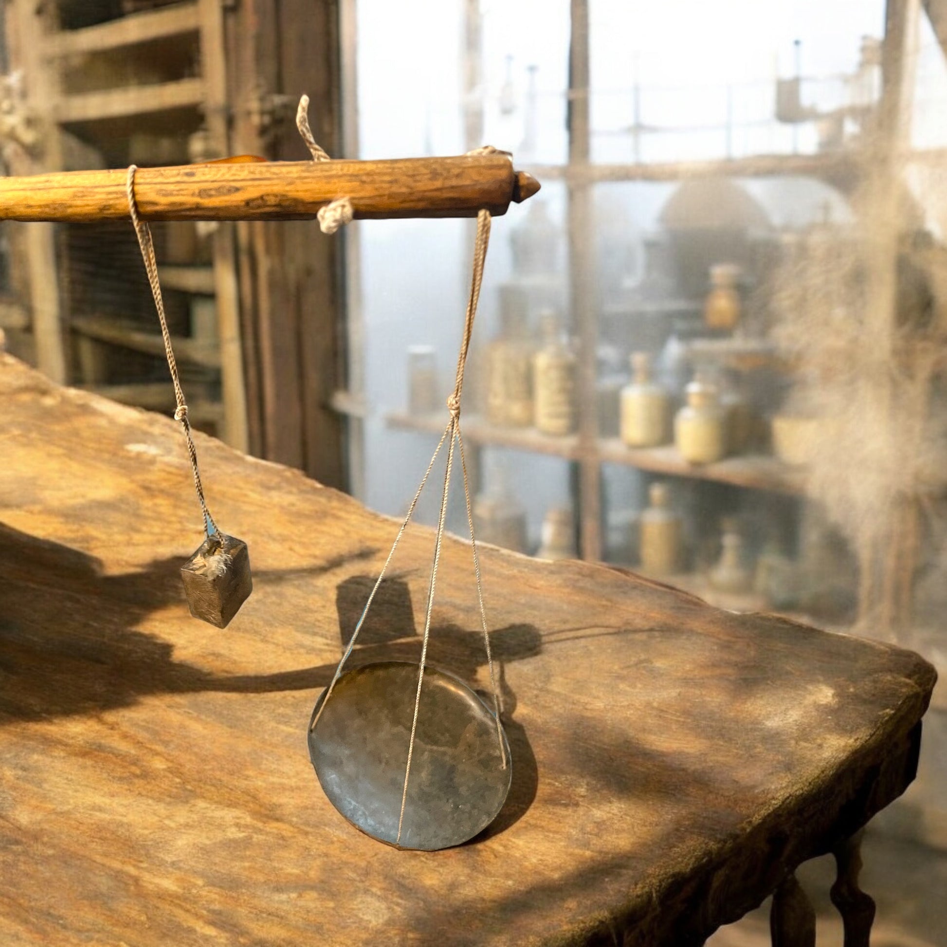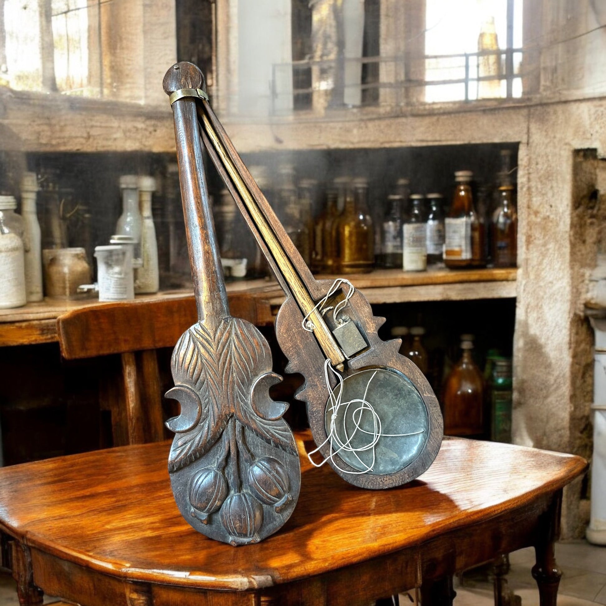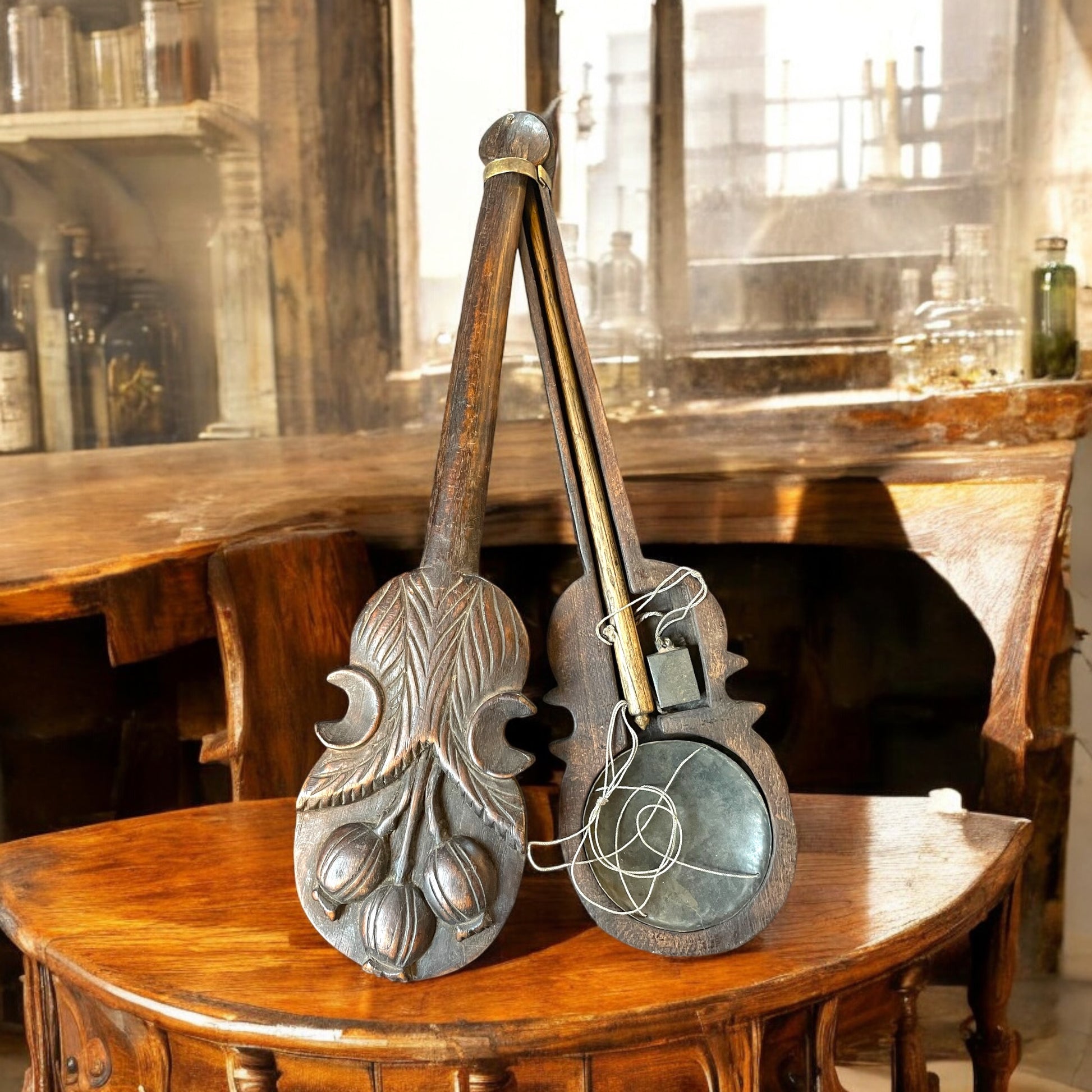 Bilancia da viaggio con piatto e peso per oppio, in scrigno deliziosamente lavorato a mano con intagliati a rilievo fiori di oppio, conservata veramente come un piccolo tesoro. Ritirata in Europa da villa di collezionista viaggiatore; è infatti di manifattura orientale. Bellissimo esemplare da collezione, nonché curioso oggetto da wunderkammer. Lunghezza scrigno cm 37; si chiude con un anello in ottone da far scivolare lungo il manico.