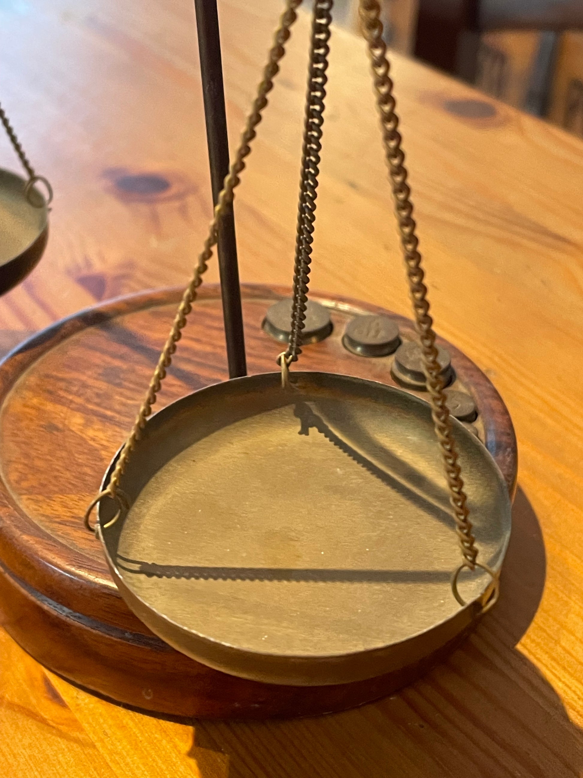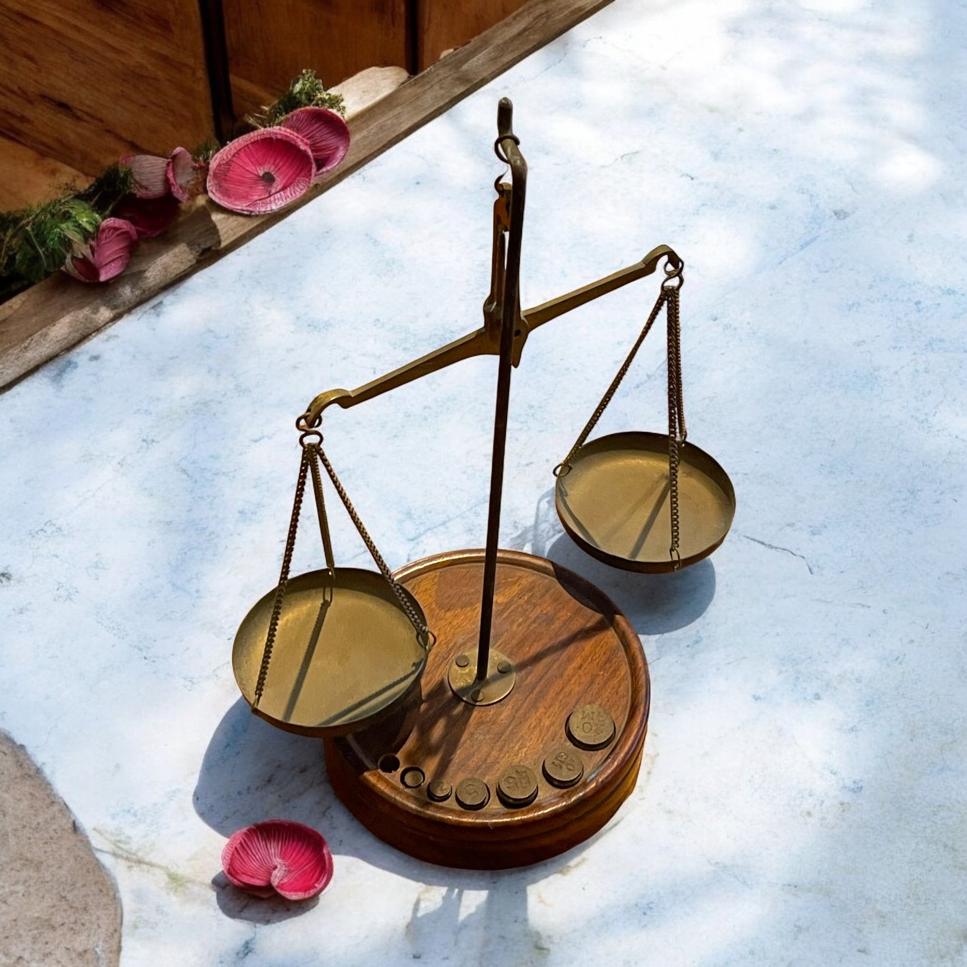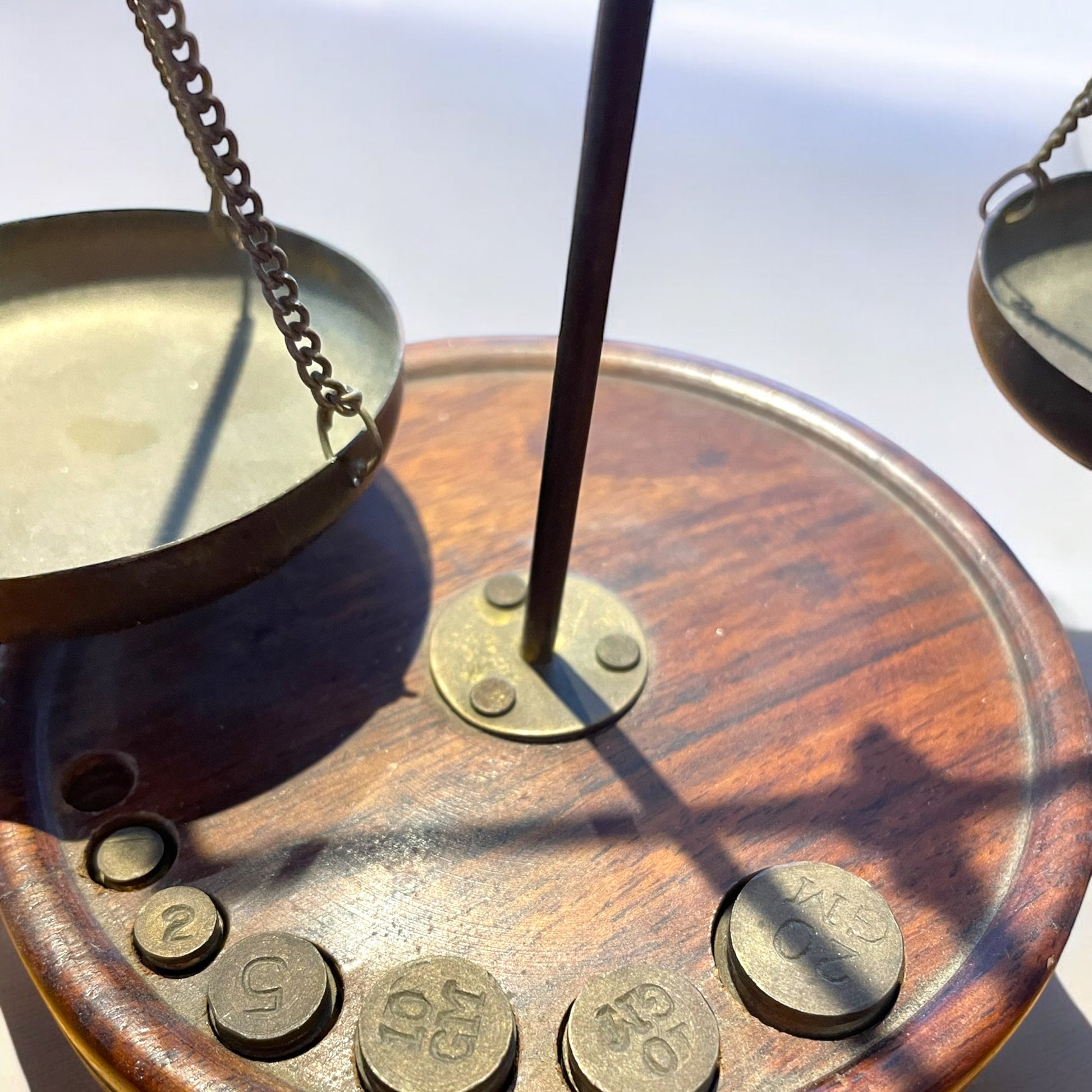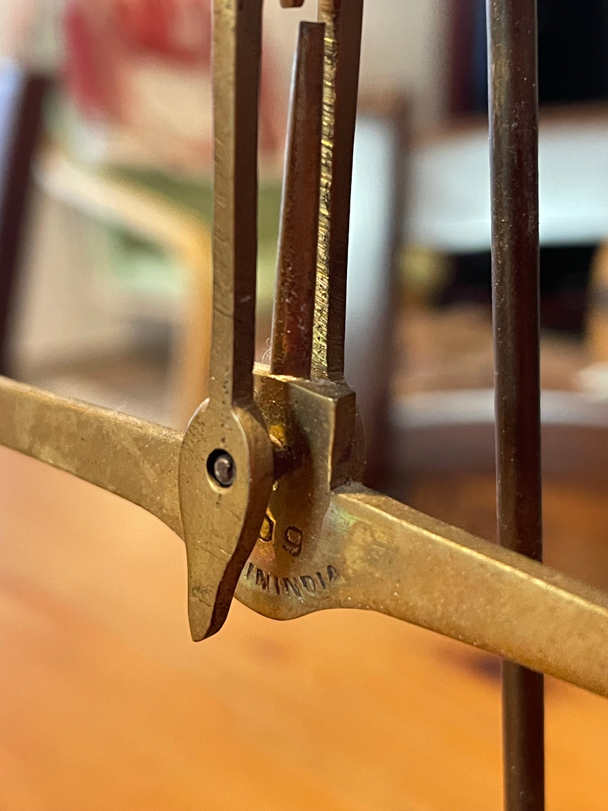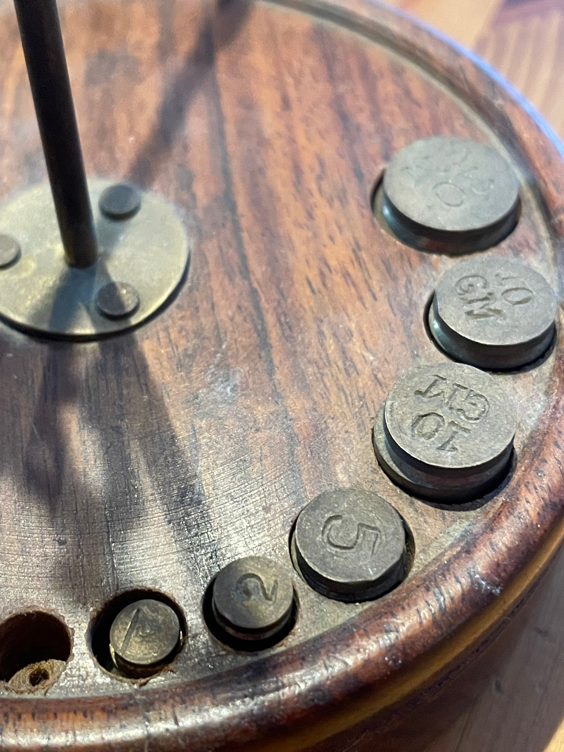 Bilancina tradizionale da orafo con base in legno e asta smontabile, da viaggio, con i propri pesi allocati negli appositi vani rispettivamente da 20g, 2X10g, 5, 2, 1. Manca il più piccino da 0,5 g. Oggetto molto curioso, manifattura indiana come riportato inciso sull’asta.