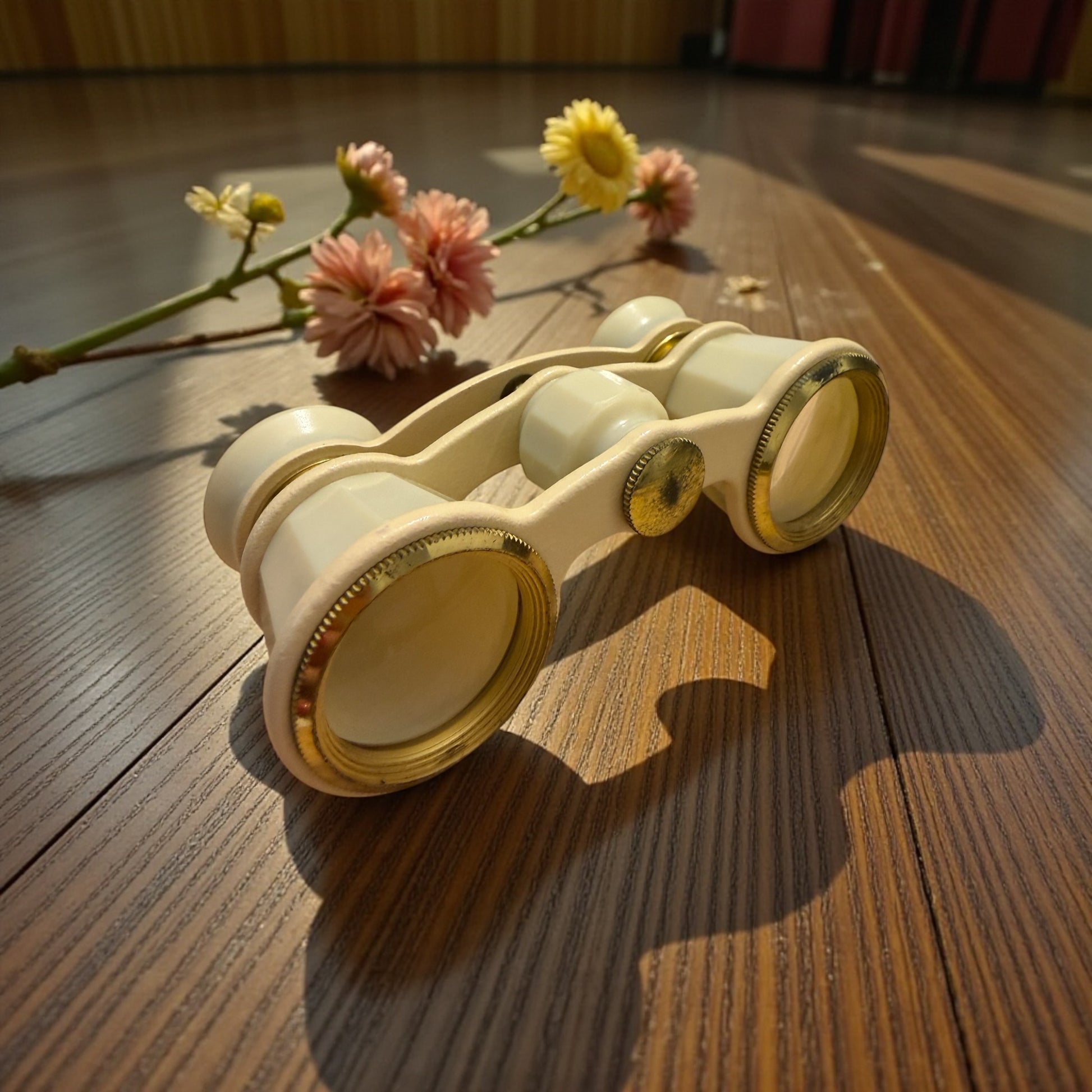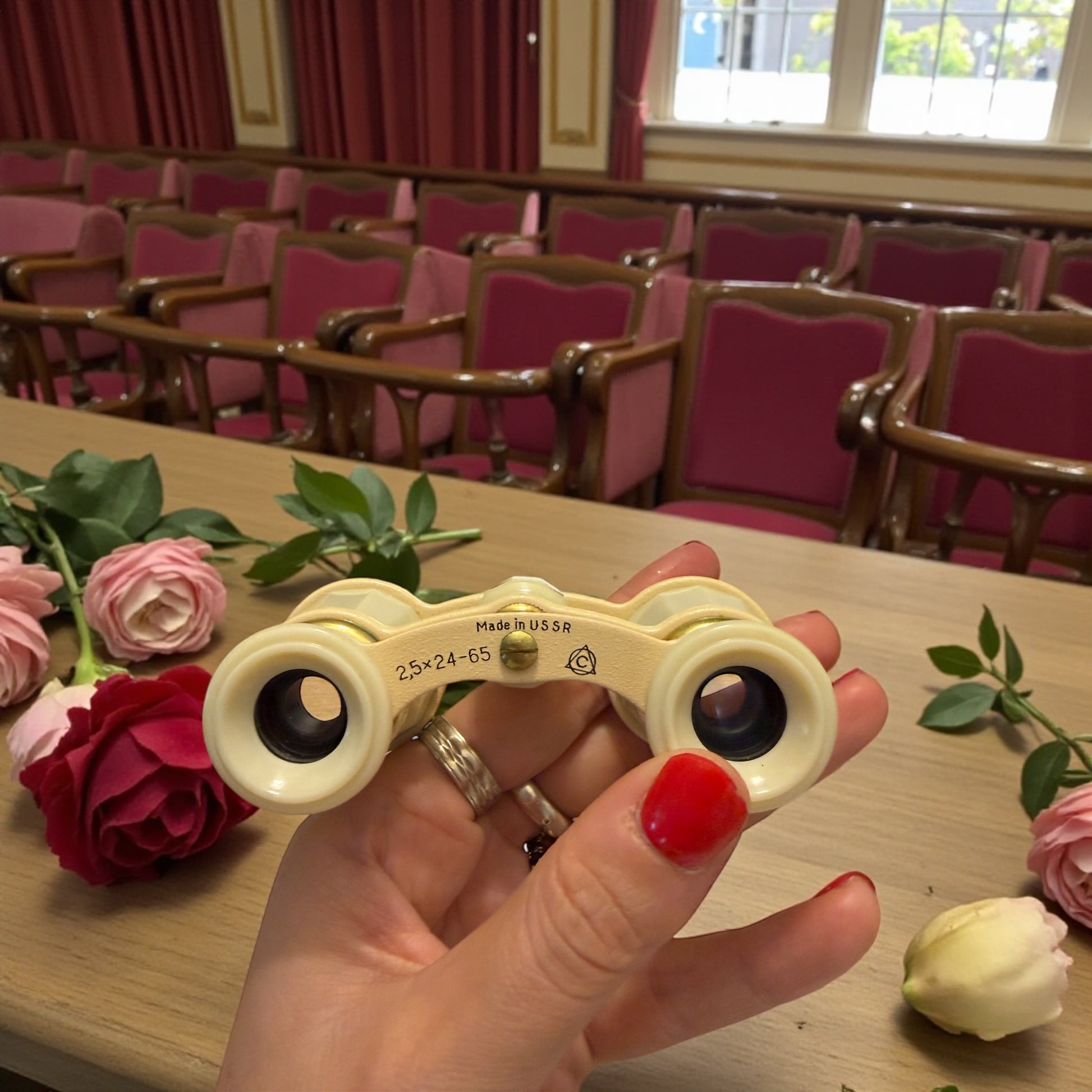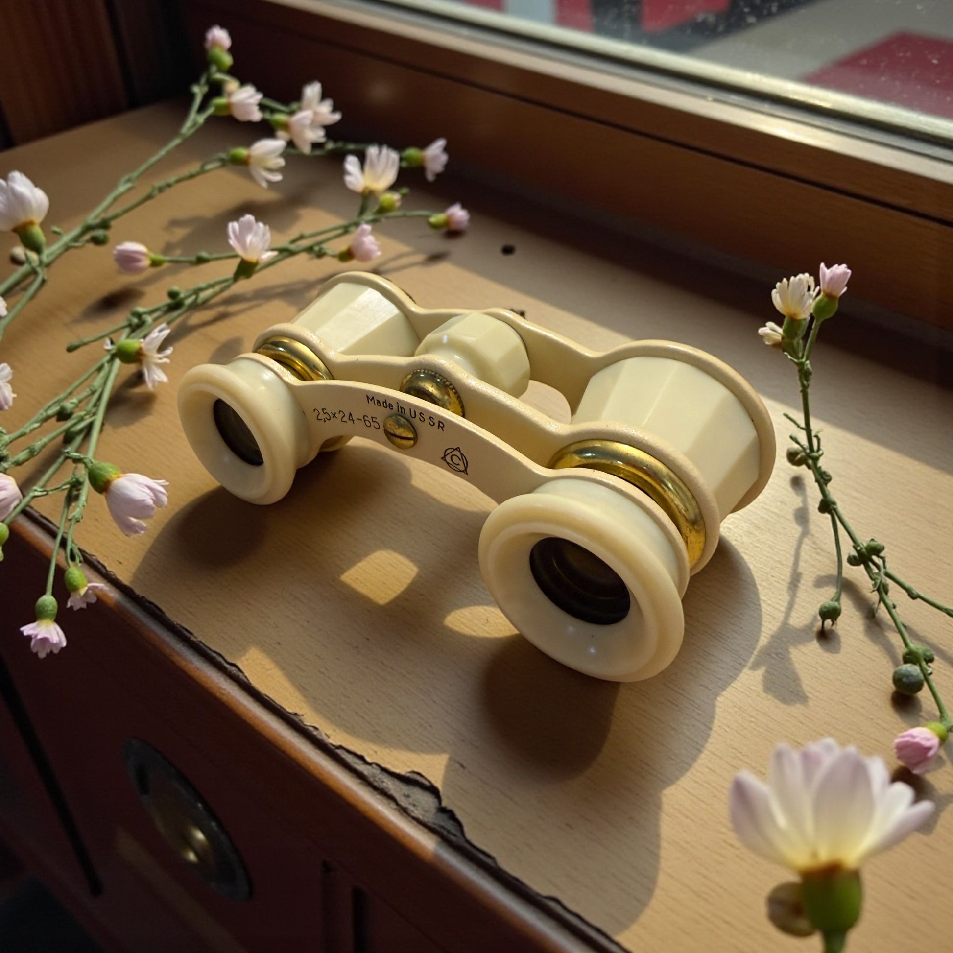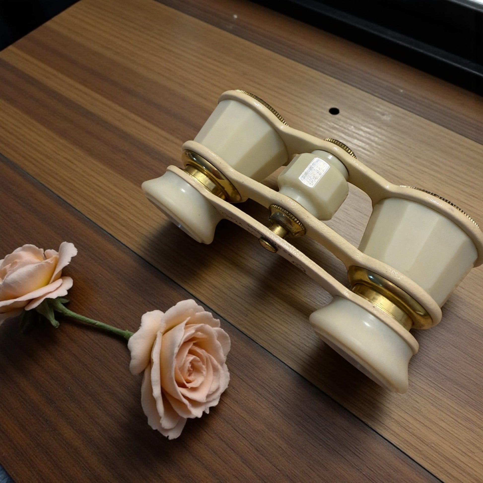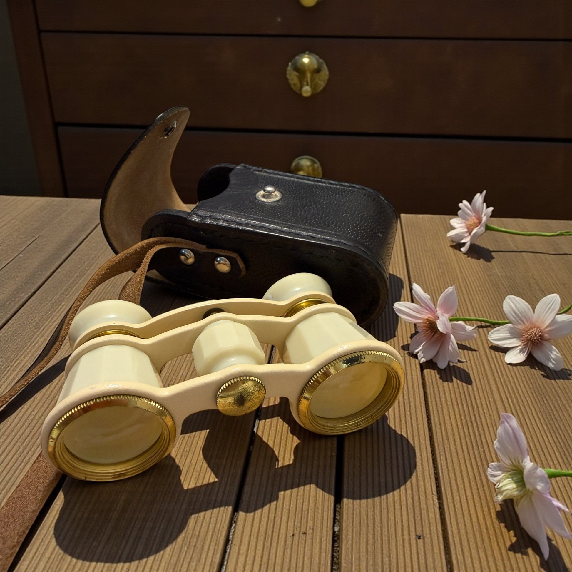 Arriva da un tempo in cui il teatro non si guardava da lontano: si abitava con gli occhi. Questo binocolo da teatro sovietico sembra nato proprio per questo: accompagnare lo sguardo con discrezione, senza invaderlo. Il corpo color avorio, morbido alla luce e quasi lattiginoso in controluce, restituisce quella particolare profondità visiva tipica dei materiali plastici d’epoca – una qualità che nulla ha a che spartire ahimè con quanto produciamo oggi. Tra le mani sono solidi, equilibrati, eleganti. Il metallo verniciato di bianco dialoga con l’ottone, che emerge nei dettagli con una patina calda e autentica. L’ingrandimento è volutamente contenuto: 2,5x, perfetto per il teatro, l’opera, i concerti, dove non serve avvicinarsi troppo ma vedere meglio. Prodotti nell’ex Unione S., quando anche gli oggetti d’uso quotidiano dovevano durare nel tempo, sono arrivati fino a oggi perfettamente funzionanti, completi della loro custodia originale. Un oggetto che non alza la voce, ma accompagna: come un gesto educato in platea, come un silenzio condiviso prima che si alzi il sipario.