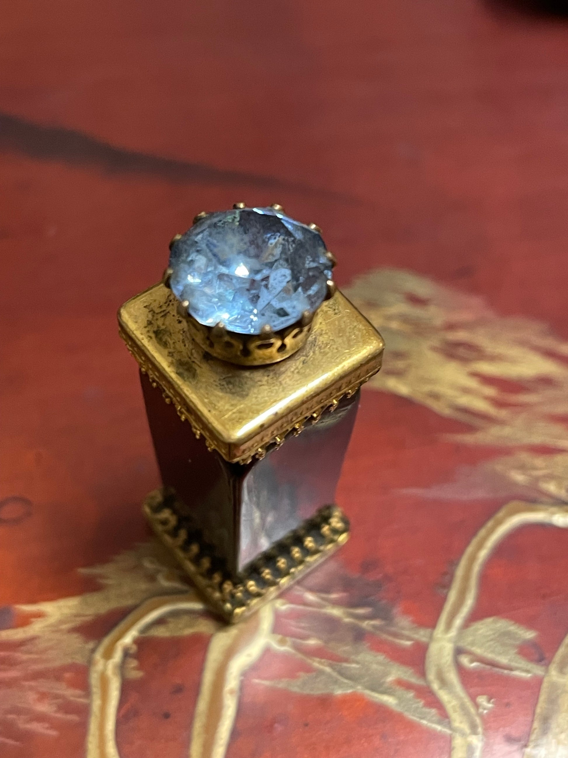 Piccola boccetta da profumo, anni 50-60, in vetro scuro con montatura in ottone dorato. Tappo con strass sfaccettato e dettagli cesellati. Elegante e decorativa, perfetta per collezionisti di oggetti vintage.