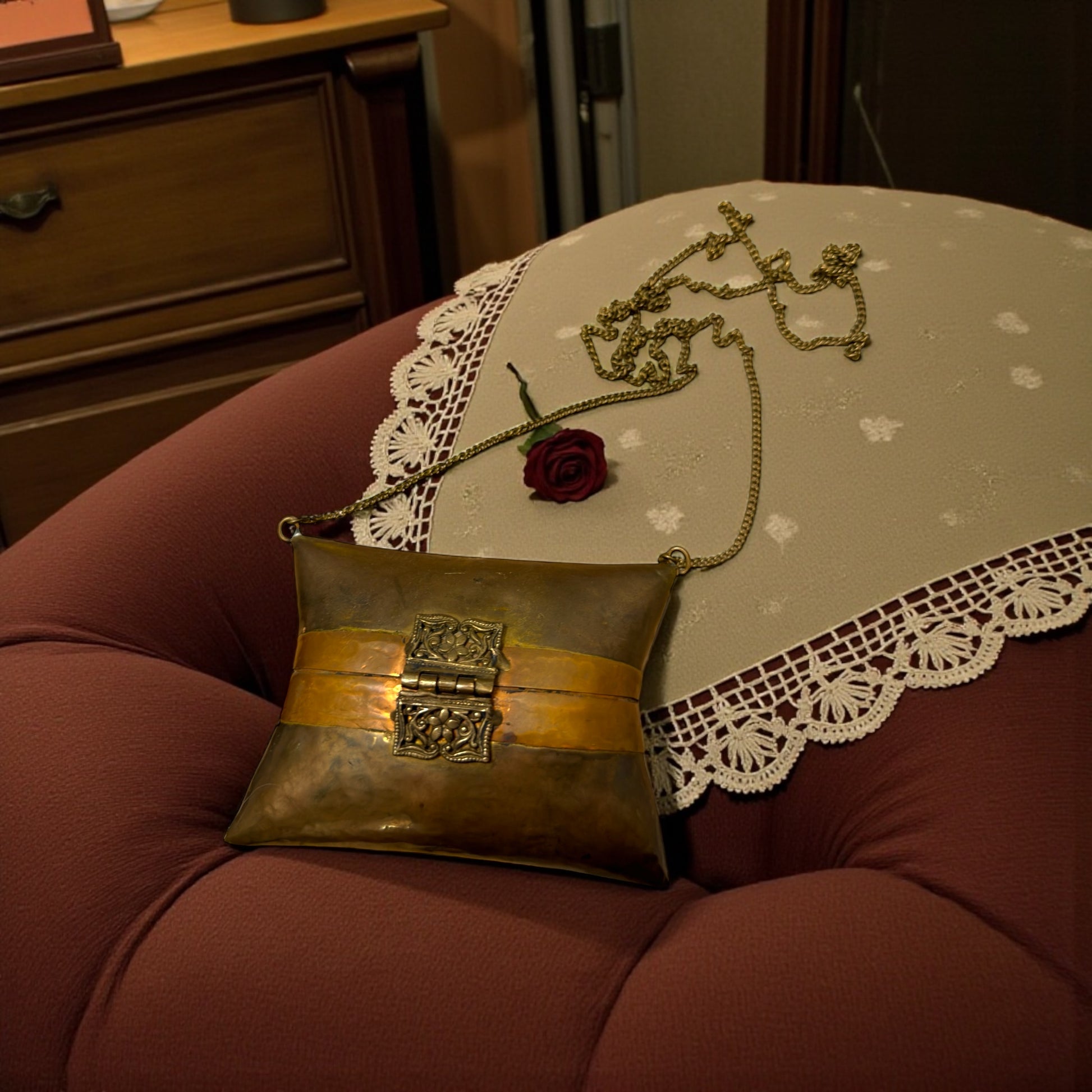 La prima volta che ho preso in mano questa piccola borsetta in rame, ho avuto l’impressione di toccare un frammento di serata lontana, come se un’eco di musica e passi leggeri fosse rimasta intrappolata nei suoi spigoli perfetti. È sorprendente quanto sia solida ma leggera allo stesso tempo: si percepisce subito che è stata modellata a mano, con quella cura antica che non aveva fretta. La sua forma a cuscino, così particolare e armoniosa, racconta uno stile elegante e vivace, pienamente Liberty, con linee morbide che invitano lo sguardo a seguirle.La fascia centrale in rame più chiaro sembra quasi una cintura di luce, e la chiusura lavorata – un piccolo gioiello in ottone floreale – si apre ancora oggi con un gesto fluido, come se stesse aspettando qualcuno che conosceva molto bene. Dentro, il velluto blu profondo crea un contrasto meraviglioso: sembra custodire lo spazio per segreti minuscoli, un rossetto d’epoca, una lettera piegata, un nome da ricordare. Mentre la sollevo con la catenella, sento immediatamente l’effetto di quel modo unico che hanno questi oggetti: portarti indietro nel tempo senza chiederti il permesso, lasciandoti immaginare la storia di chi l’ha indossata prima di te. Magari una giovane donna in un teatro della Belle Époque, forse una serata d’inverno in cui il rame rifletteva le luci calde dell’atrio. Questa borsetta è così: non fa rumore, ma invita piano a immaginare. E quando la tieni tra le mani, senti subito che non è soltanto un oggetto antico — è un dettaglio di vita rimasto intatto.