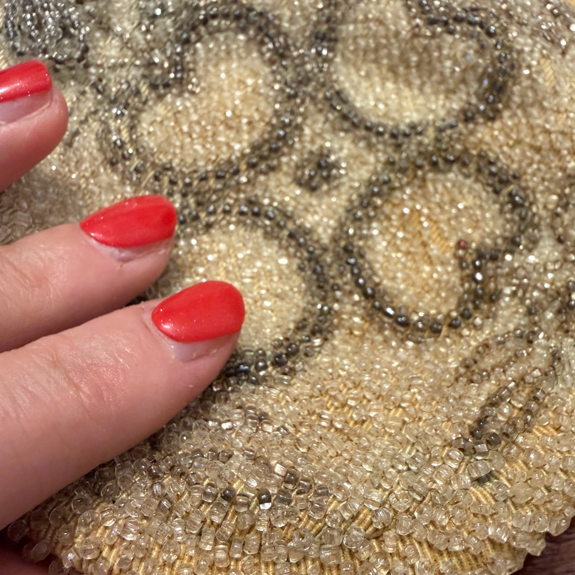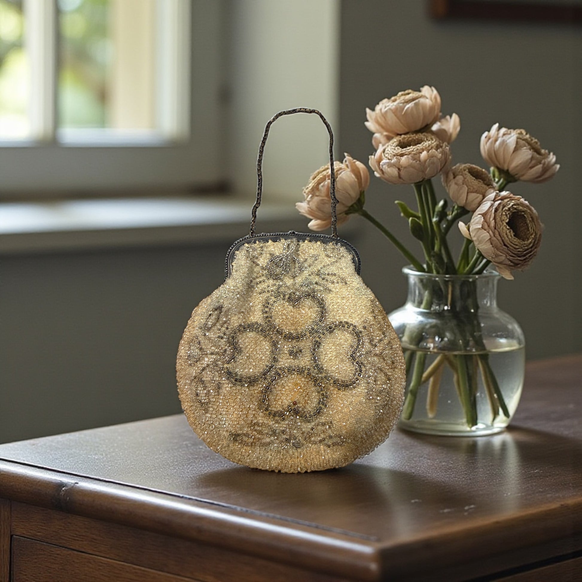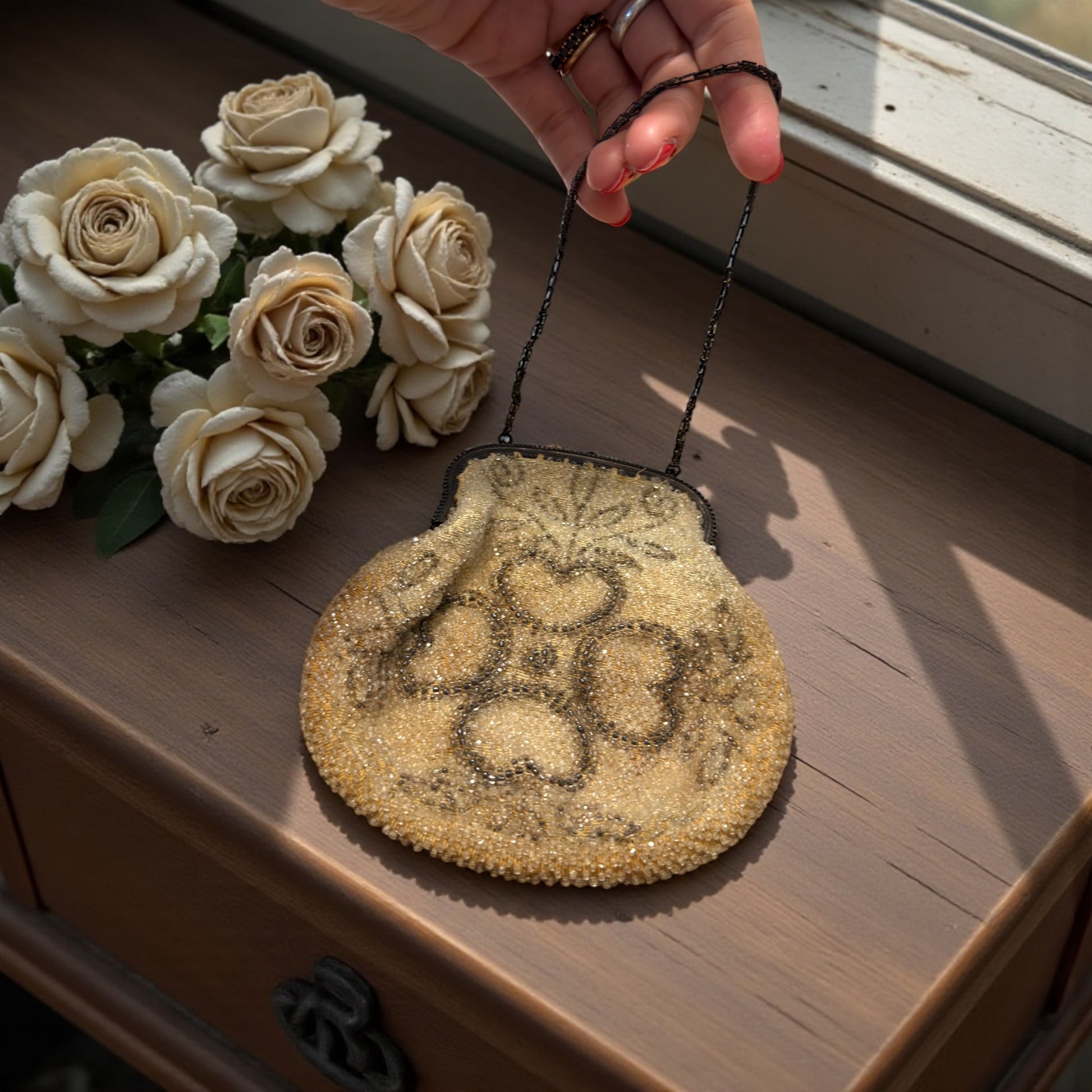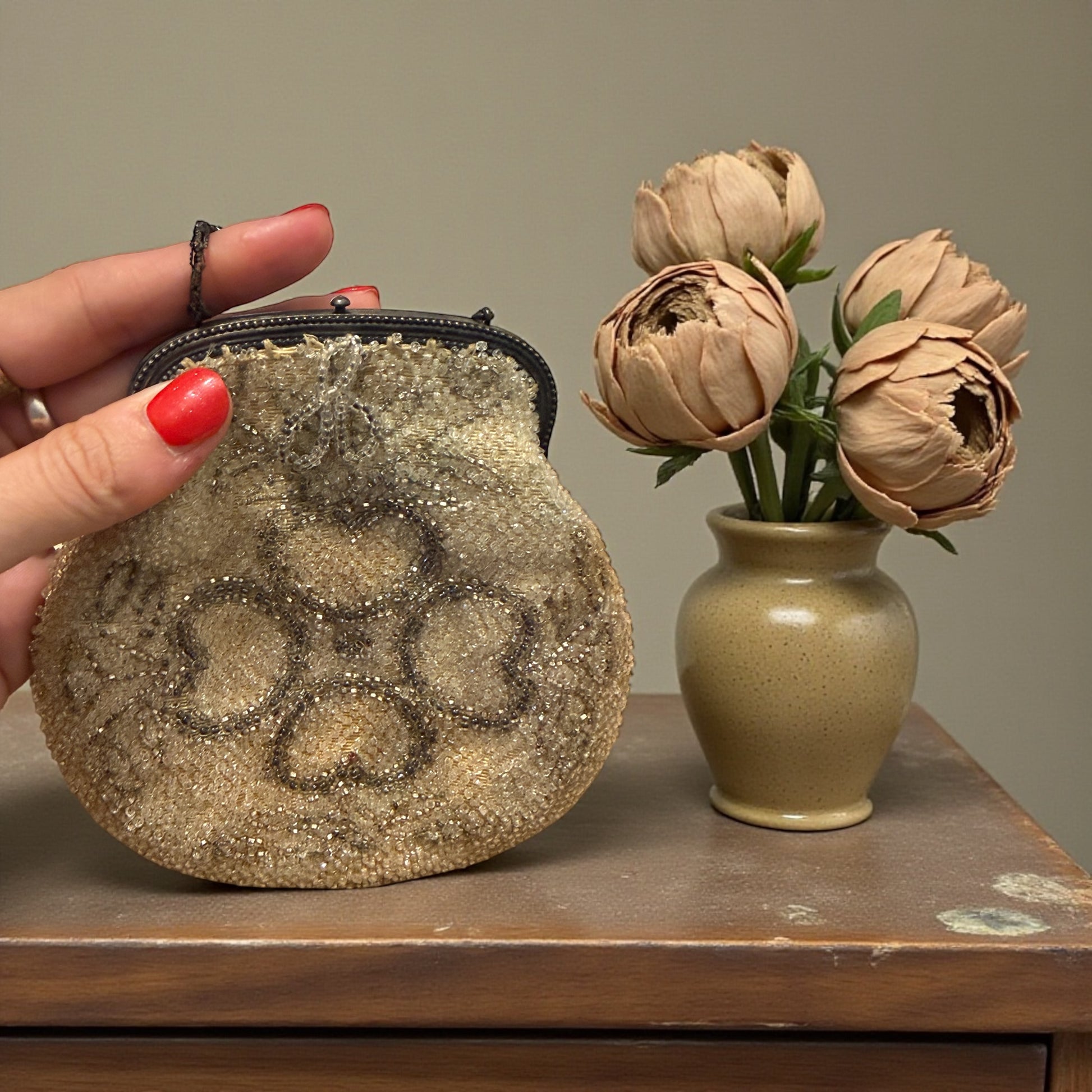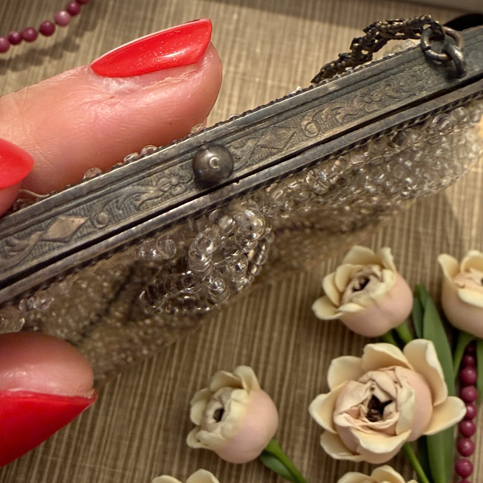 Borsetta da polso / evening bag. Epoca: primi decenni del ’900 (circa 1910–1925). Materiali: perline di vetro, struttura tessile, chiusura in metallo inciso. Interno: 3 scomparti rifiniti in seta. Chiusura: scatto a pressione. Dimensioni (senza catenella): 13 x 13,5 cm. Condizioni: ottime; presenti macchie interne coerenti con l’uso (trucco), esterno ben conservato. Provenienza: Francia.