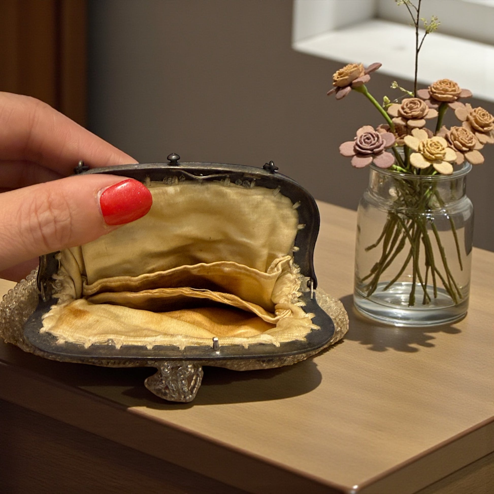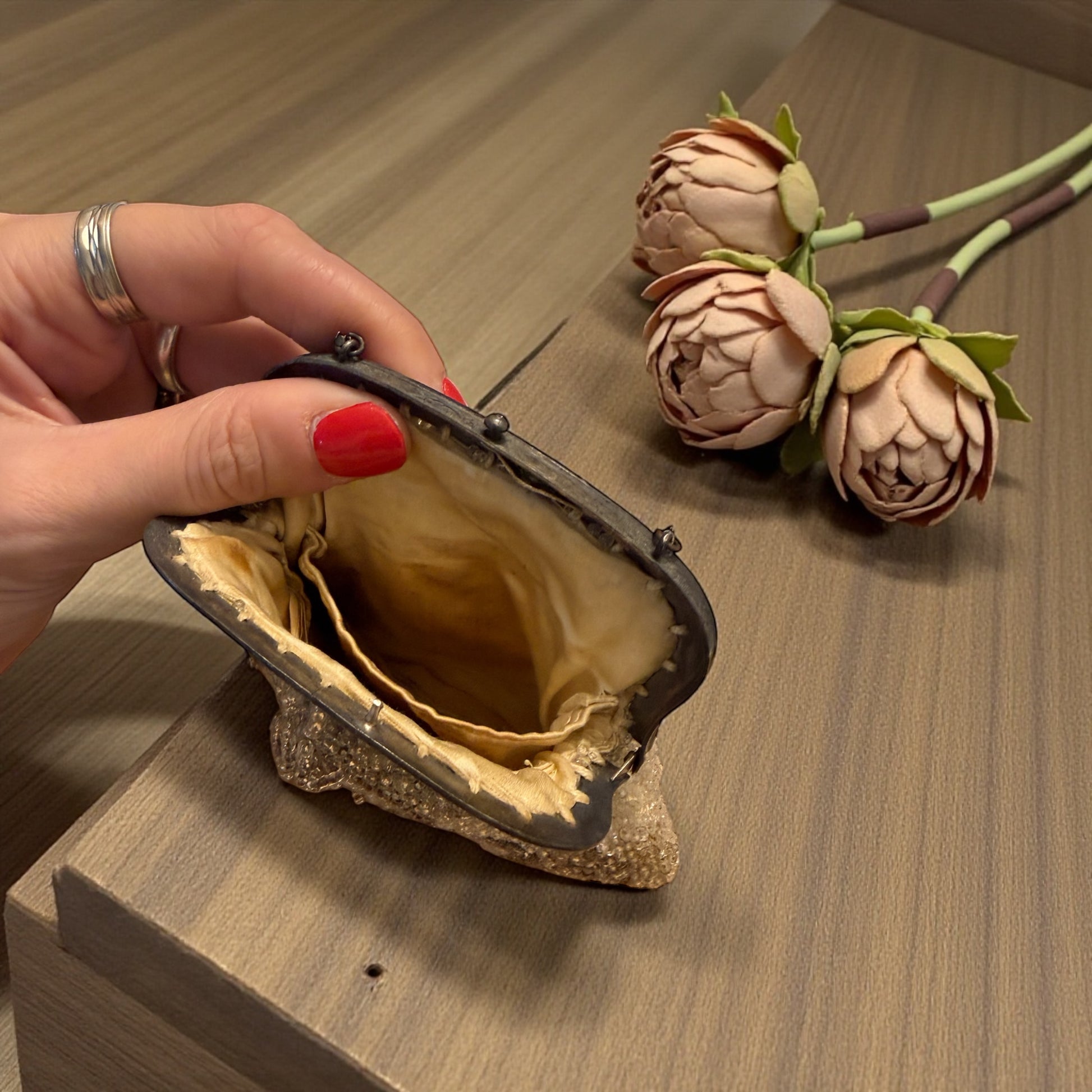C’era un tempo in cui una borsa non serviva a contenere il superfluo, ma l’essenziale. Un rossetto, un fazzoletto, qualche moneta… e il gesto elegante di portarla al polso. Questa borsetta da polso interamente ricamata in perline di vetro racconta la grazia silenziosa dei primi decenni del Novecento. La superficie è un tappeto luminoso di microperle trasparenti e fumé, disposte in un motivo geometrico morbido, quasi ipnotico, che vibra alla luce con discrezione, mai in modo ostentato. La chiusura in metallo brunito, finemente incisa, custodisce un interno sorprendentemente raffinato: tre scomparti separati, rifiniti in seta, pensati per organizzare piccoli oggetti personali in un’epoca in cui anche l’intimità aveva una sua forma. Le macchie interne – probabilmente tracce di trucco – non disturbano, ma anzi restituiscono verità e vita all’oggetto: segni di un uso reale, femminile, quotidiano. La catenella da polso, sottile e articolata, completa un accessorio che non nasce per stupire, ma per accompagnare. Una borsa che non chiede di essere esibita, ma scelta. Ti immagini nel farla tua? Per una sera speciale o per farne un’abitudine elegante di ogni giorno?