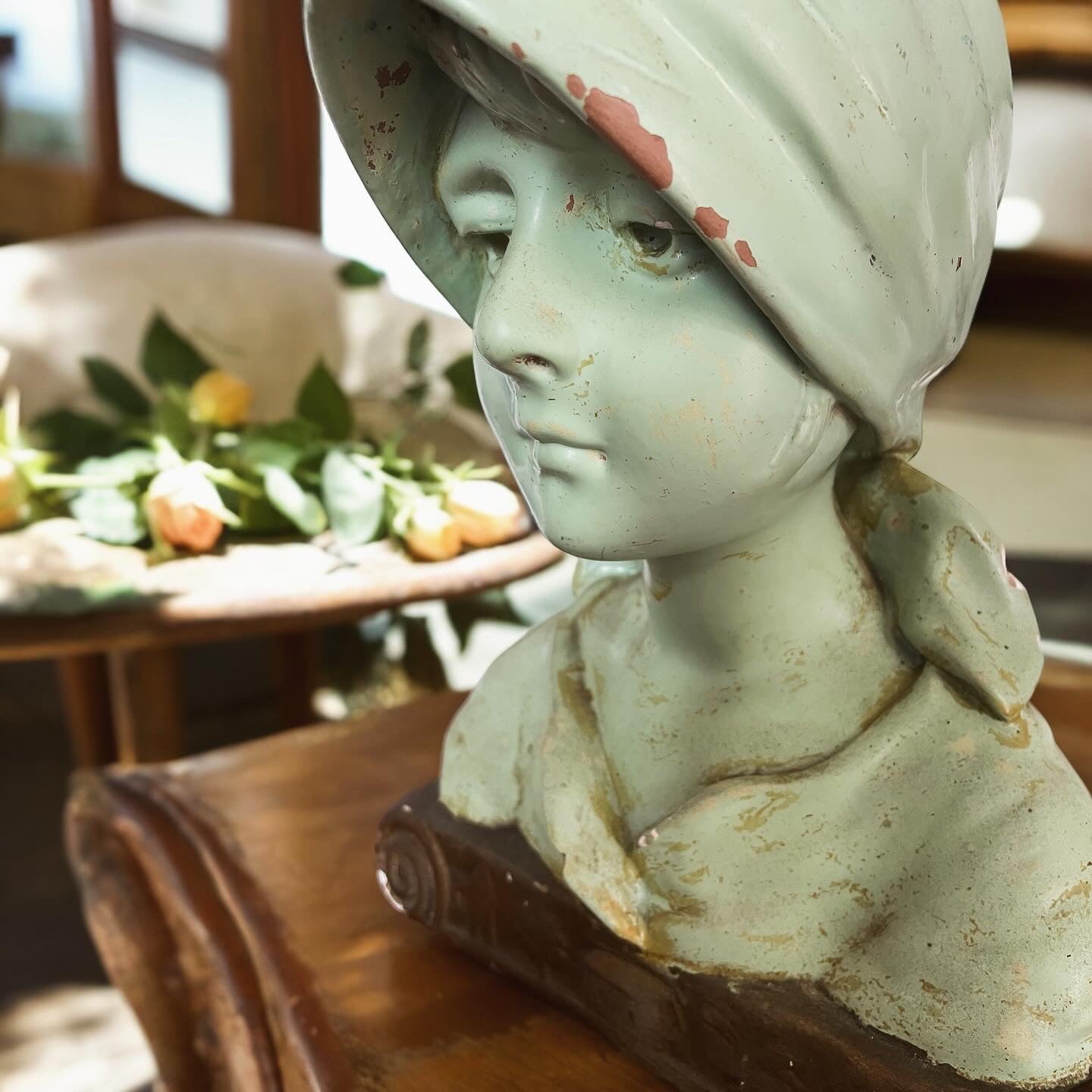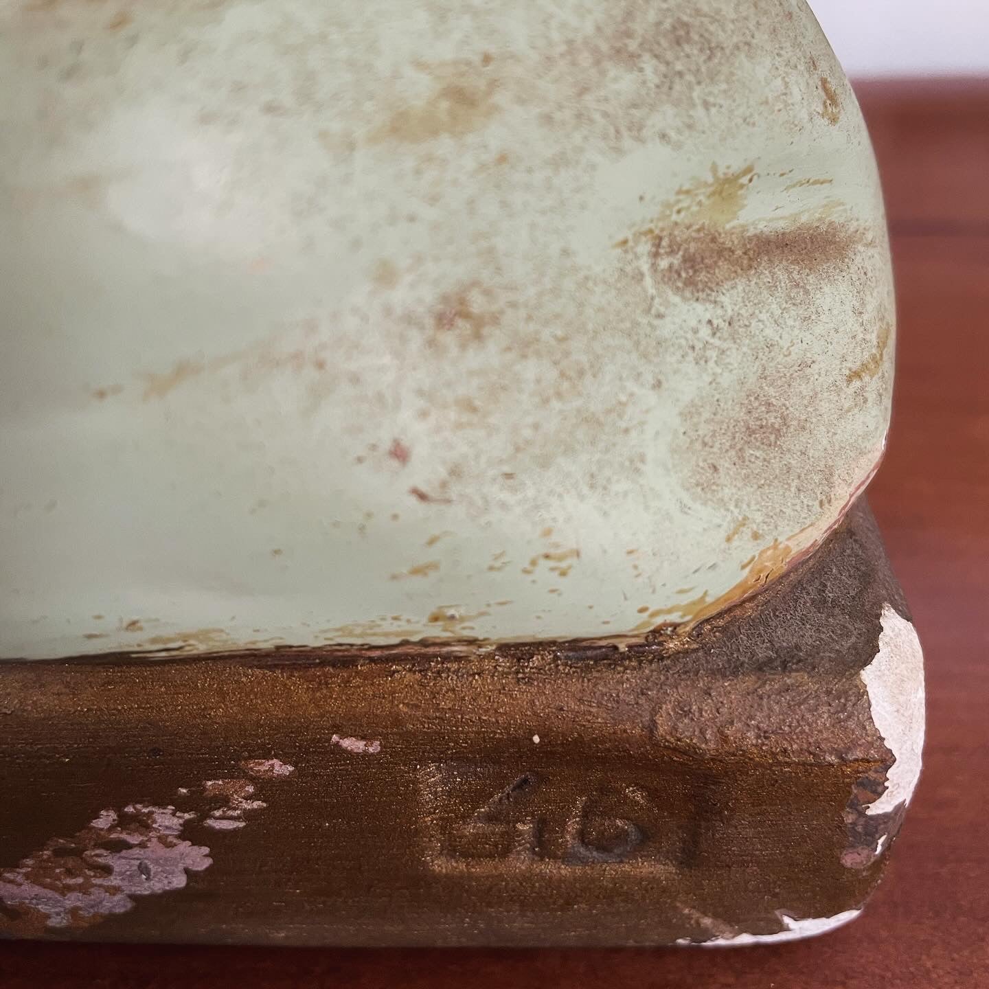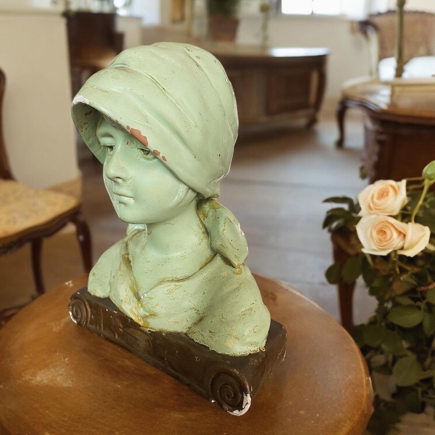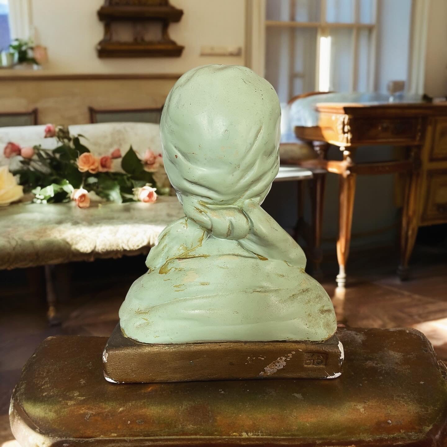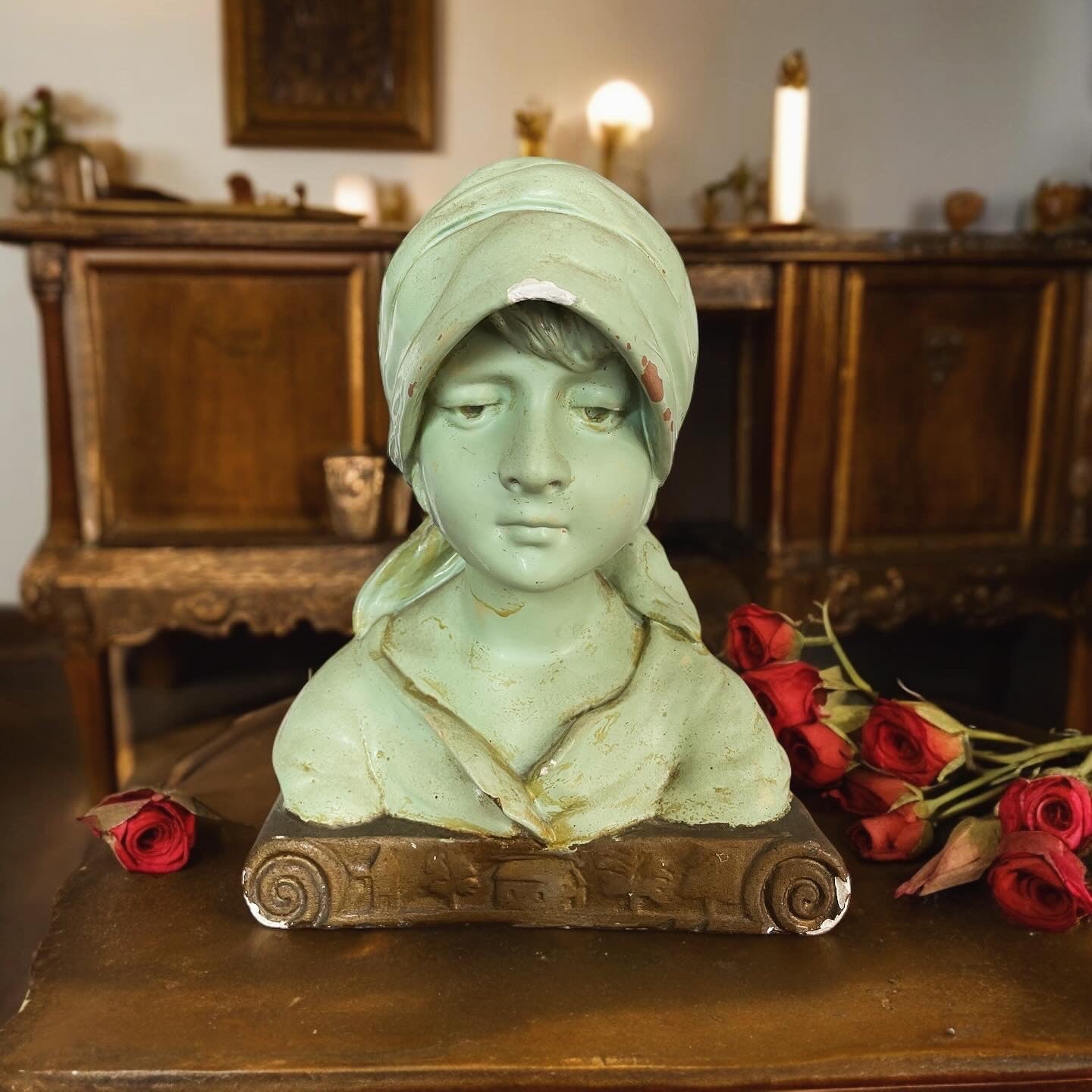 The peculiarity of this ancient art deco plaster bust is that it depicts a decidedly unhappy girl. The subject is quite famous in France, in different variations a girl is portrayed in the usual “au village” clothes. In this case, however, our little girl has decidedly sad eyes; absolutely not usual in the depiction - albeit serious - of the other busts. This detail makes her decidedly unique: it is as if she were waiting for someone to console her. On the back the bust is numbered. The dimensions are generous, 33 × 25 cm.