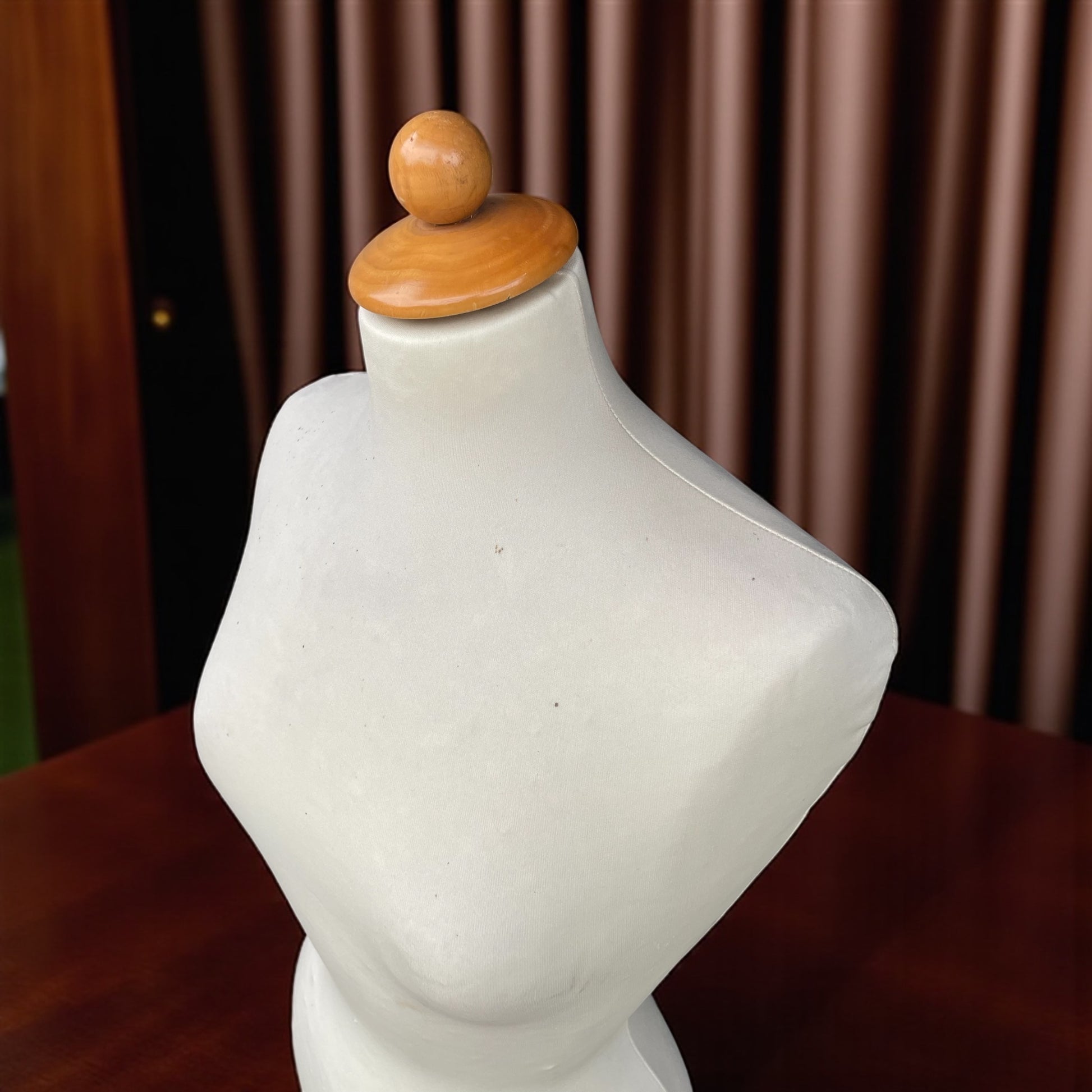 Busto sartoriale femminile vintage. Epoca: anni ’60. Provenienza: atelier di moda. Rivestimento in tessuto chiaro. Base e pomello in legno tornito. Altezza complessiva: 90 cm (allungabile a circa 120). Condizioni: segni e macchie d’uso coerenti con l’età.