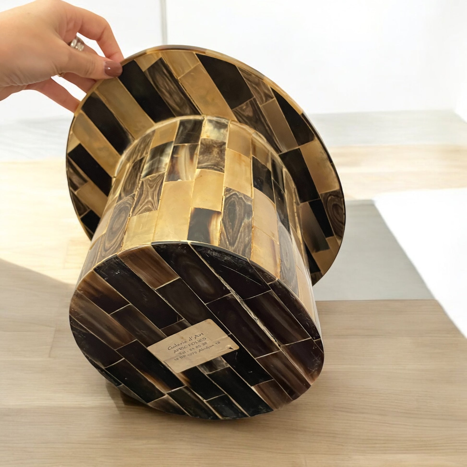 Oggetto mid century affascinante… provenienza Costa D’Avorio, dalla Galleria d’Arte “Afric Folies” di Abidjan: cappello a cilindro in legno pietrificato a tasselli, pregiato, utilizzabile come seau à glacé. Stupendo oggetto d’arredo, capolavoro di materiali e manifattura. Le misure: 33 x 26 x 22, piuttosto pesante. Qualche segno del tempo ma niente di impattante.