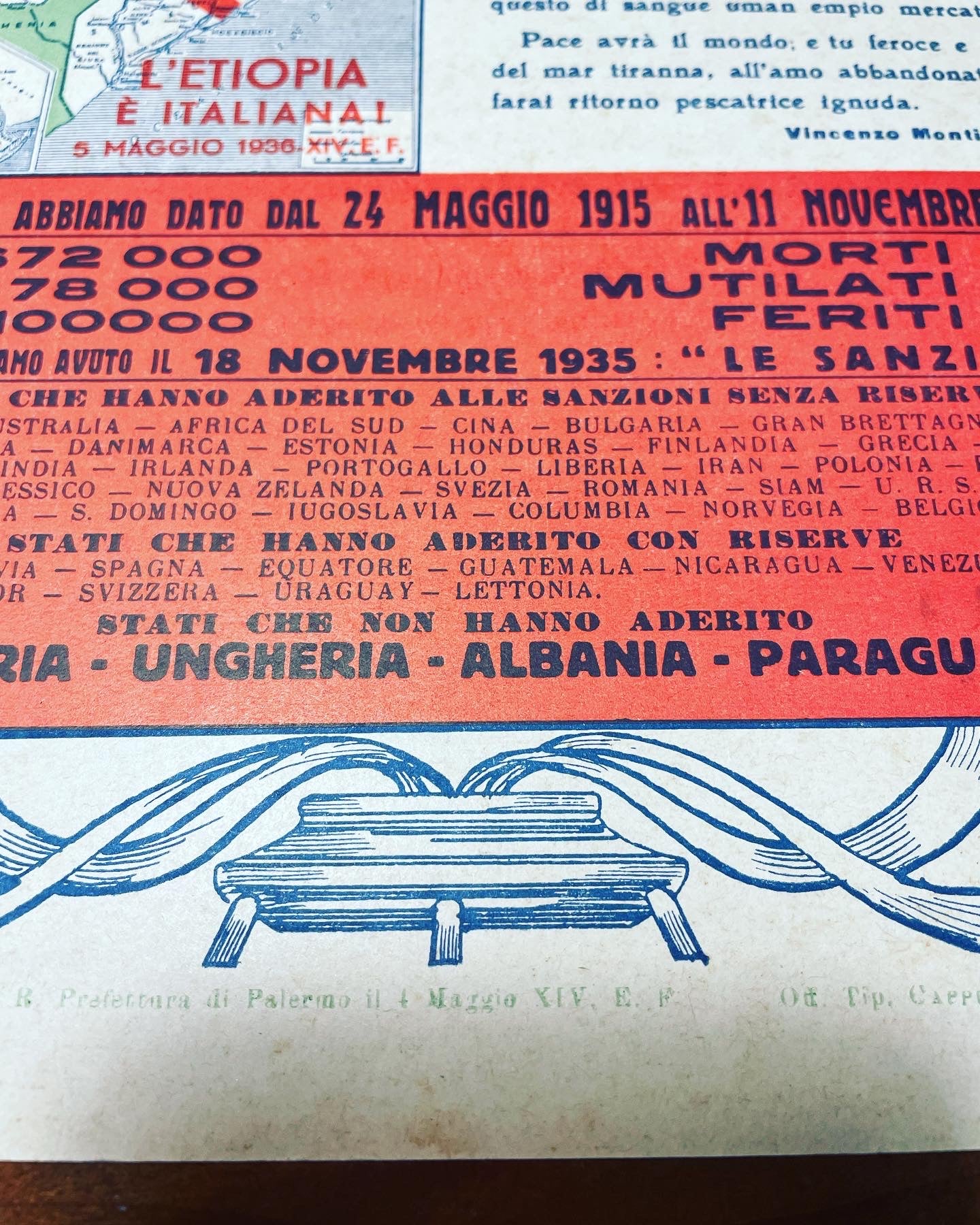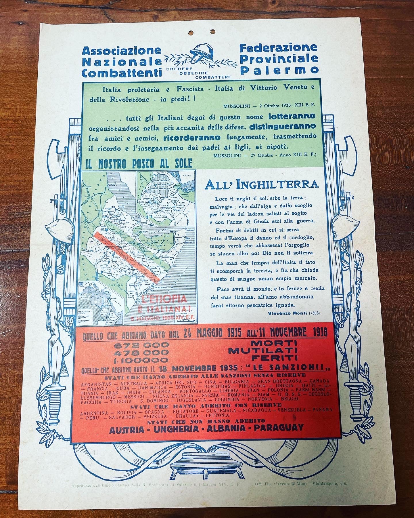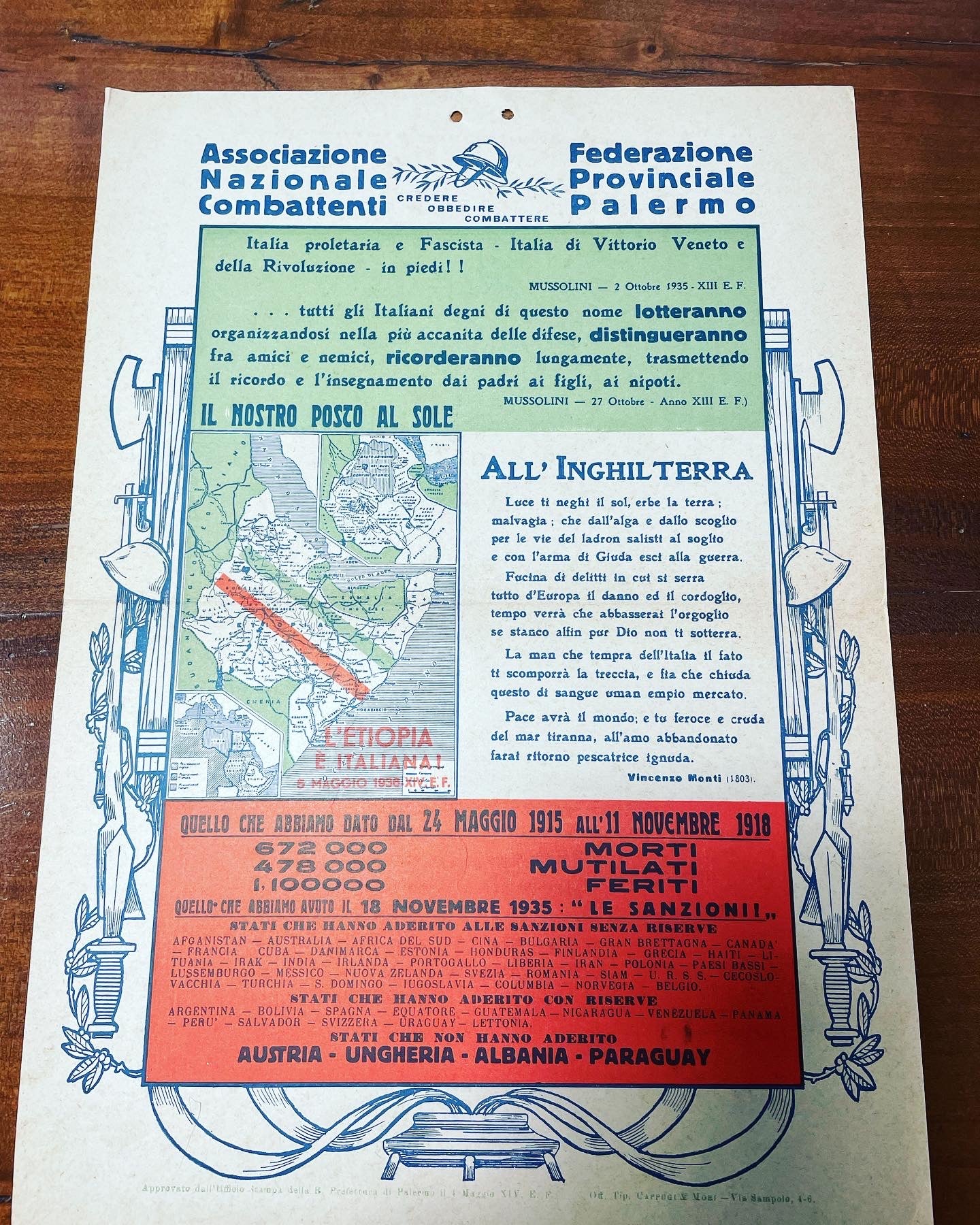 light hardback of the #fascist #twentyyears with the #believeobeyfight logo and on the sides the #fascilitators of the National Combatants Association year #1935 against the sanctions of #colonialpolitics and pro #conquestofEthiopia. #militaria rare and beautiful to frame dimensions cm 36 x 25