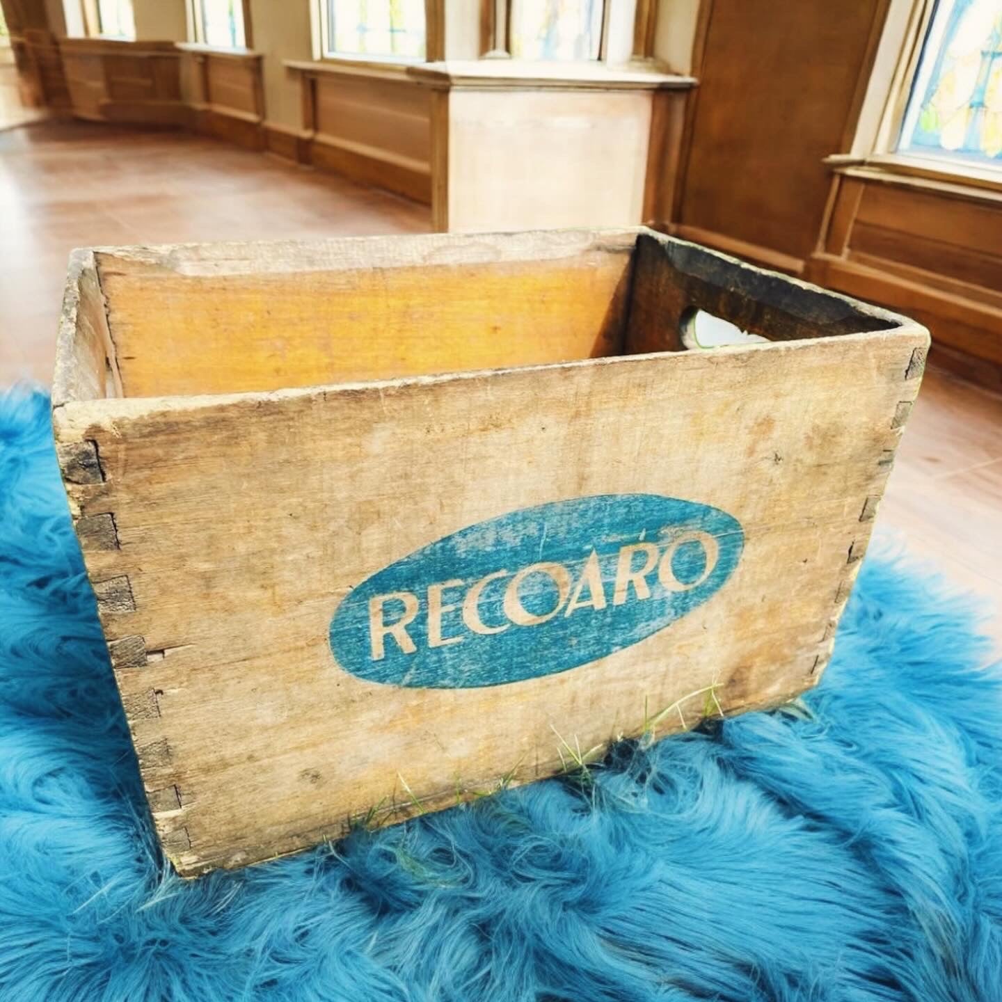 Fellini's Amarcord... we have interpreted the ancient wooden #drinks #recoaro #crate (in excellent condition, #swallowtail inserts, dimensions 36 x 25 h 23) as a French casier or magazine rack... ideal enhanced by almost minimal furnishings, enriched by a rug that reflects the blue of the logo, it will be a furnishing accessory with character in any guest room.