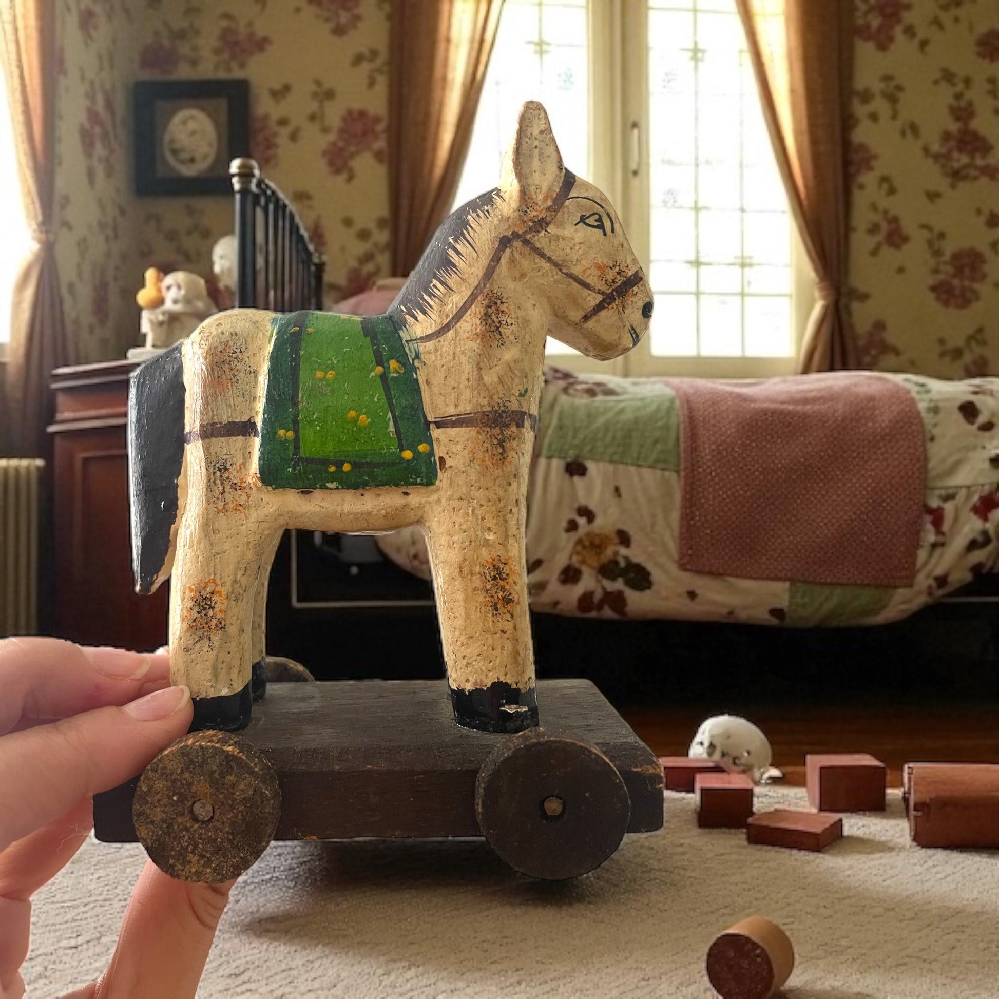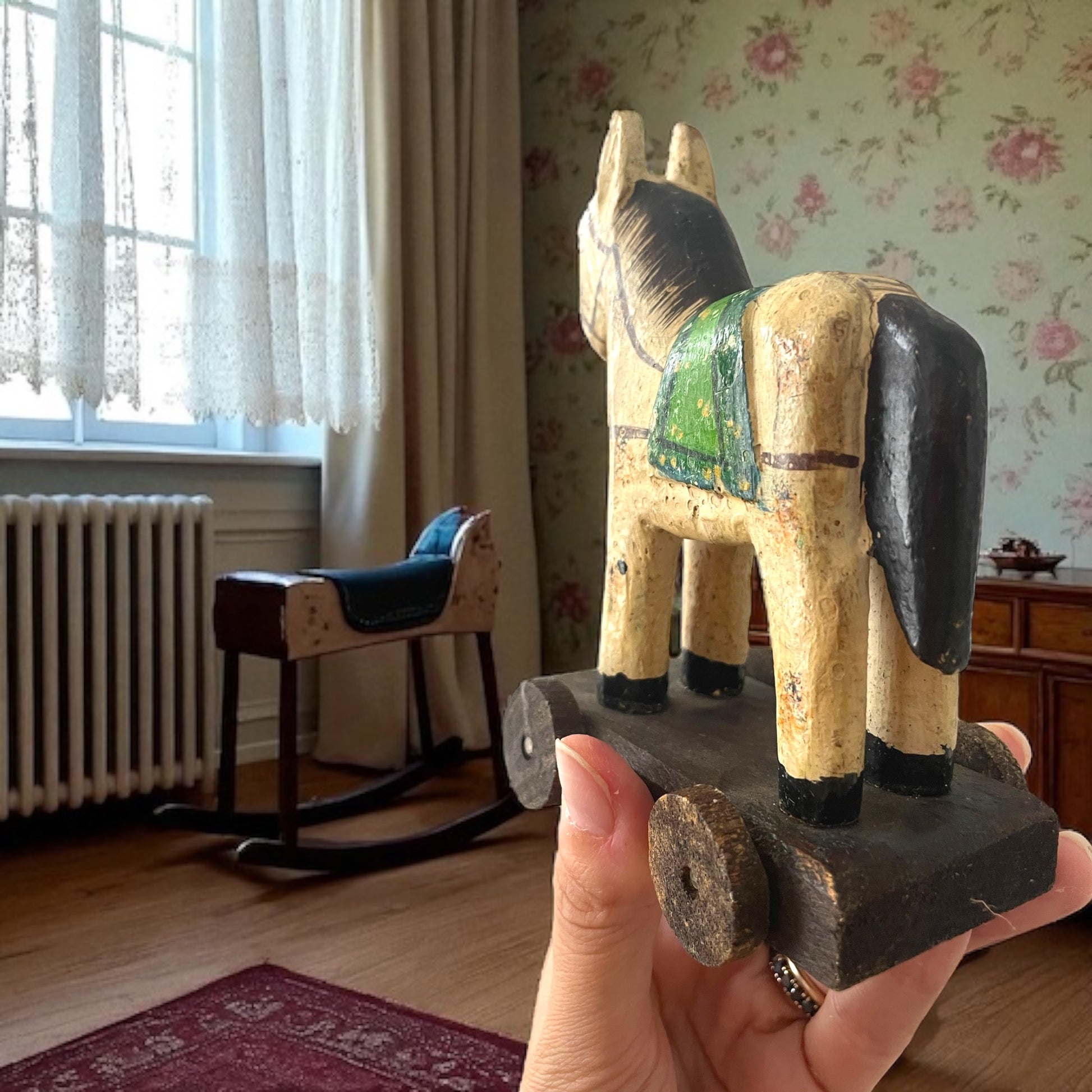 Quel cavallino — a metà tra un asino paziente e un destriero di fiaba — non ha mai corso. Ma ha accompagnato generazioni di sogni. Con le sue ruote in legno, un tempo cigolanti, scivolava su tappeti consumati e pavimenti scricchiolanti, seguendo il filo invisibile dell’immaginazione. Sotto la sella verde, lievemente fiorita, portava i segreti di un’infanzia lenta, fatta di pomeriggi silenziosi e storie senza fine.