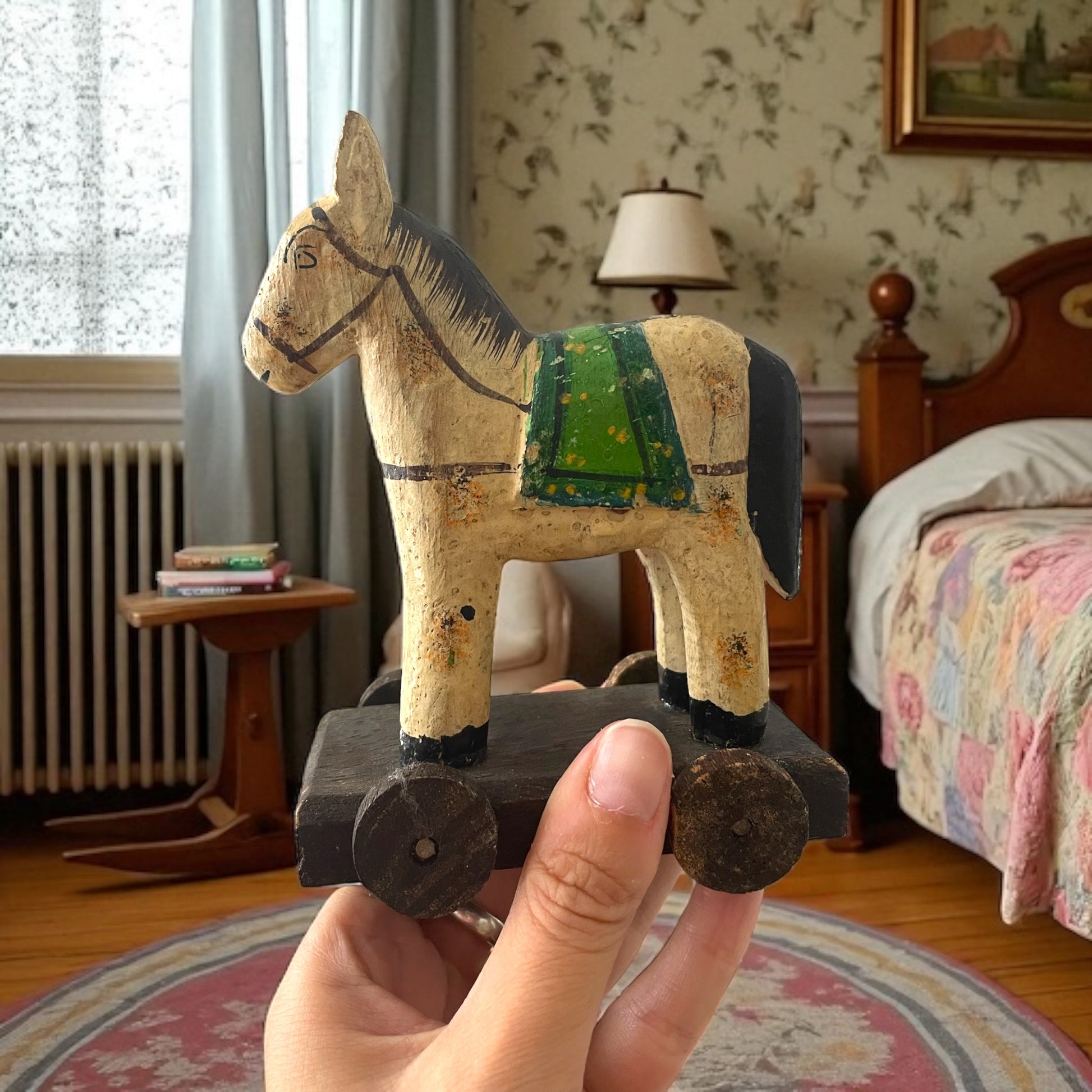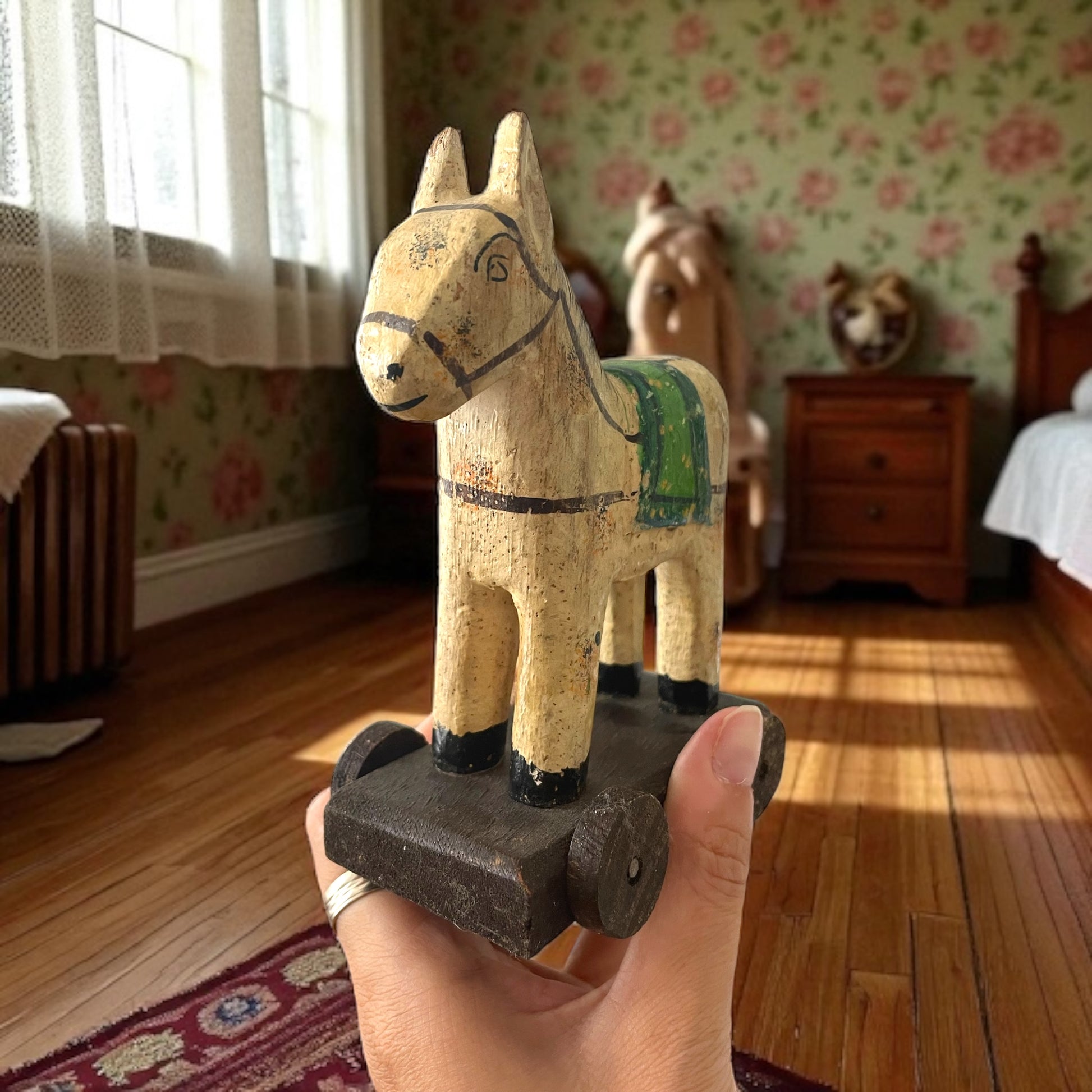 Cavallino giocattolo vintage su rotelle. Materiale: legno leggero dipinto a mano. Epoca: metà ’900 (anni ’60 circa, prov. Sud America). Dimensioni: altezza cm 14. Condizioni: segni di usura coerenti con l’età.
