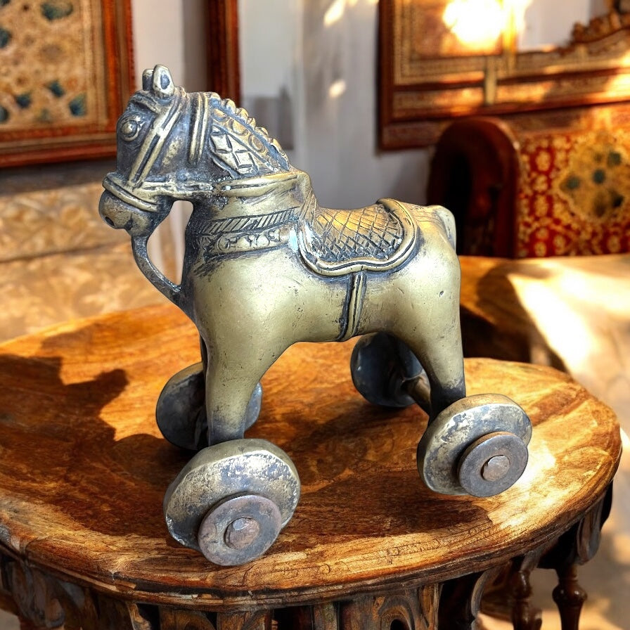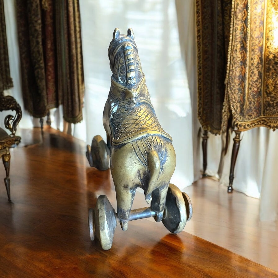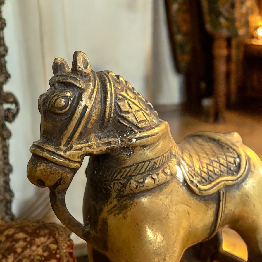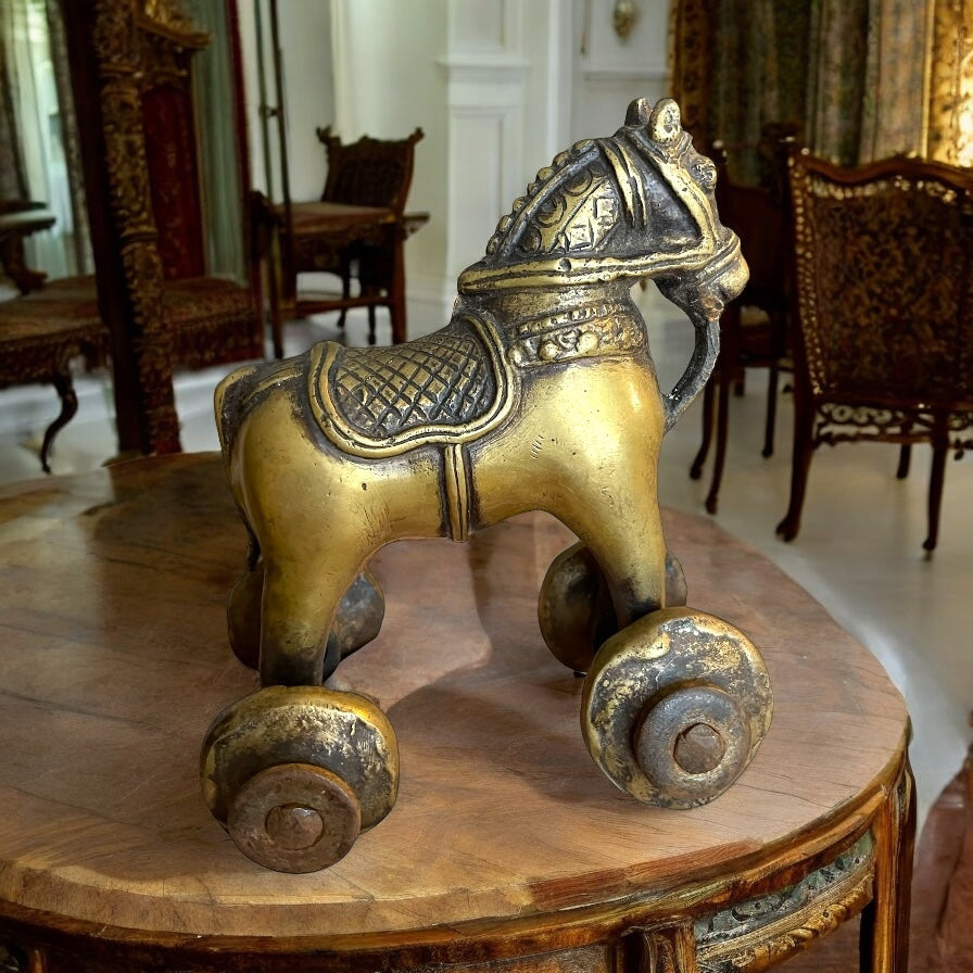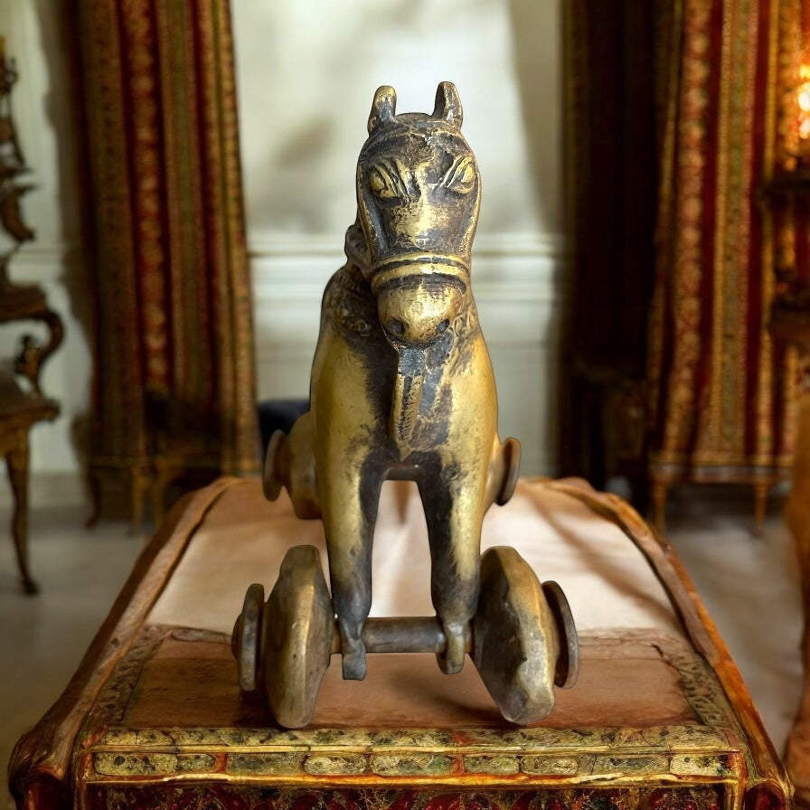 In un tempo lontano, tra i cortili dei templi dell’India meridionale, questo cavallo in bronzo su ruote faceva parte di un rituale antico, un simbolo di devozione e potere. Massiccio e solenne, sorprendentemente pesante al tatto, non era un semplice giocattolo, ma un “gioco del tempio”, una miniatura votiva ispirata ai carri processionali sacri. In bronzo, con il tempo ha sviluppato una patina profonda, tra il marrone scuro e il nero, che ne accresce il fascino. Le ruote in metallo massiccio non erano pensate per il gioco, ma per rappresentare il movimento rituale dei carri cerimoniali, trainati nei templi durante le festività dedicate alle divinità. Il cavallo, in molte tradizioni dell’India, è un animale sacro associato a forza, nobiltà e protezione. In ambito religioso, è spesso legato al culto di Khandoba, divinità guerriera venerata in Maharashtra e Karnataka, raffigurata a cavallo, oppure a Vishnu Kalki, l’avatar finale del dio Vishnu, che secondo la tradizione hindu arriverà alla fine del tempo montando un destriero divino. Oggetti come questo venivano spesso donati ai templi o offerti ai bambini delle famiglie devote. Basandosi su stile, materiali e tecnica, questo cavallo è attribuibile all’India meridionale, tra la fine del XIX e l’inizio del XX secolo. Pezzi simili sono stati realizzati fino al primo quarto del Novecento. Esposto in una collezione di arte orientale o in un ambiente dal fascino esotico, porta con sé la forza della tradizione e la suggestione di antichi rituali, riecheggiando il suono lontano delle processioni nei templi d’India. Dimensioni: ca 15 x 13 cm.