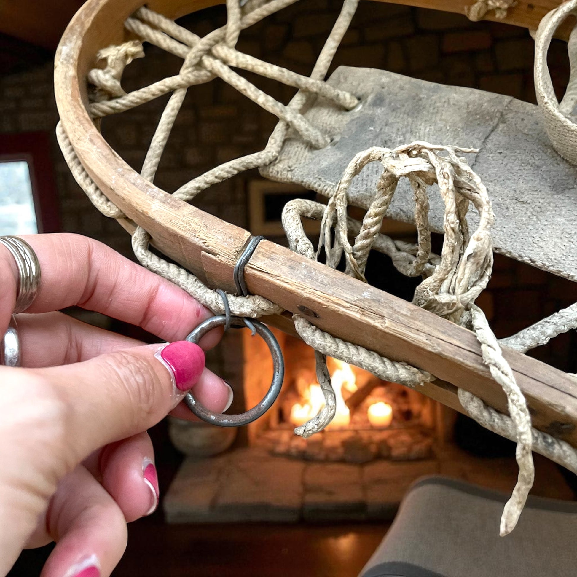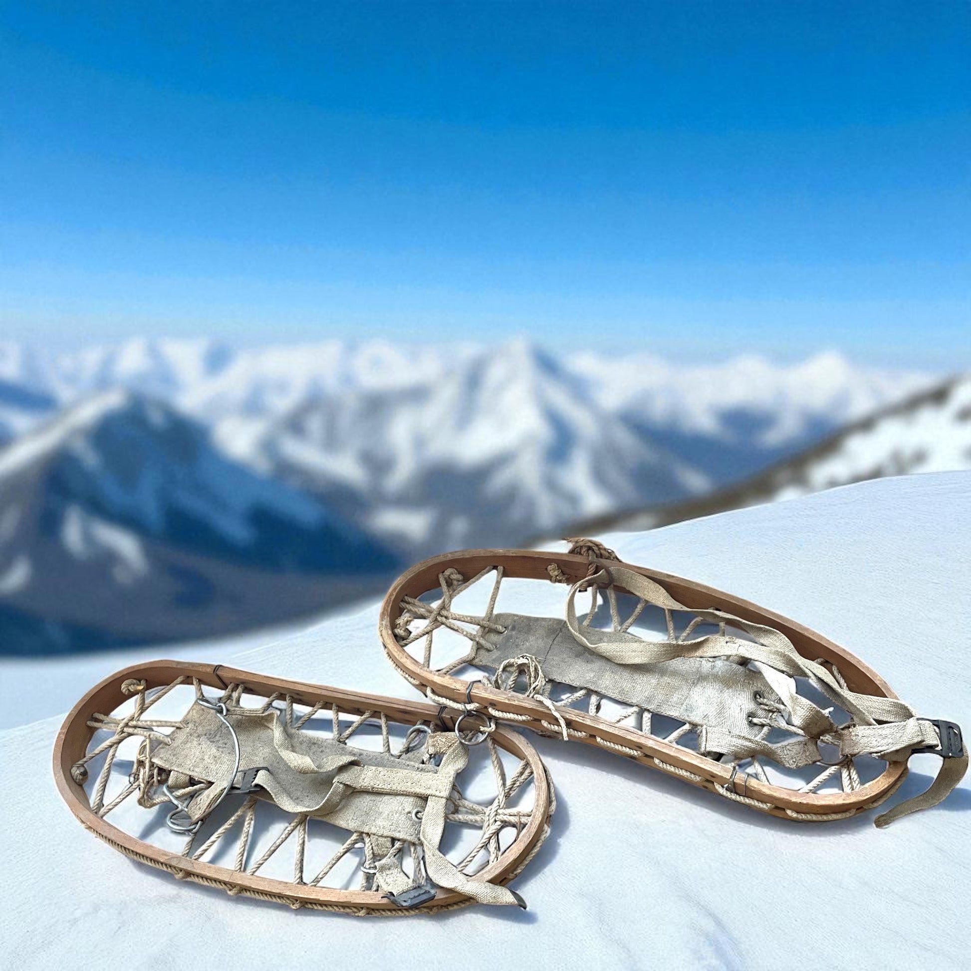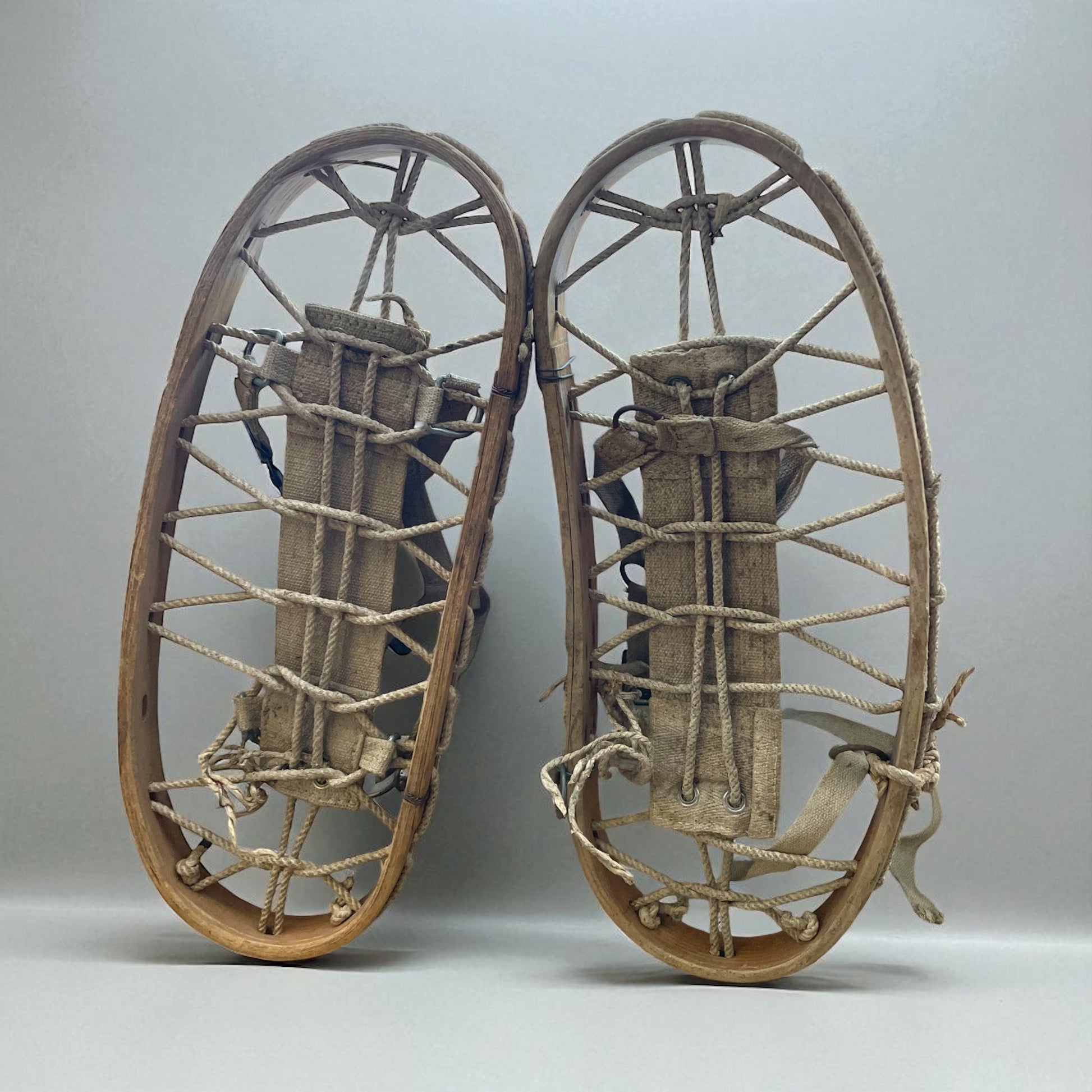 Ciaspole / racchette da neve antiche. Epoca: Anni ’40–’60 ca. Materiali: Legno curvato a vapore, corde in fibra naturale, legature in tessuto con inserti metallici. Uso attuale: decorativo di charme, perfetto per baite, taverne, chalet di montagna.
