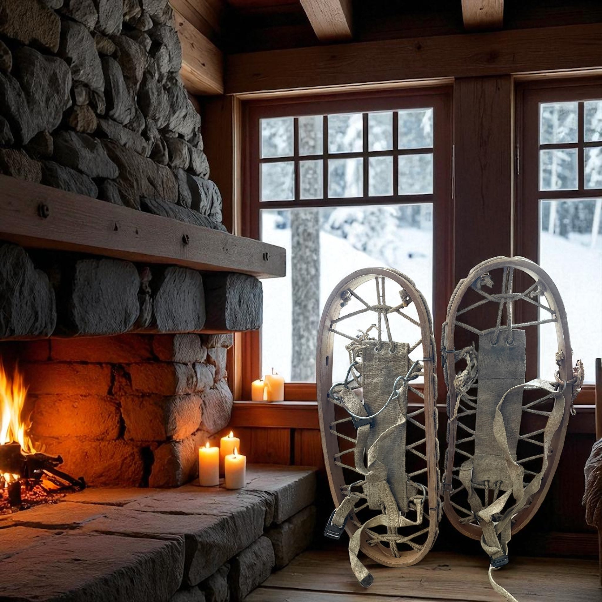 Immagina di entrare in una baita di montagna: il fuoco scoppietta nel camino, il legno profuma di resina e il silenzio della neve avvolge ogni cosa. Appese al muro, queste antiche racchette da neve raccontano di passi lenti sul candore immacolato, di viaggiatori che hanno sfidato l’inverno per raggiungere i loro rifugi. Il loro intreccio di corda e legno porta con sé la memoria di un tempo in cui la montagna era maestra di resistenza e di intimità. Ora, appese in un ambiente caldo e raccolto, diventano la porta simbolica verso un passato autentico, capace di far rivivere sensazioni profonde e di rendere ogni stanza più accogliente e suggestiva. Lasciati trasportare: non stai semplicemente guardando un arredo, ma stai già respirando l’aria di un rifugio alpino.