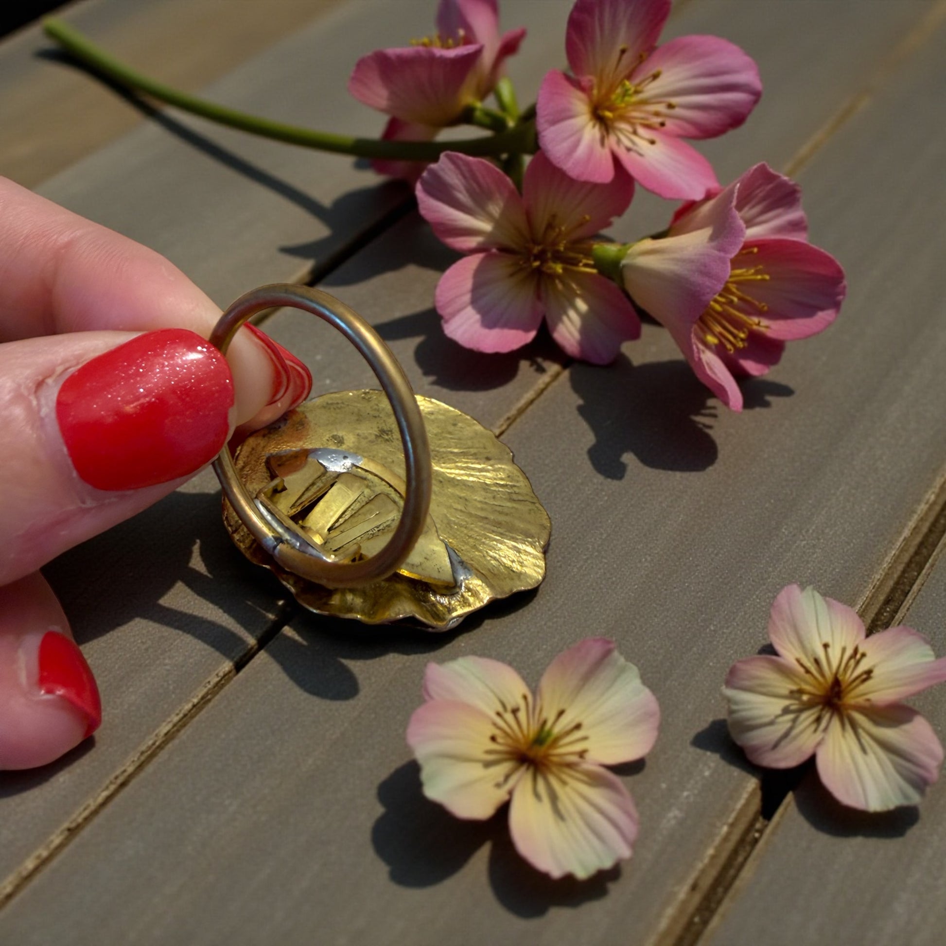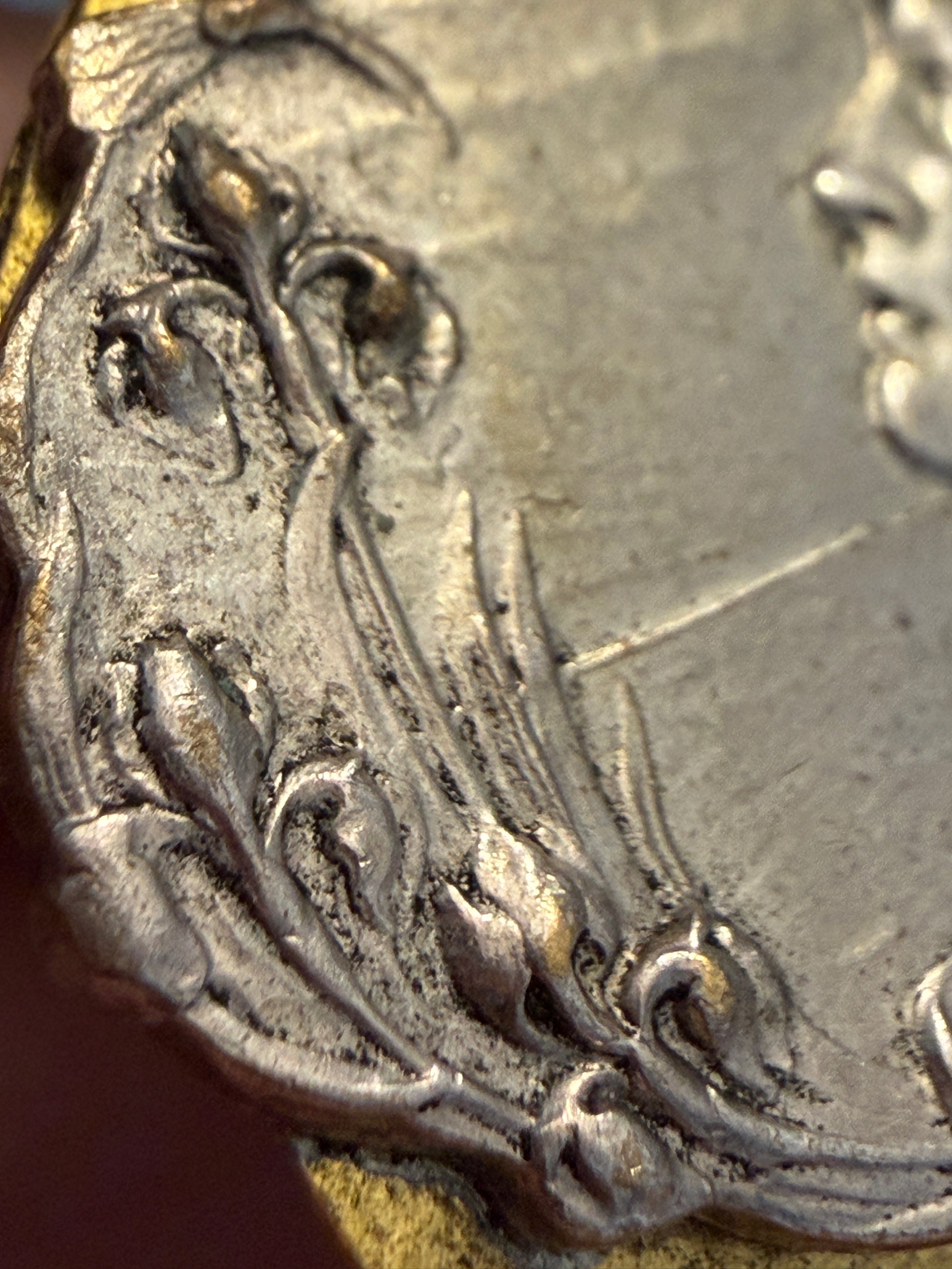C’è un volto che potrebbe uscire da un manifesto di Mucha, se solo fosse stampato su carta. Questo ferma foulard a clip sembra nato nello stesso immaginario delle donne di Alphonse Mucha: profili idealizzati, capelli mossi come un’onda lenta, fiori intrecciati non per ornamento ma per destino. Il volto femminile, leggermente sollevato, non guarda chi lo indossa: guarda altrove, come fanno le figure di Mucha, sospese tra grazia e silenzio. La doppia montatura – argentata sul fronte e dorata alla base, un gioco degli anni ‘50 – amplifica questo effetto: il rilievo chiaro emerge come una figura da manifesto, mentre il fondo dorato richiama le cornici decorative, le aureole, le campiture preziose tipiche dell’Art Nouveau. Non è una copia, non è una citazione letterale: è una eco, un riflesso tardivo di quel mondo estetico. Sul retro, il cerchio a clip permette di fissare il foulard con sicurezza, rendendo l’oggetto pratico oltre che narrativo. Ma è sul davanti che accade qualcosa di più: il foulard diventa sfondo, come la carta illustrata lo era per Mucha, e il volto prende vita. Non è un gioiello prezioso in senso materiale. È un accessorio colto, per chi riconosce certe linee anche senza nome, per chi ama indossare non solo uno stile, ma un immaginario.
