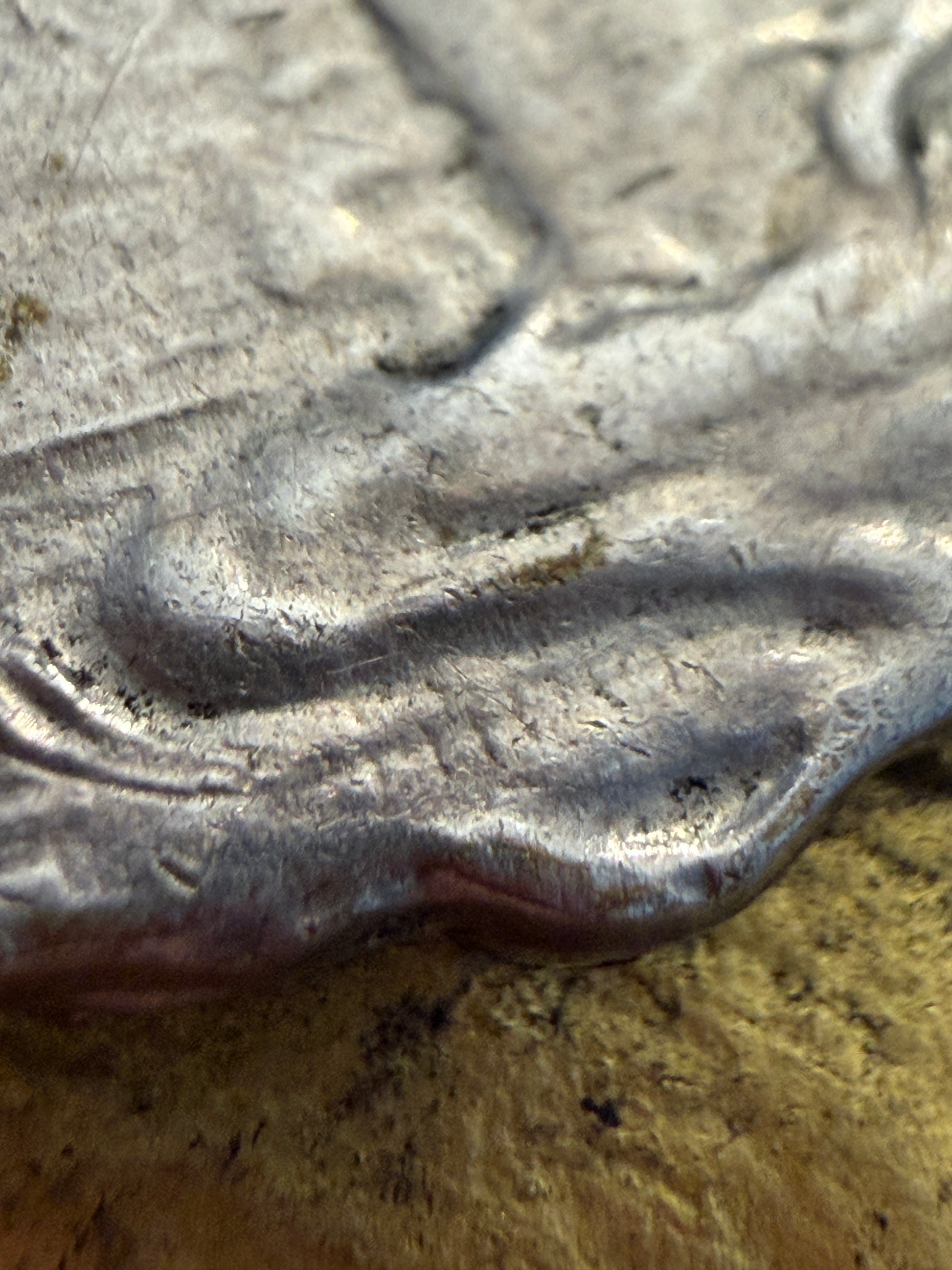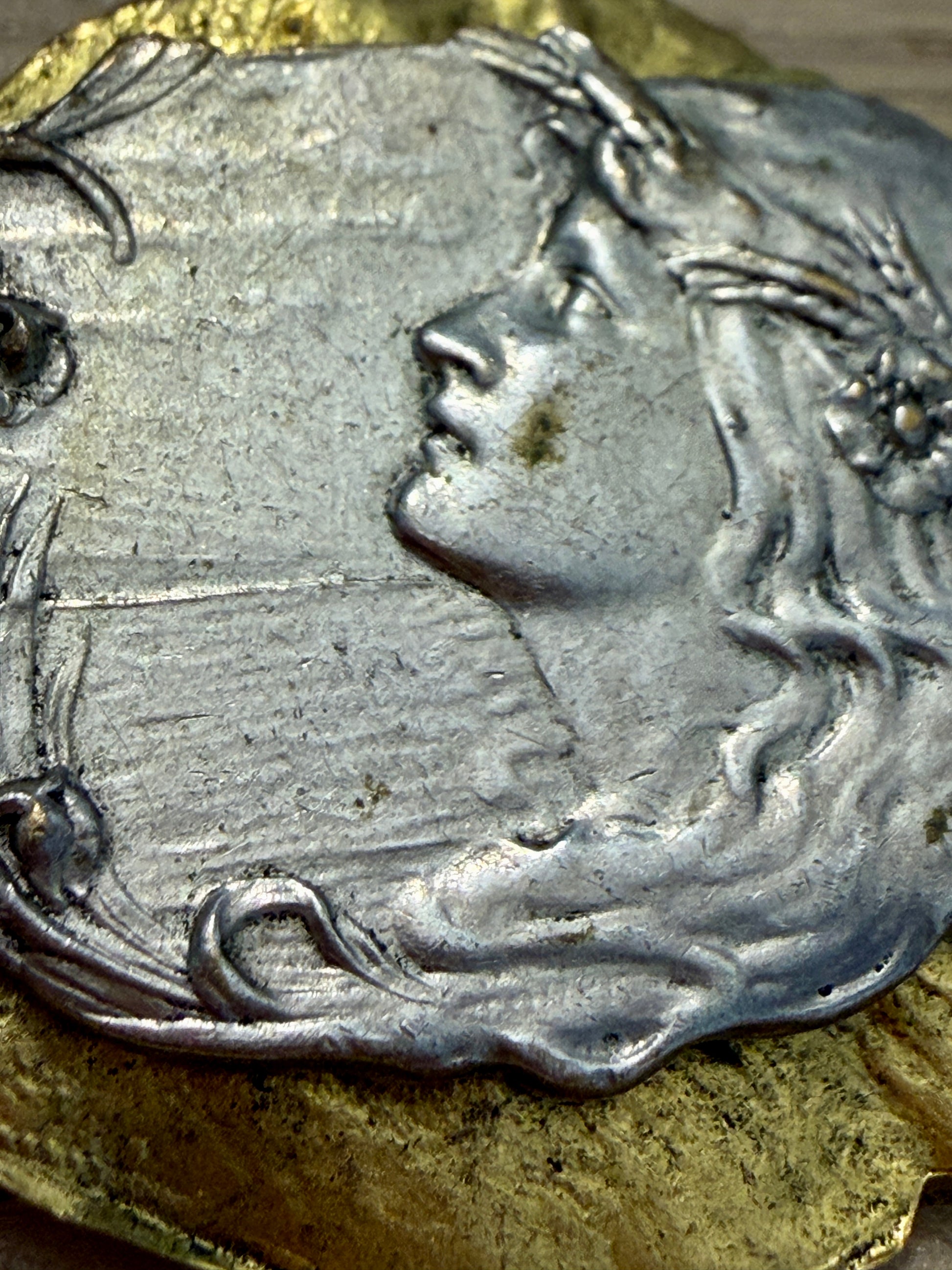 Ferma foulard a clip. Spilla rimaneggiata nella seconda metà del ’900. Ispirazione stilistica: Art Nouveau / Liberty, con chiaro richiamo all’estetica di Alphonse Mucha. Materiali: Metalli non preziosi. Struttura: Doppia montatura (fronte argentato, base dorata). Condizioni: Buone, con patina coerente con l’età.