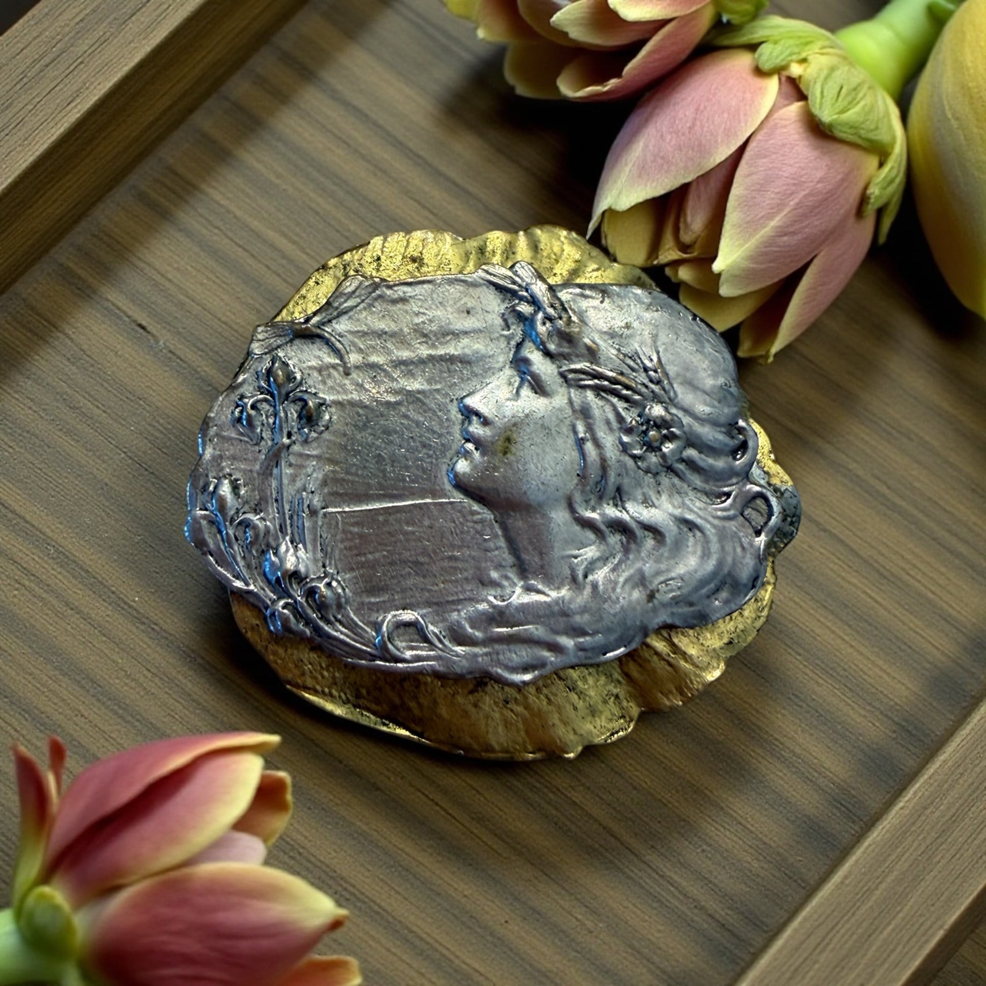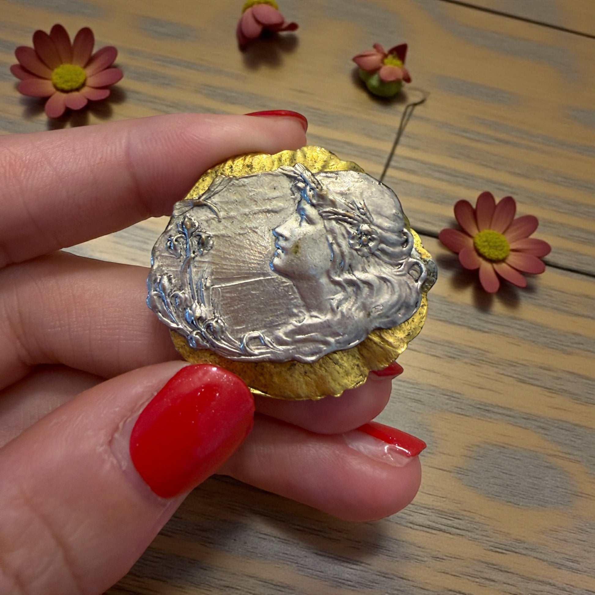 Clip / spilla ferma foulard con volto Art Nouveau alla Alphonse Mucha, doppia montatura argentata e dorata