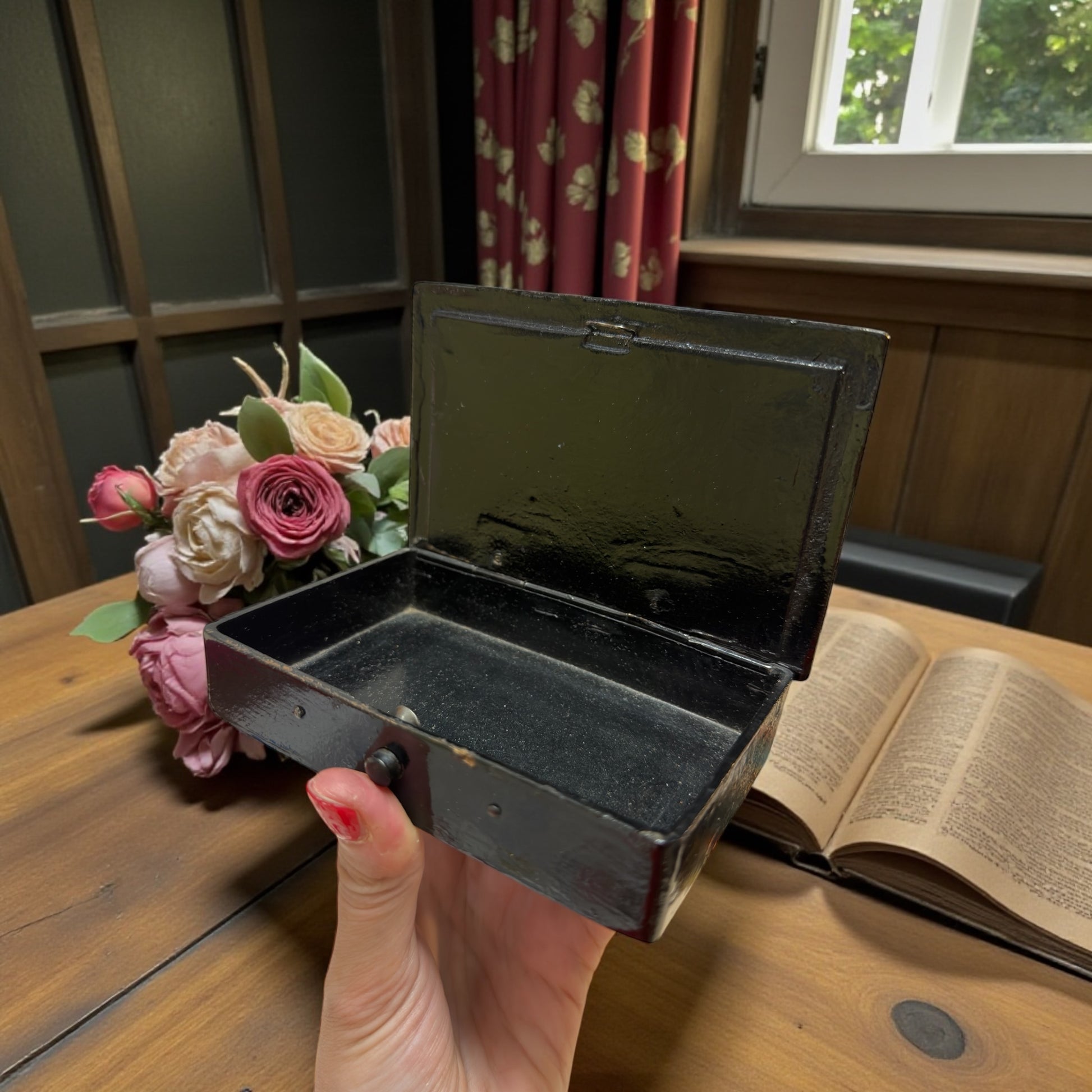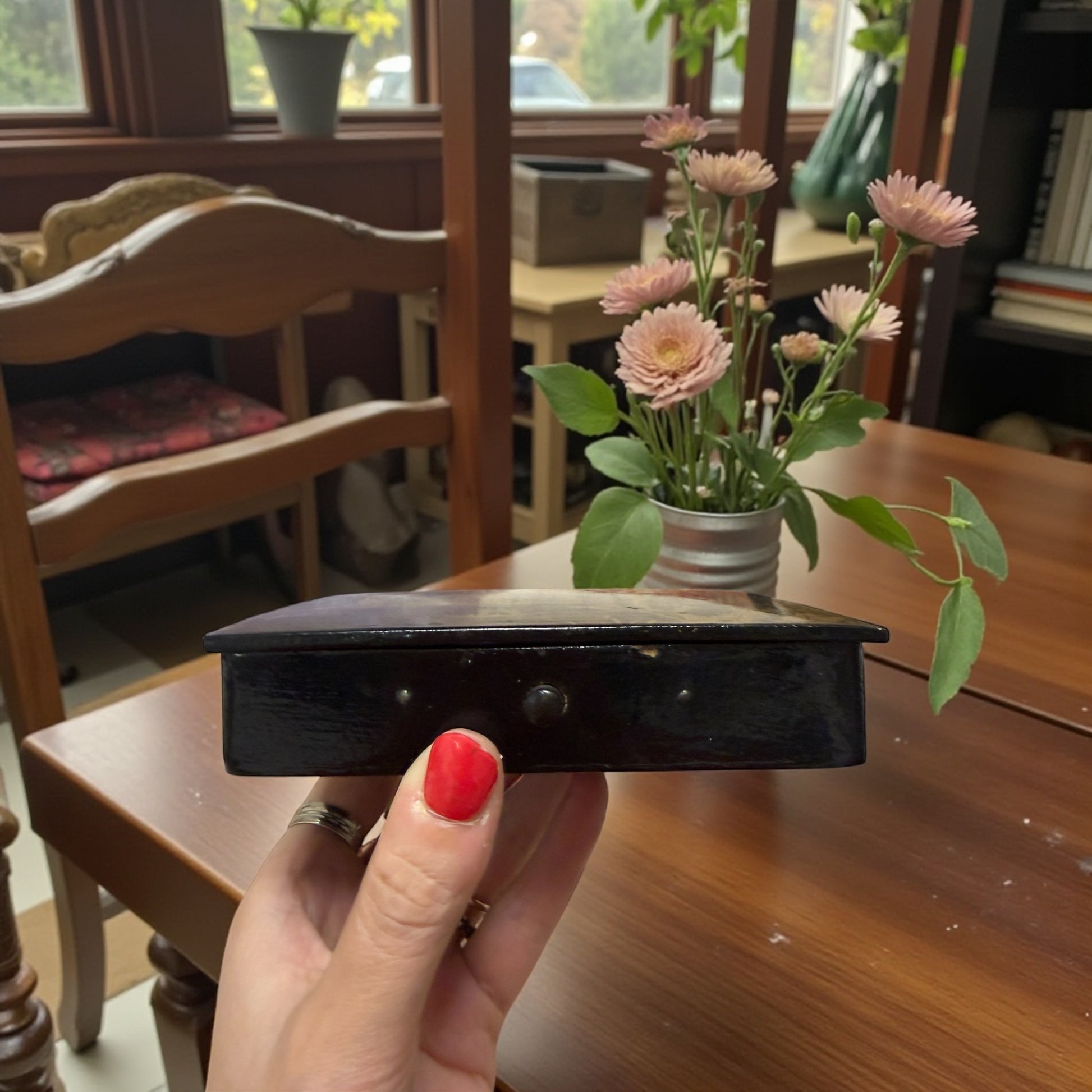 Cofanetto porta-oggetti. Epoca: anni ’40–’50. Materiale: papier mâché laccato. Dimensioni: 12 × 8 cm. Altezza: 2,8 cm. Chiusura: a pressione. Condizioni: buone, con normali segni del tempo coerenti con l’età e il materiale.