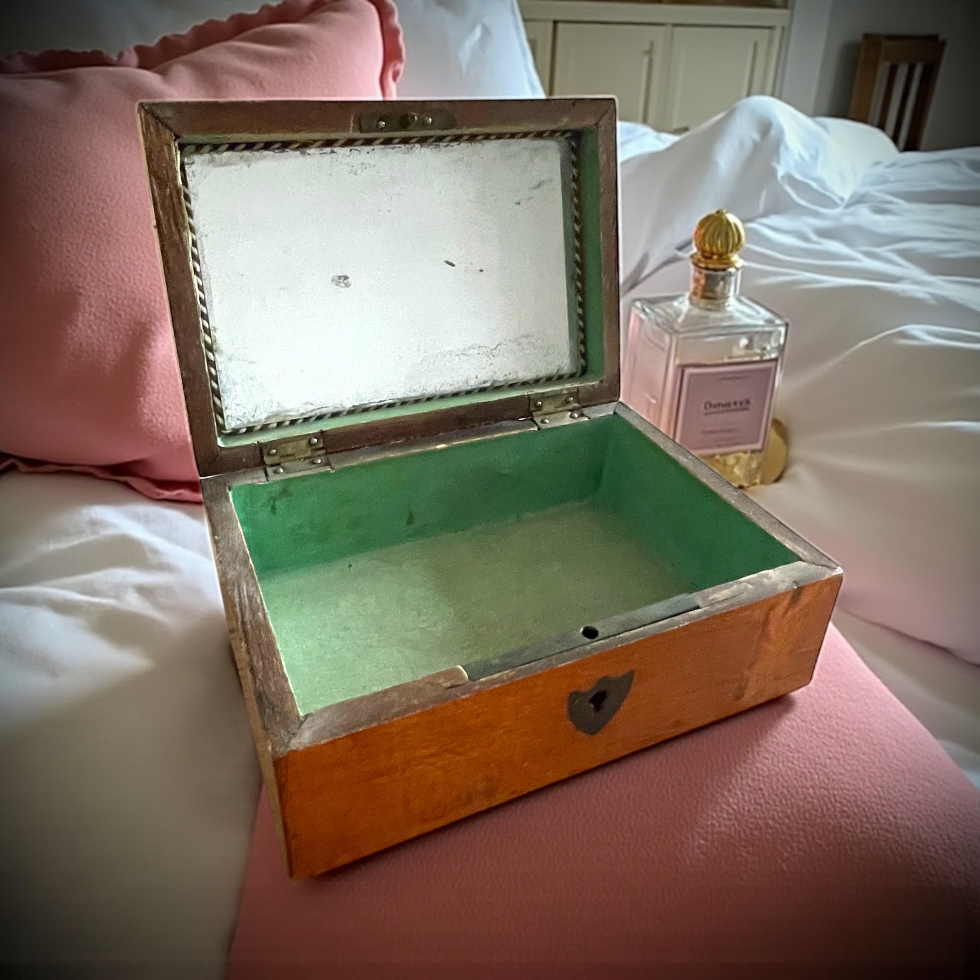 Epoca: 1885–1910. Provenienza: Italia del Nord / Francia. Materiali: legno impiallacciato, radica, ottone, carta coeva, specchio originale. Colore interno: verde vittoriano storico (pigmentazione arsenicale ottocentesca). Condizioni: buone con segni del tempo, patina autentica. Particolarità: interno originale mai sostituito. Dimensioni: 16,3 × 11,5 cm (h 7 cm). Chiusura: originale, senza chiave, stabile.