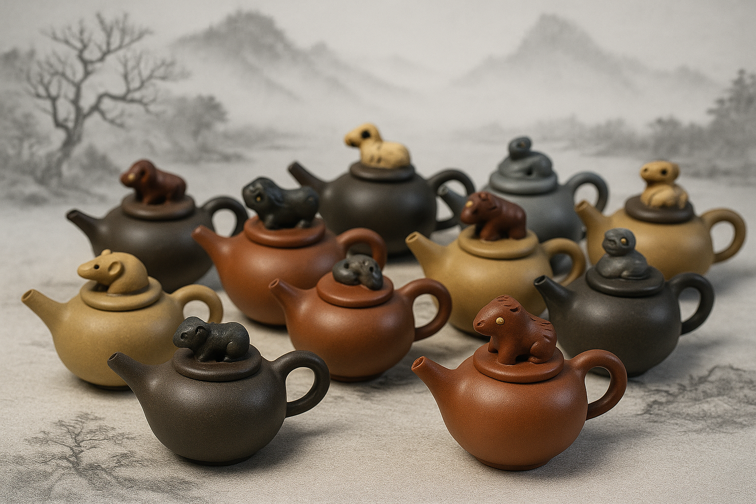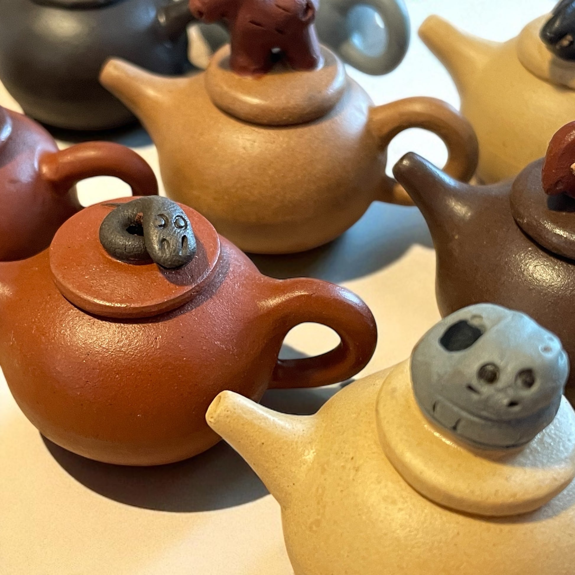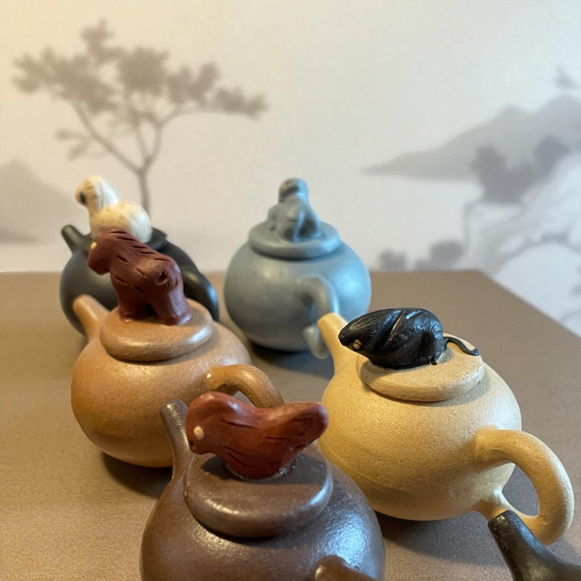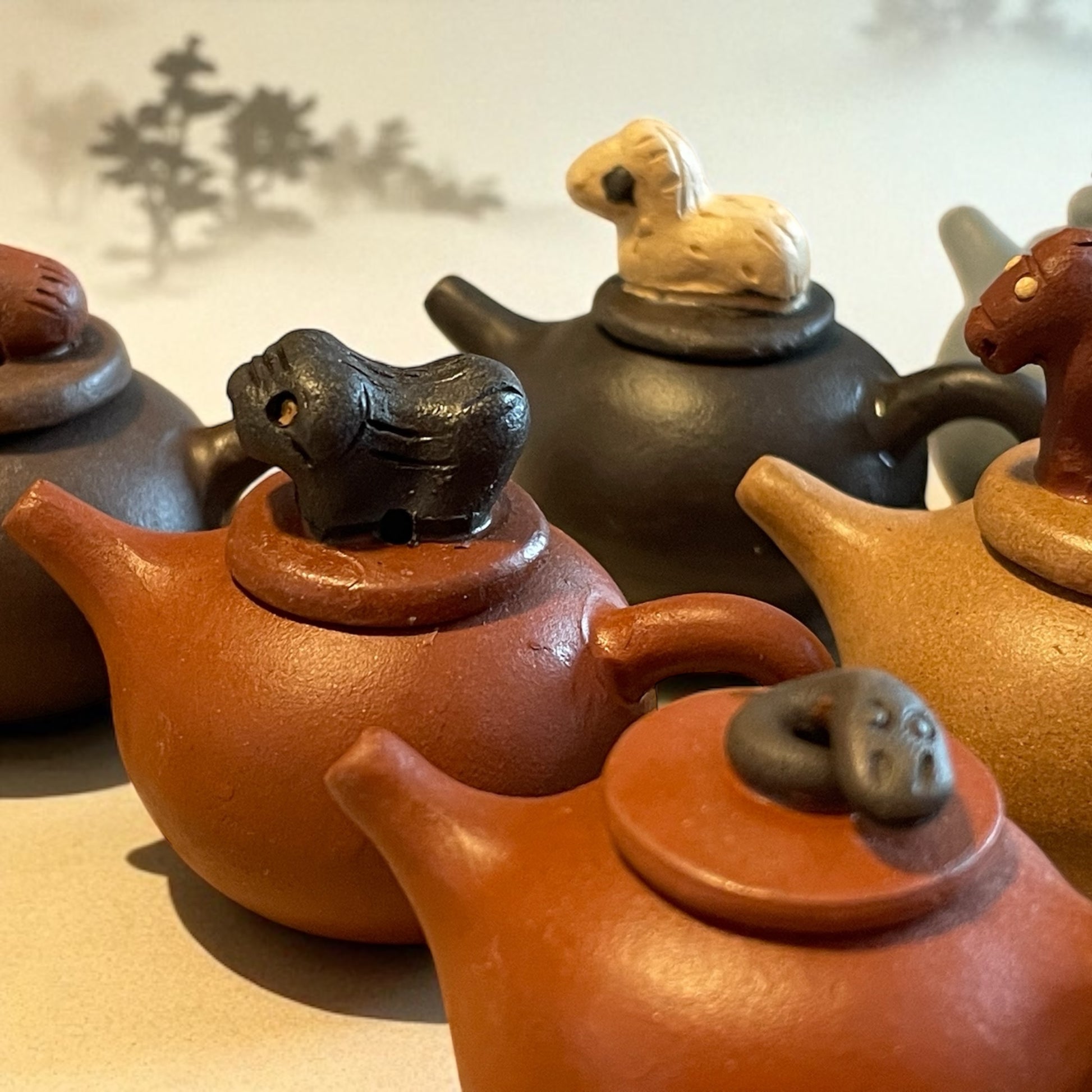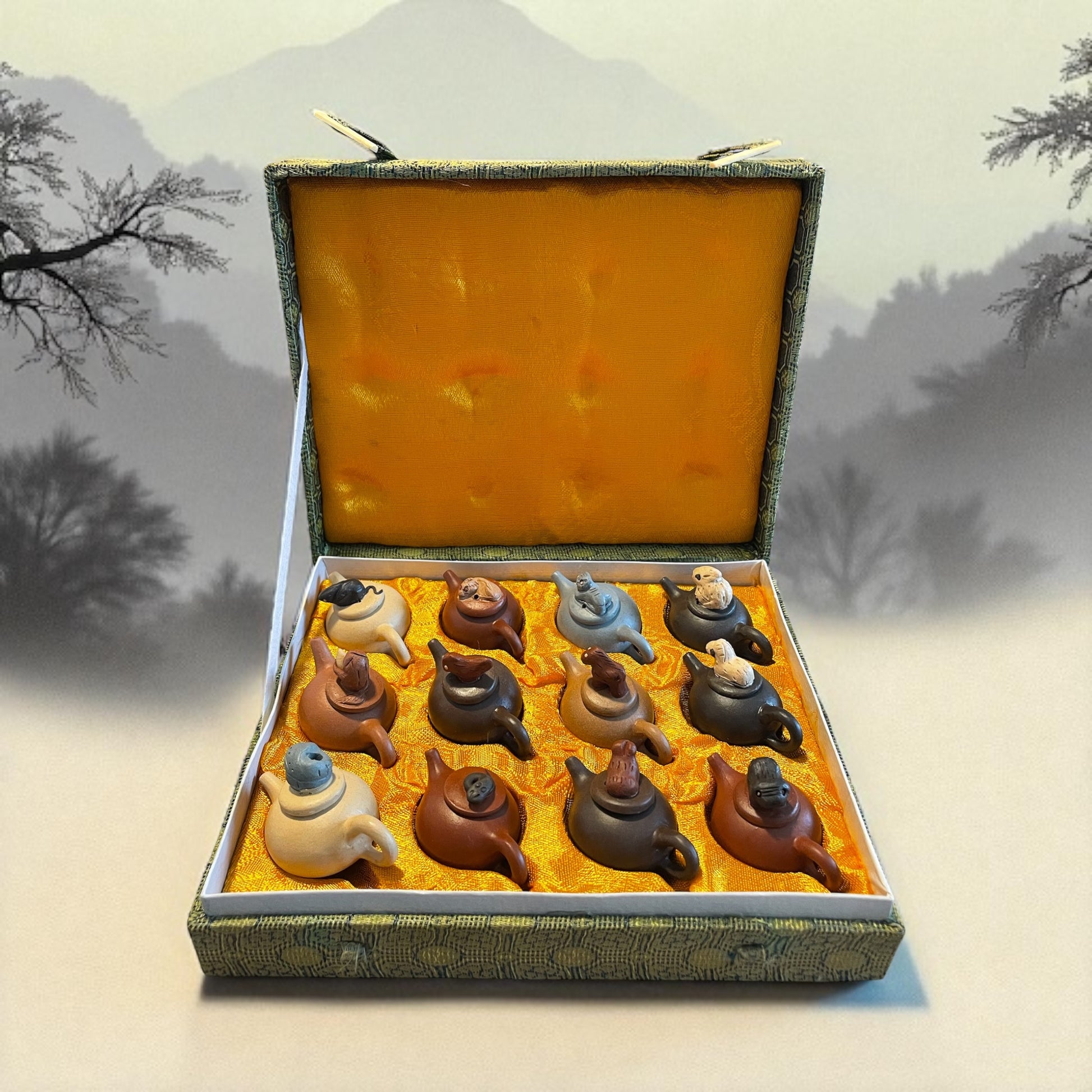 Collezione 12 mini teiere zodiaco cinese, argilla, in confezione tradizionale vintage