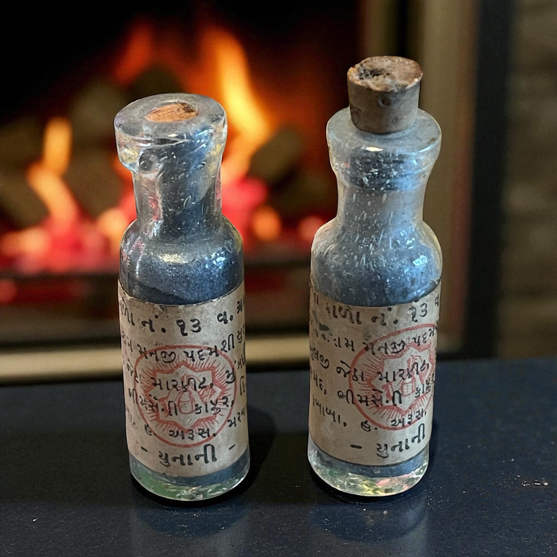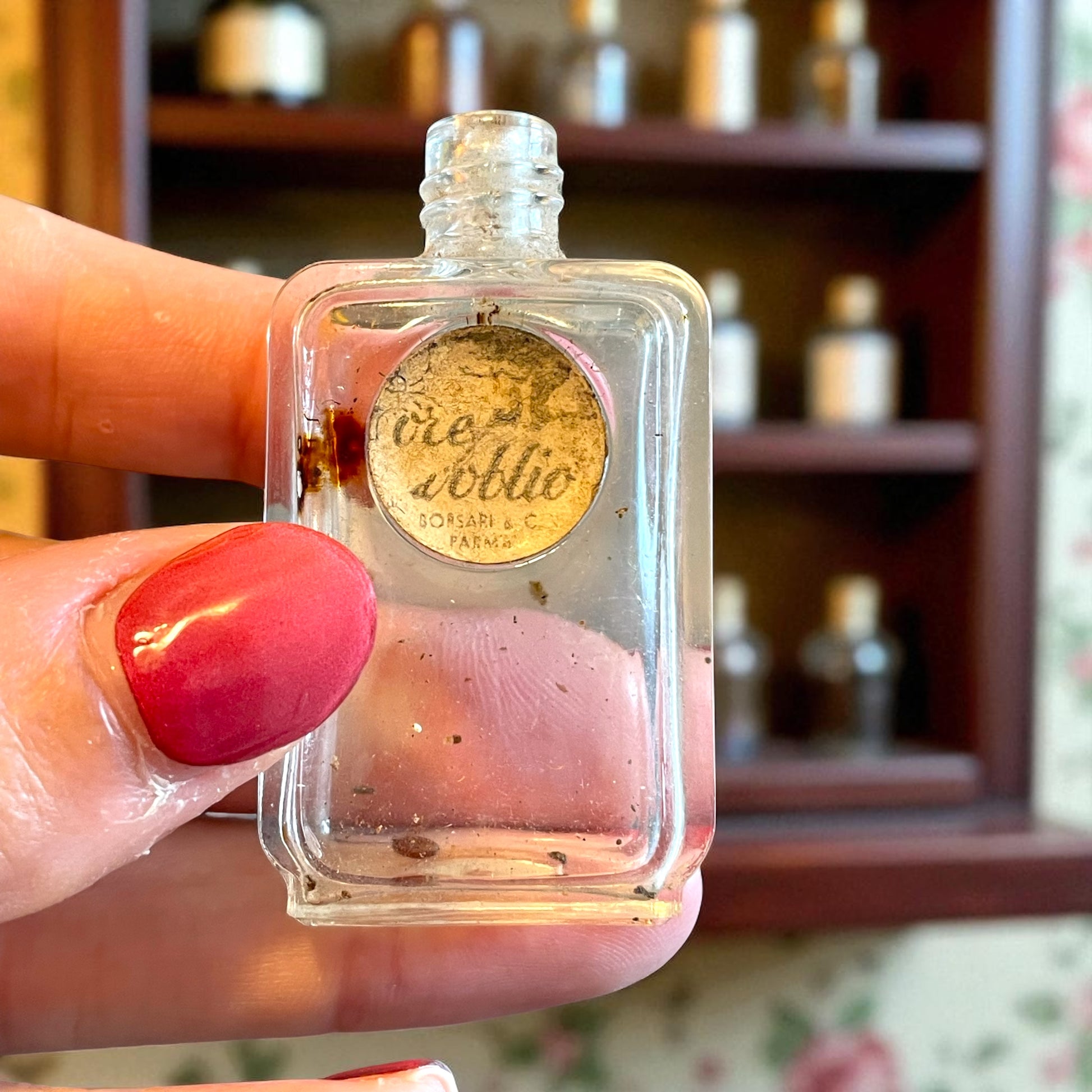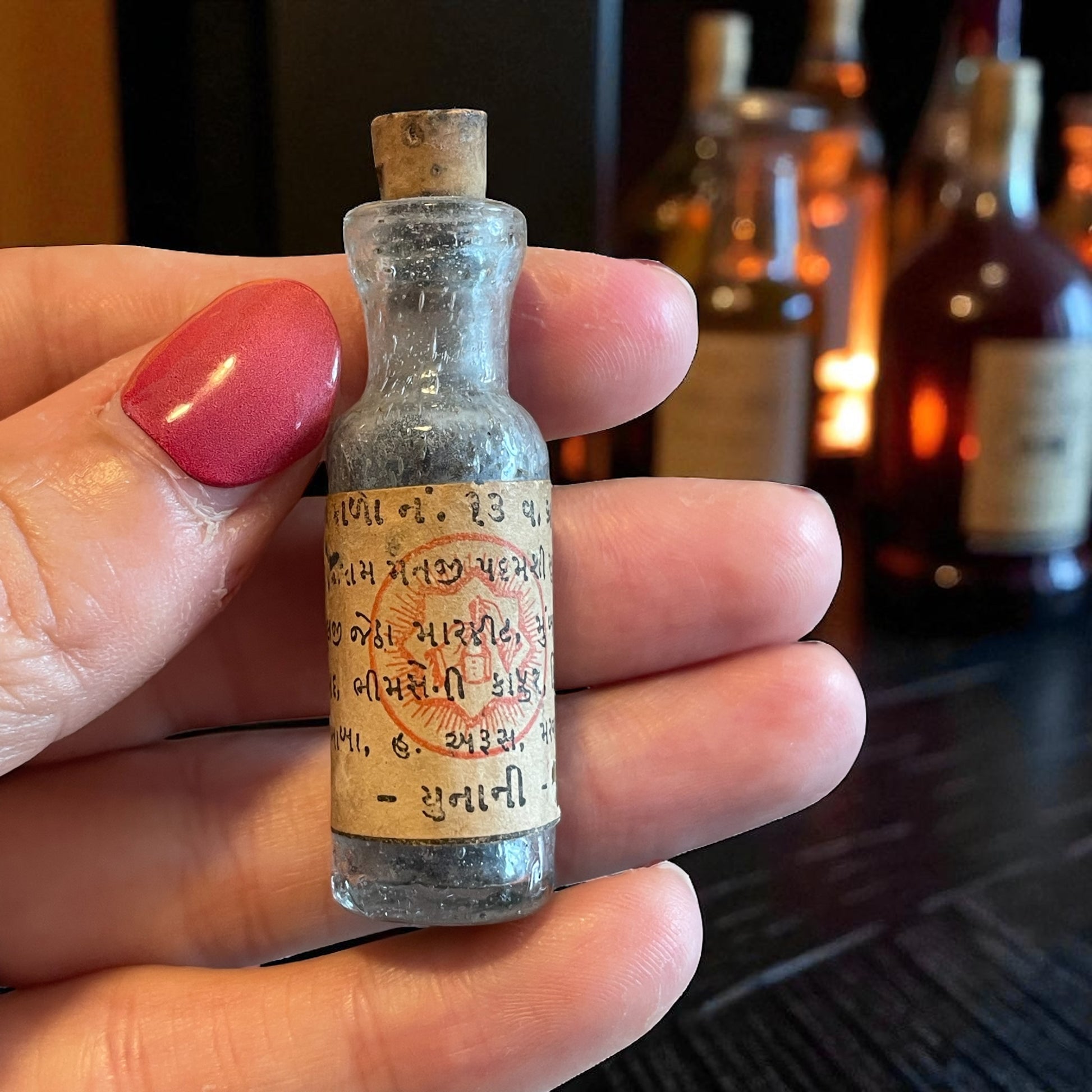 Un piccolo gruppo di bottigliette, ognuna con un frammento di storia da raccontare: profumi dimenticati, rimedi di antiche farmacie, misteriosi elisir d’Oriente e perfino un residuo d’olio sacro. Una collezione che attraversa confini e culture, perfetta da custodire in una bacheca come un cabinet delle meraviglie in miniatura. Bottiglietta “Olivon”: farmaceutico italiano della prima metà del ’900 usato come emolliente. Bottigliette con etichetta in gujarati (India): dal testo si distinguono le parole “Maruti” (dio Hanuman, simbolo di forza e guarigione) e “Yunani”, riferimento alla medicina Unani, antica tradizione greco-araba arrivata in India nel Medioevo e ancora praticata nel ’900. Rimedi erboristici per disturbi generici. Bottiglietta “Cré d’Oblio – Borsari & C. Parma”: celebre casa Borsari di Parma, attiva dal 1870 e famosa in tutto il mondo. Bottiglietta “Mephisto”: preparato farmaceutico italiano dei primi del ’900, digestivo o tonico. Bottiglietta con residuo giallo: olio, ormai scurito dal tempo, destinato a lampade votive.